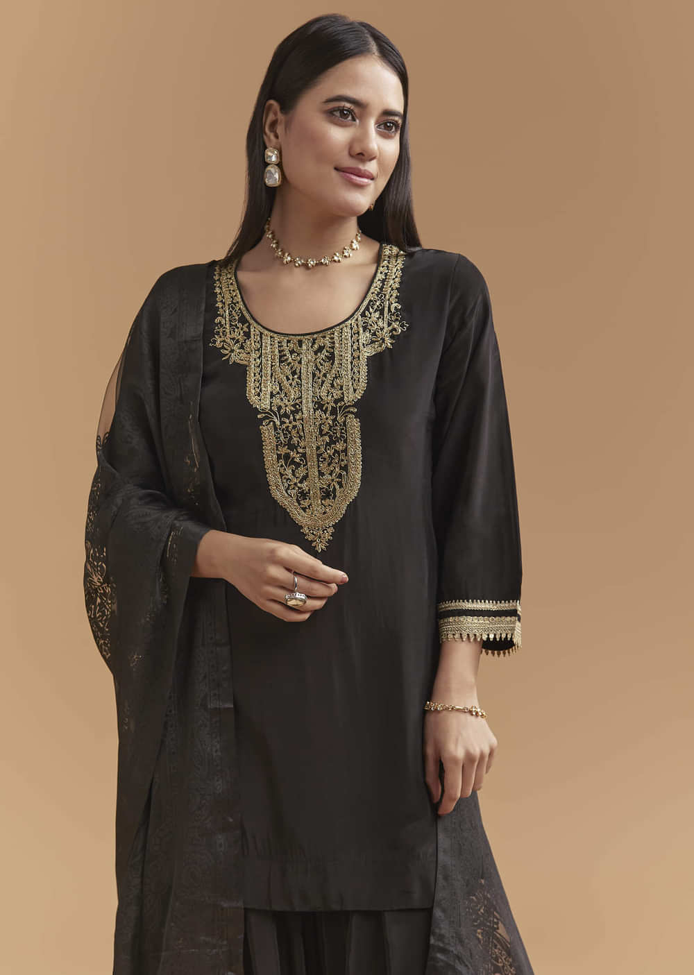 Designed for long evenings, this black crepe kurta set pairs a structured drape with detail that reads luxe up close. Zardosi enriches the kurta, while gota trims the sleeves and... More Product Details