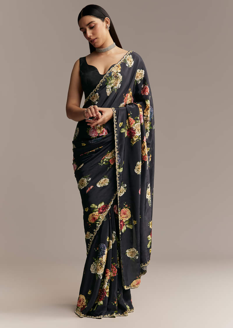 Sophisticated and stunning, this black crepe saree is printed with vibrant florals and edged with a scalloped border embroidered with sequins and cutdana. A fresh take on florals after dark.... More Product Details