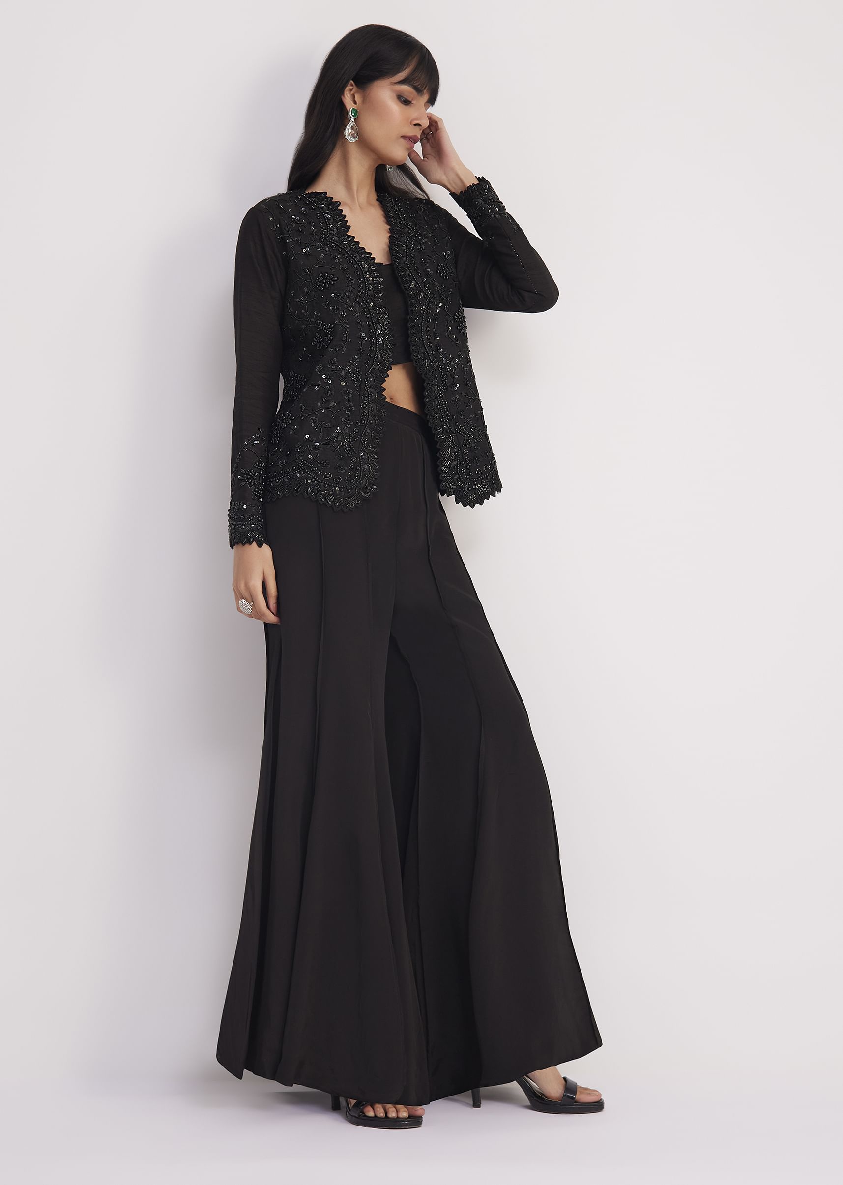 A sleek party set with a solid crop top heavily embellished jacket with cut dana and sequins and a flared satin palazzo. Ideal for turning heads at evening celebrations. Awarded... More Product Details