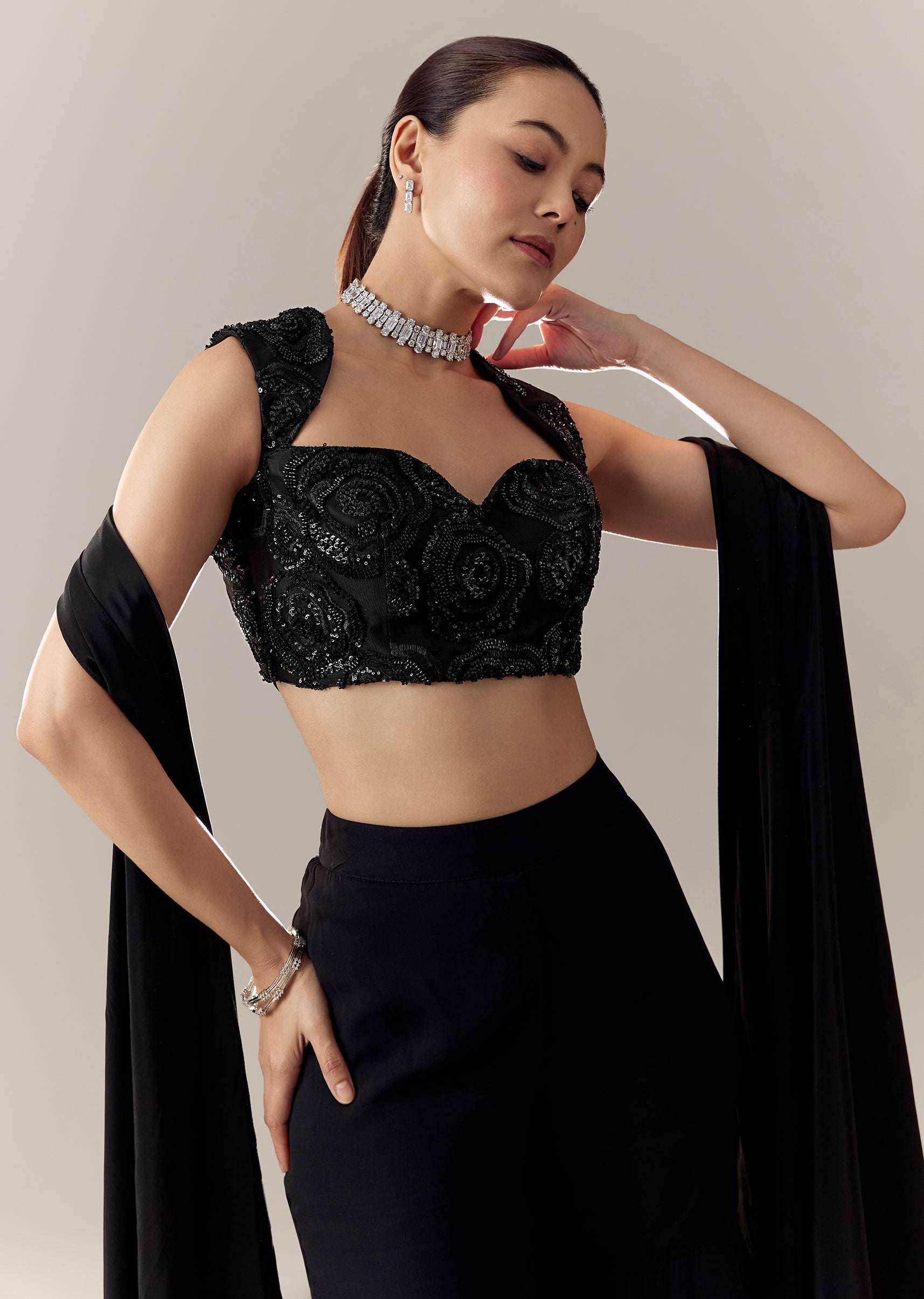 A Milano blouse with a fancy neckline, broad shoulder cut, cut-dana work, and adjustable dori at the back—perfect for party sarees. Awarded as the Most Trusted Brand, we're delivering styles you love, just as promised.