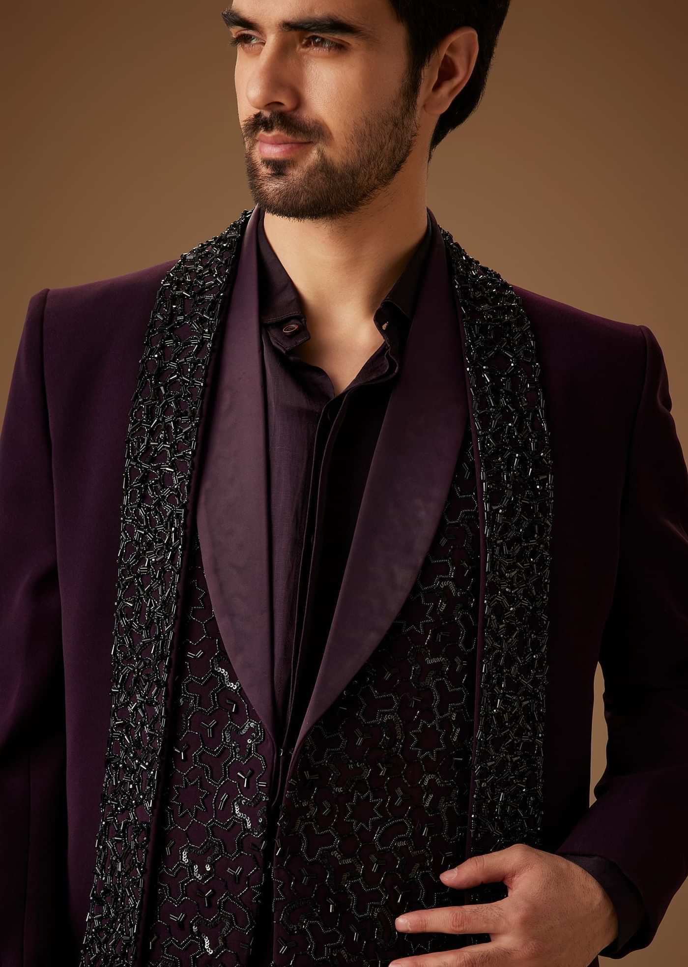 This Indo Western Tuxedo Exudes A Seamless Blend Of Tradition And Modernity Crafted In Rich Suiting Fabric With A Refined Cotton Satin Base. Intricate SelfOnSelf Embroidery With Cut Dana Crystals... More Product Details