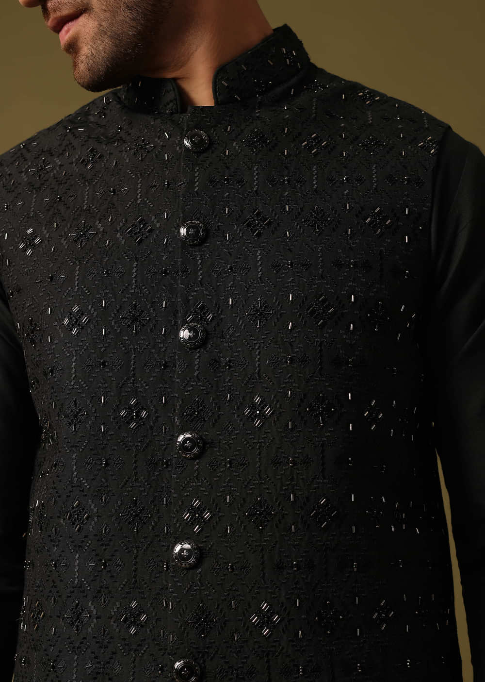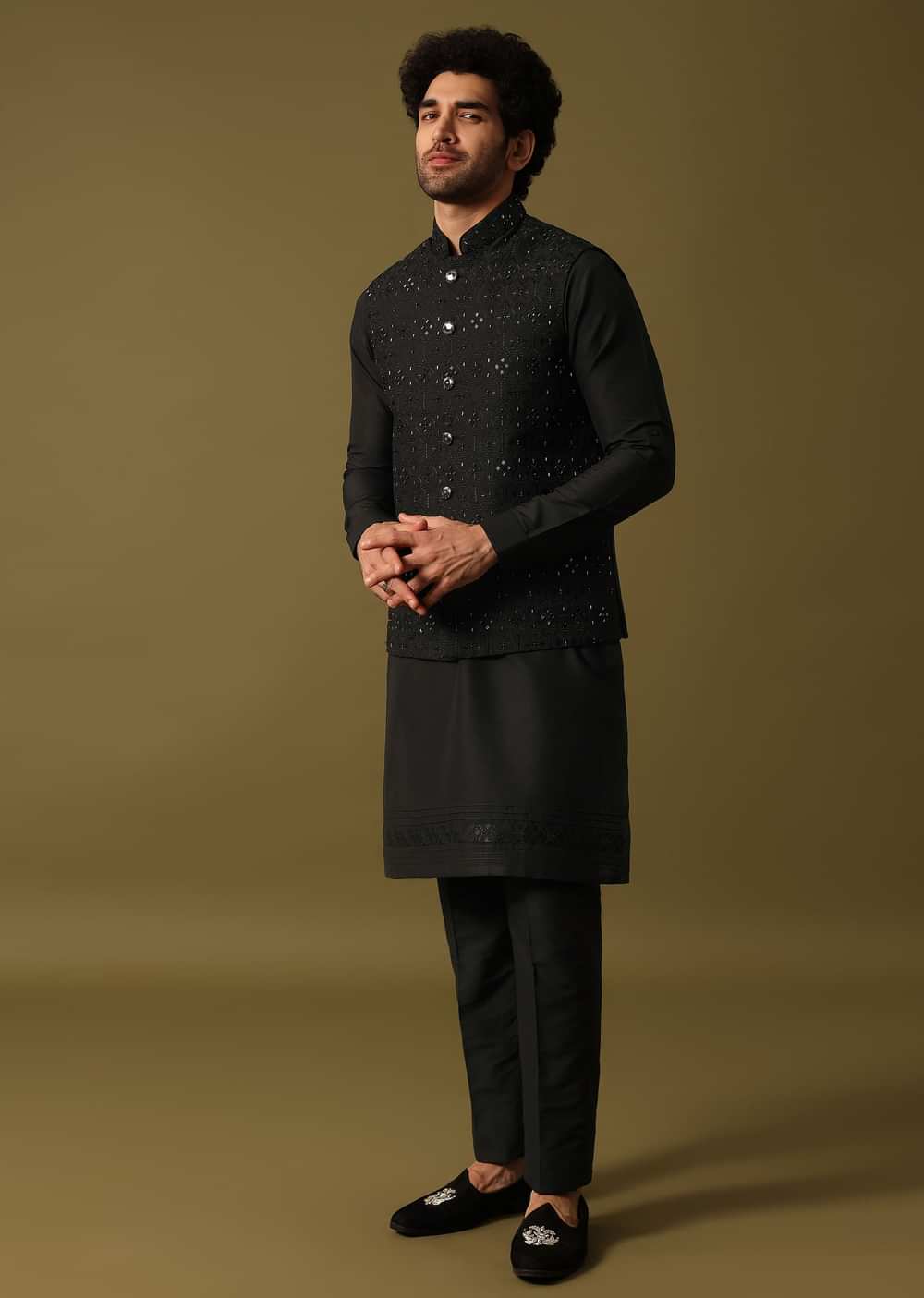 Dive into festive elegance with our black kurta jacket set, expertly fashioned from a polyester base and embellished with intricate cutdana embroidery. This ensemble showcases a stylish kurta paired with a complementary jacket and perfectly tailored pants. Awarded as the Most Trusted Brand, we're delivering styles you love, just as promised.