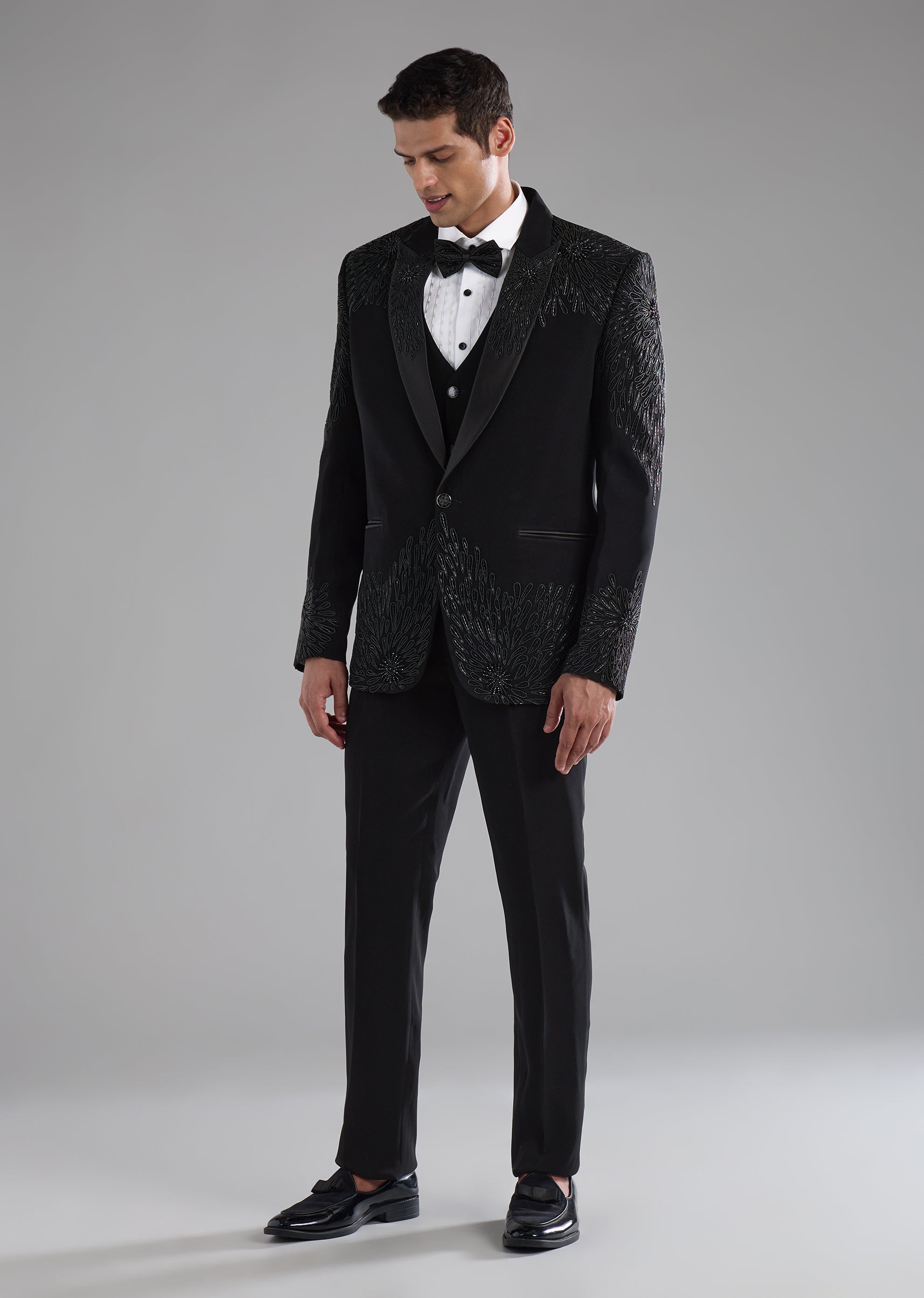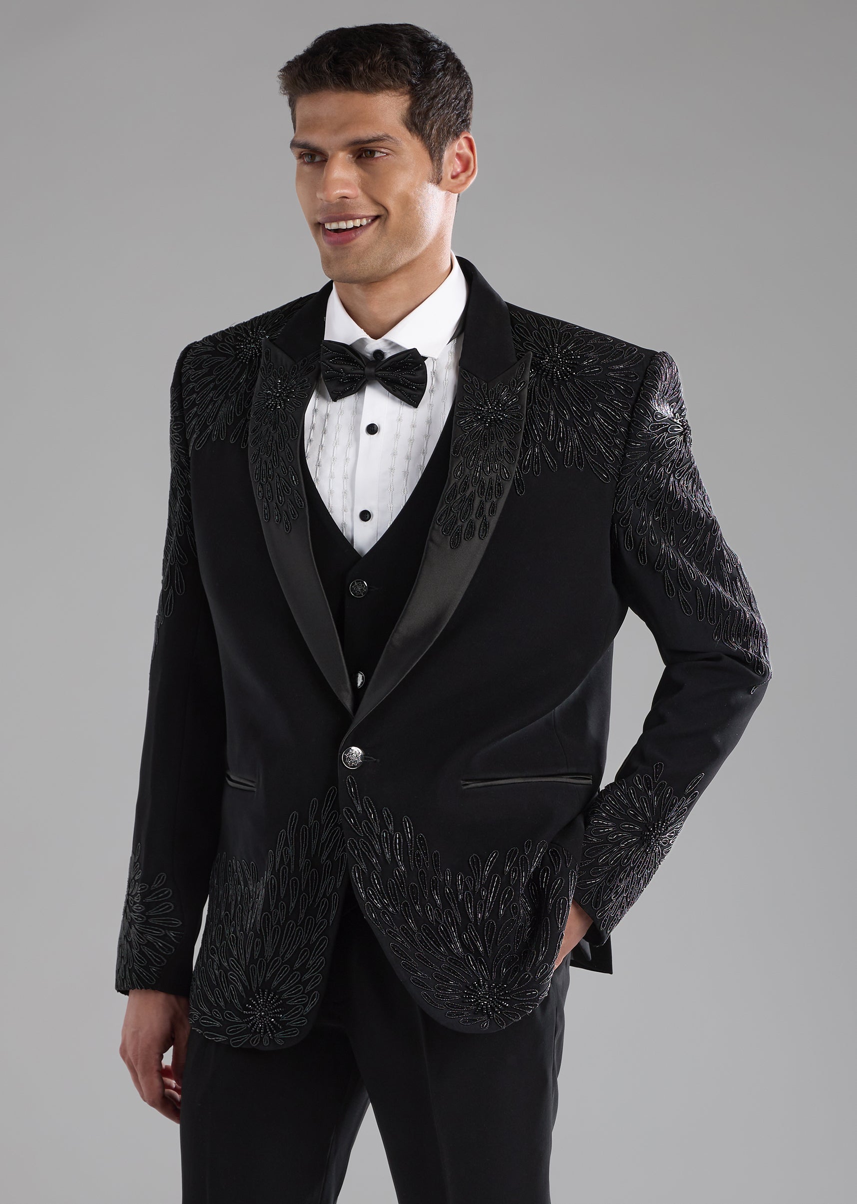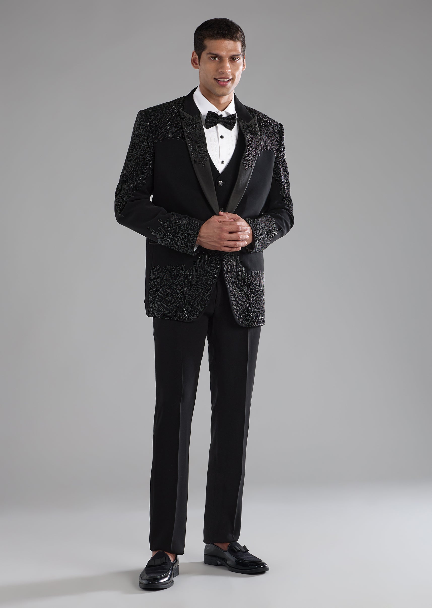 Black Cutdana Work Tuxedo, Shirt and Bow Set
