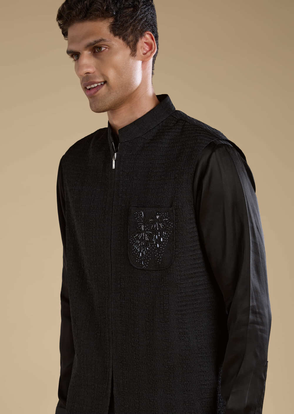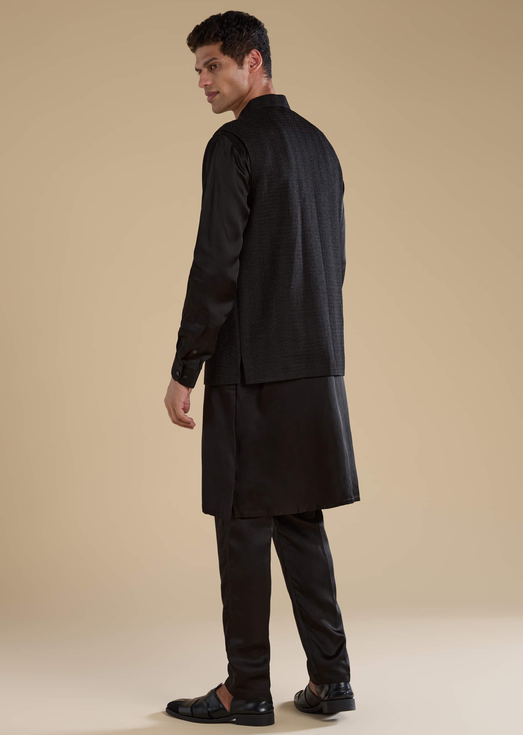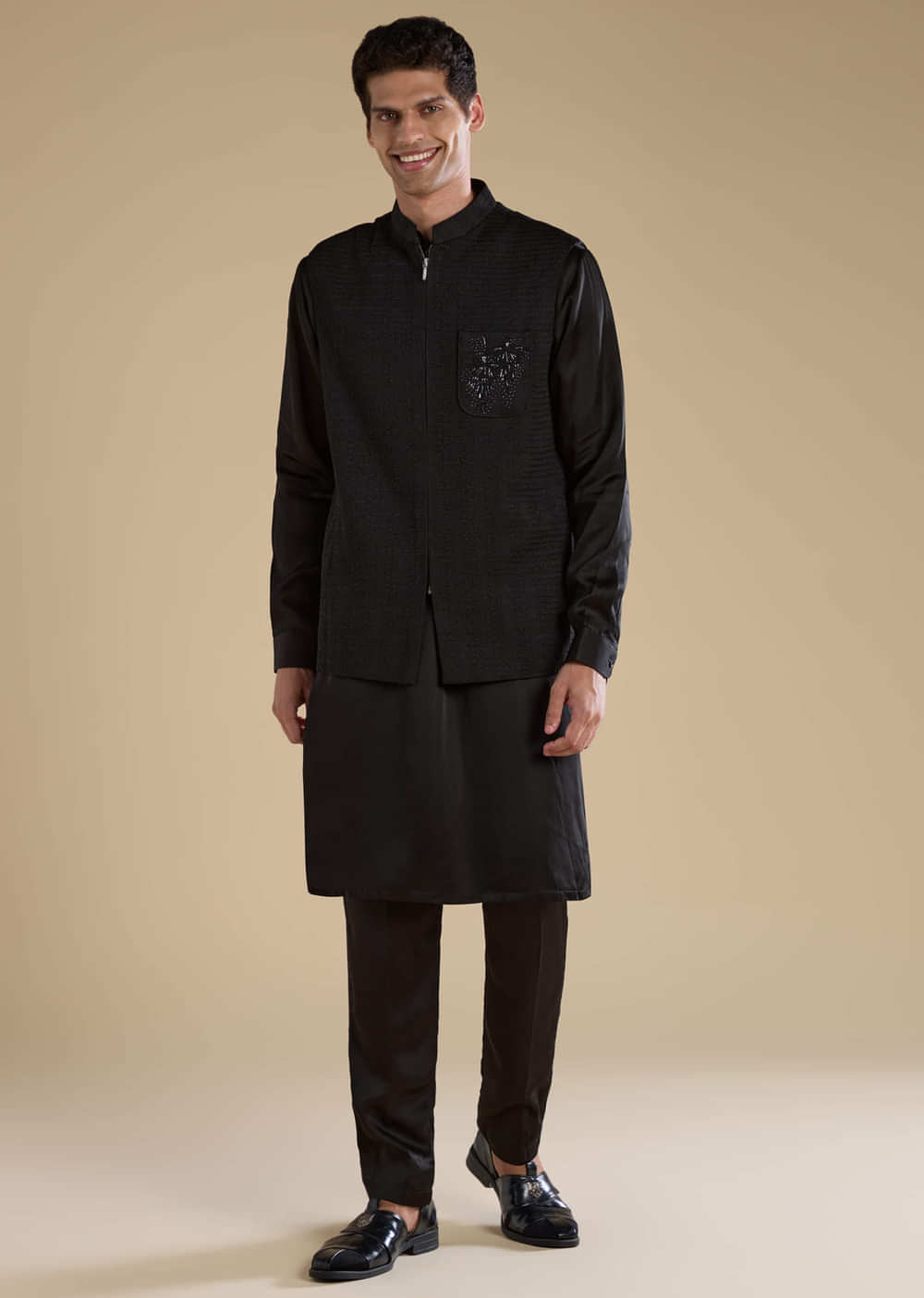 Black Cutwork Mens Jacket Kurta and Pant Set