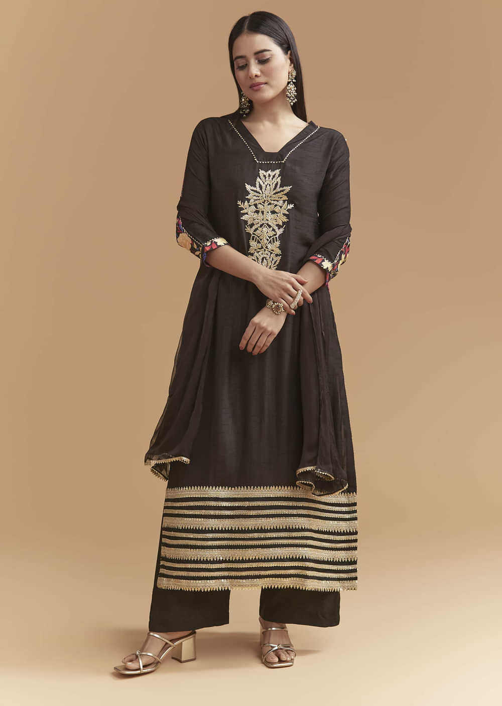 Black Dola Silk Kurta Set With Gota Work And Floral Print