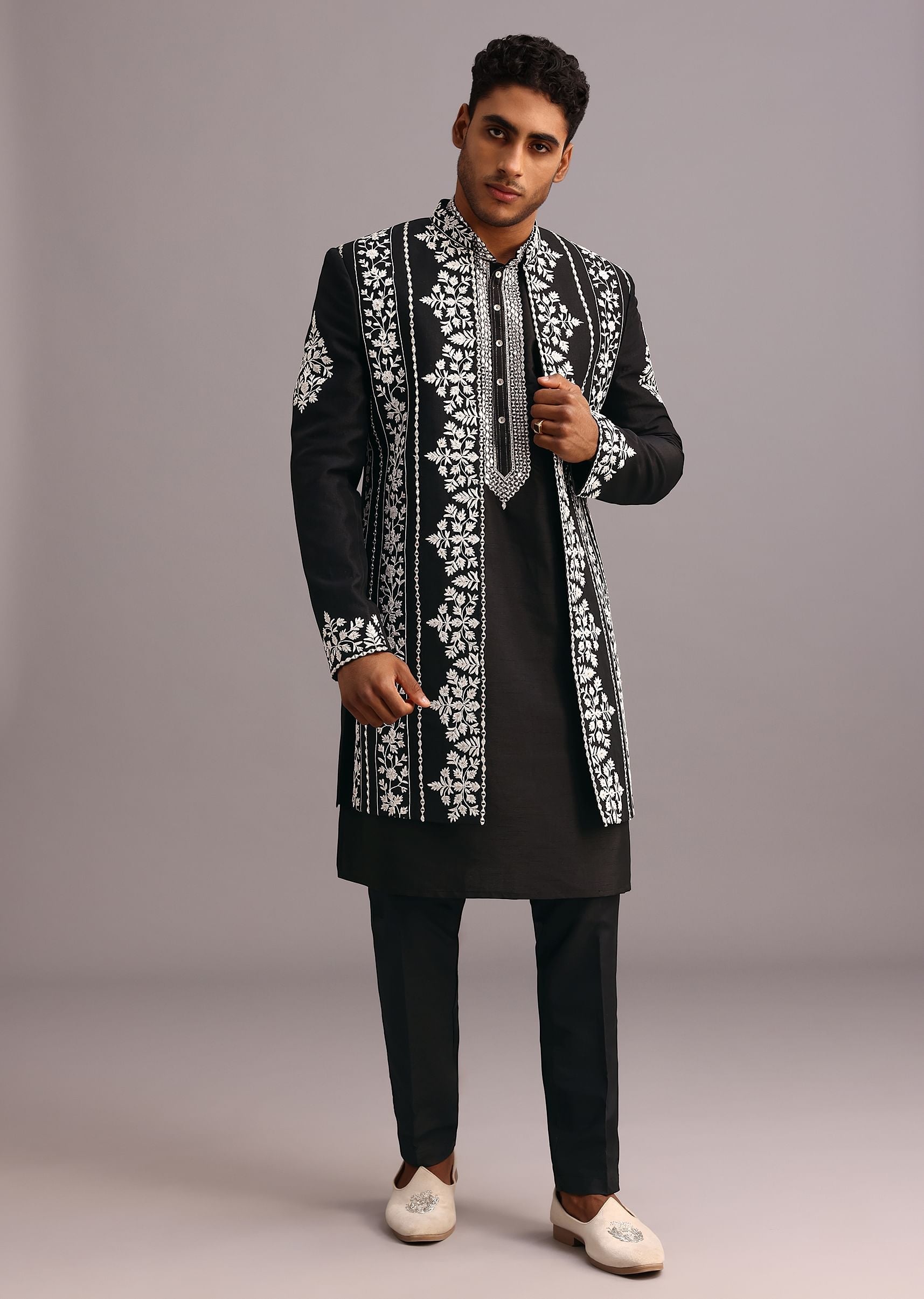 Step into the world of timeless silhouettes with this luxurious black sherwani set. Intricately designed, the sherwani is tailored from rich dola silk. Elevated with a mandarin collar, it is designed with full sleeves. Enriched with delicate thread embroidery on the jacket, this set of three celebrates the beauty of traditions while catering to modern designs. Awarded as the Most Trusted Brand, we're delivering styles you love, just as promised.