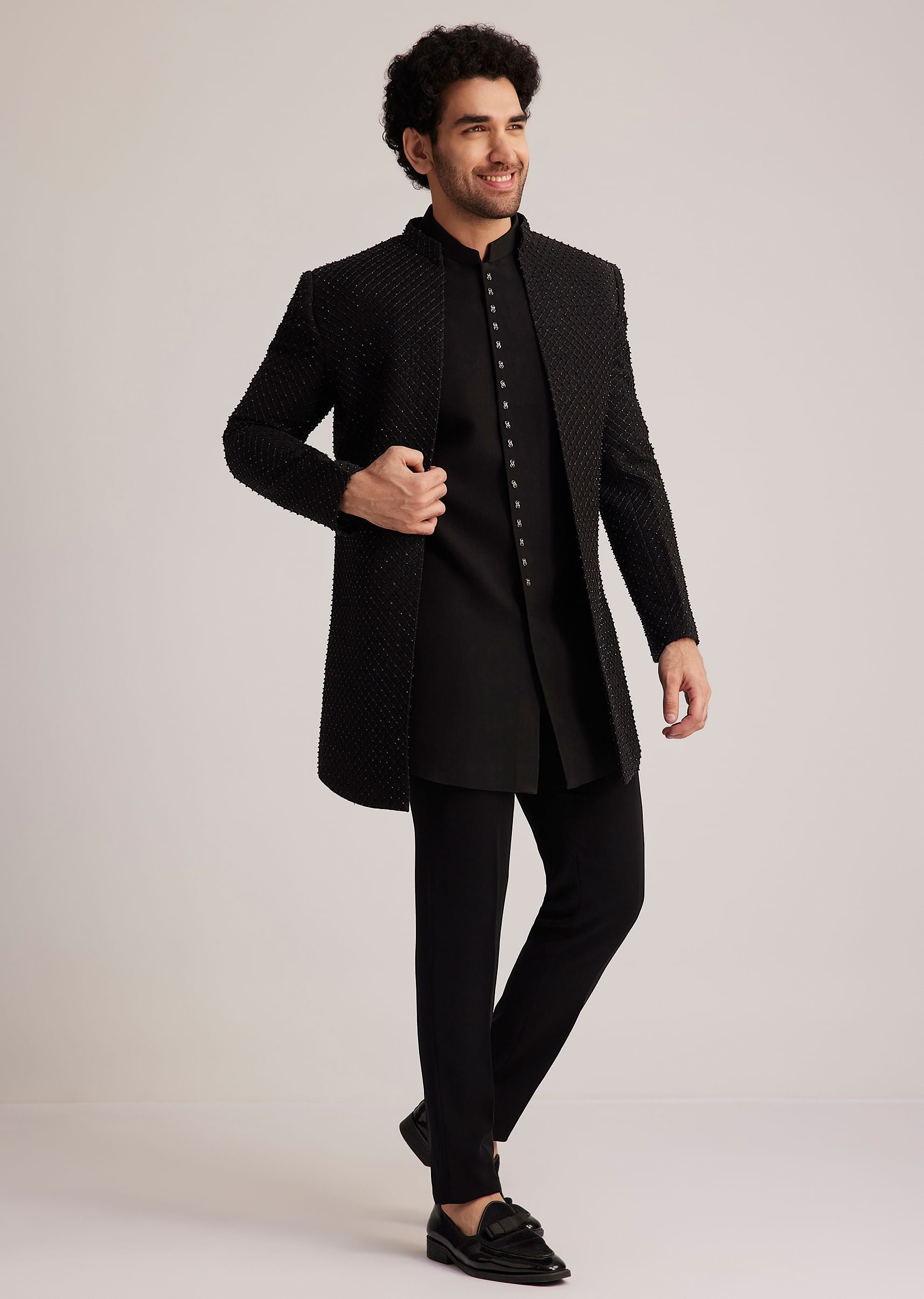 - Make a bold statement with this black indo-western suit, adorned with intricate bead embellishments that exude sophistication and glamour.