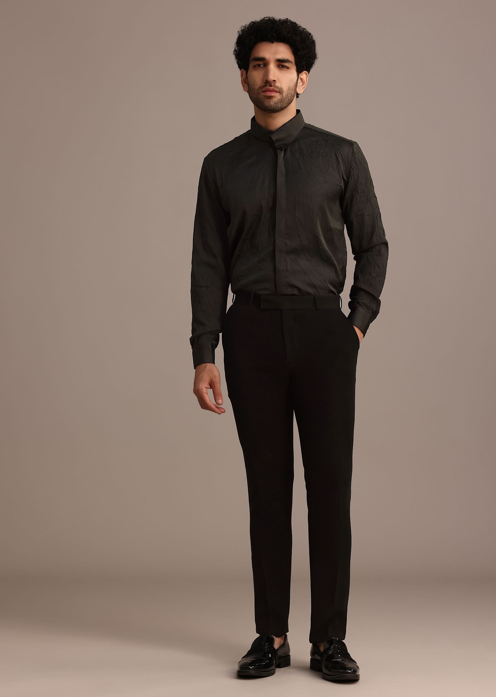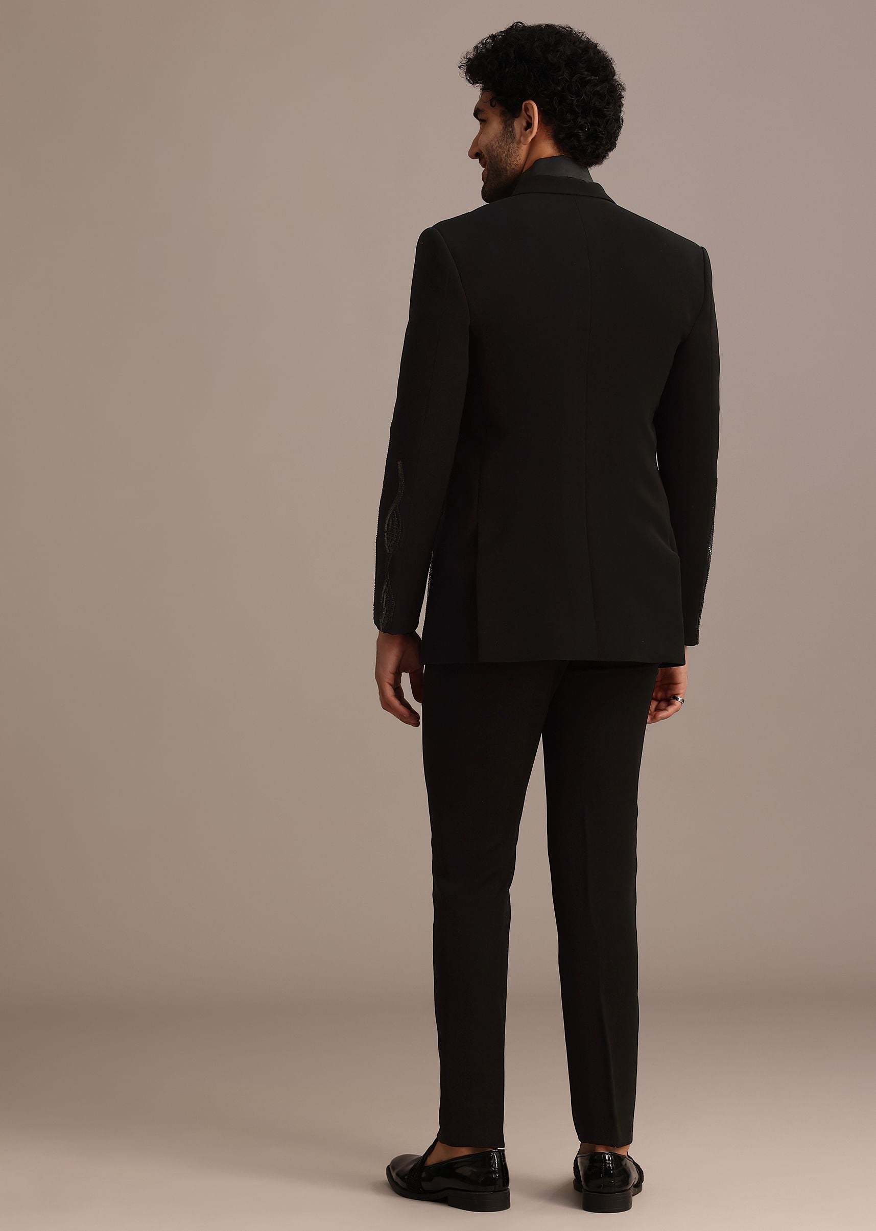 An ethereal style that will captivate attention at cocktail parties and wedding celebrations is this luxurious black tuxedo set. Offering a polished look, the tux is designed with a stylish notch collar. Adorned with placement hand embellished motifs, this set is complemented with a matching shirt and co-ordinating pants. Awarded as the Most Trusted Brand, we're delivering styles you love, just as promised.