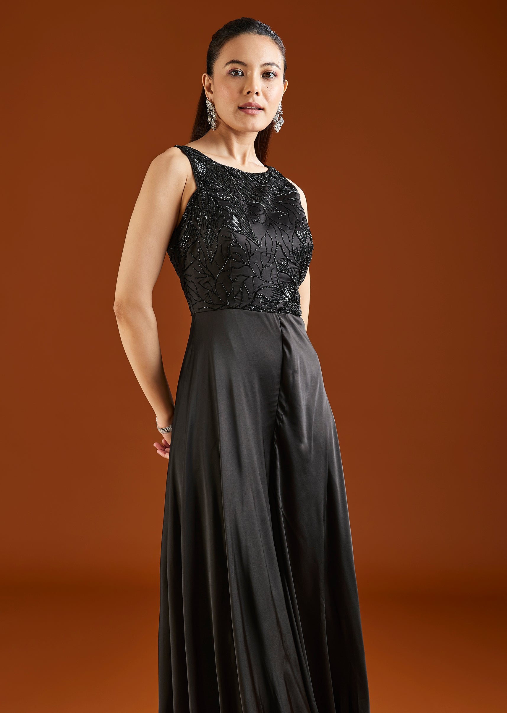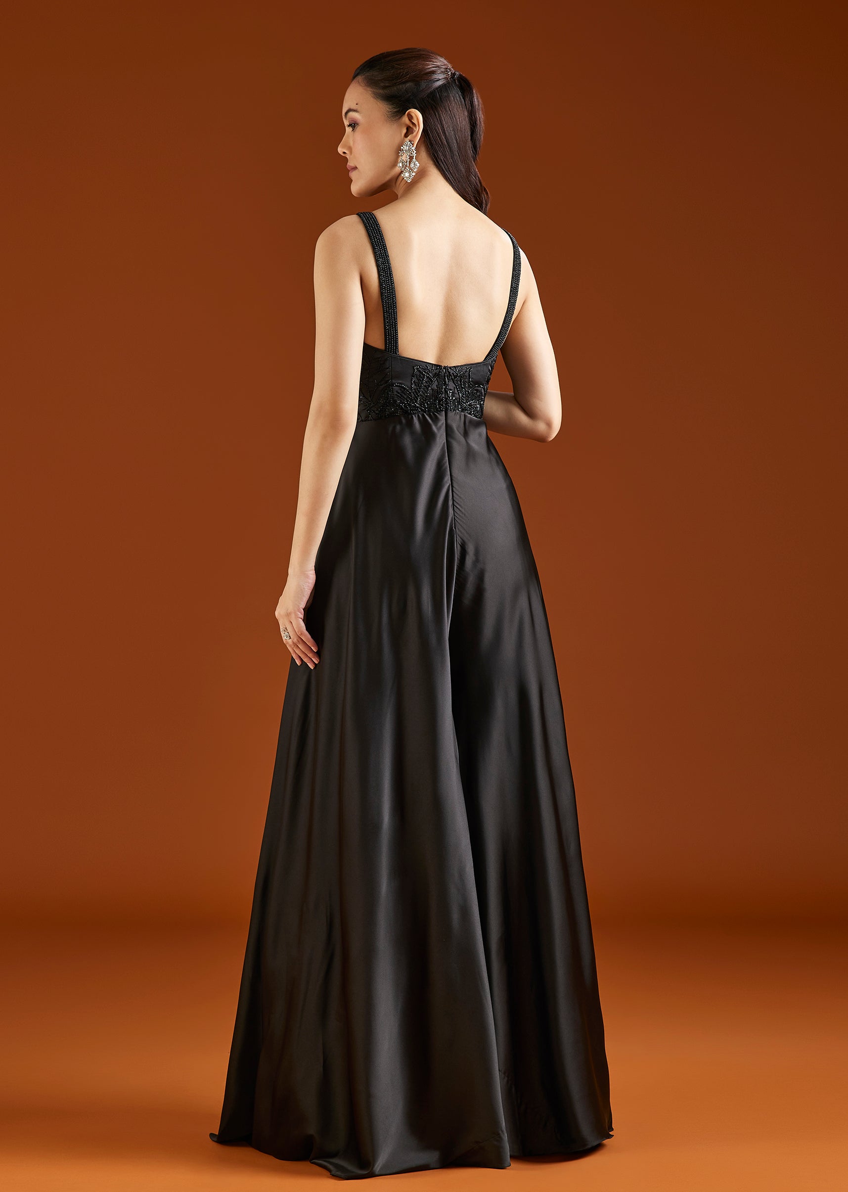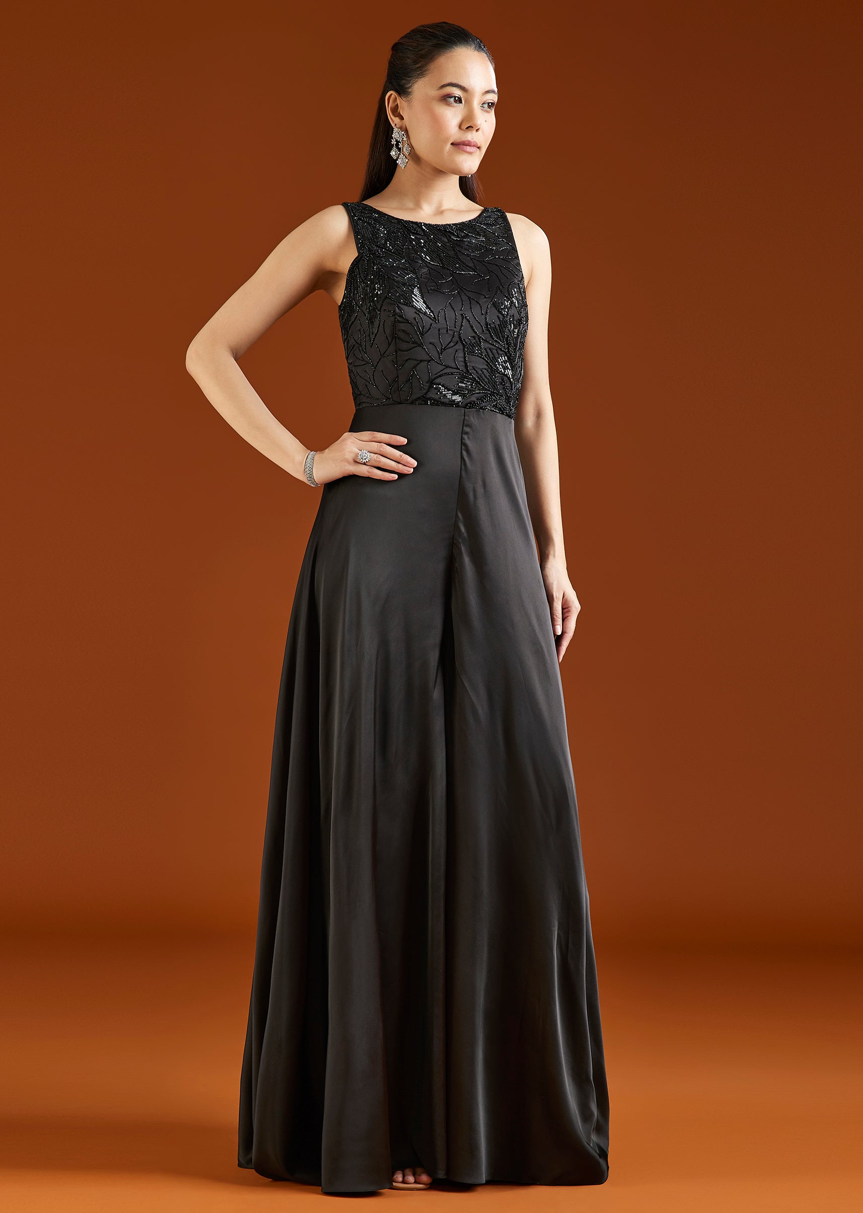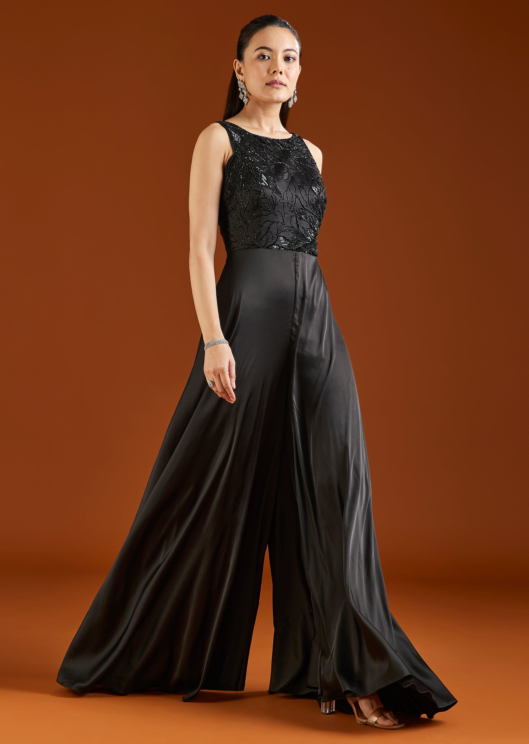 A sleek black jumpsuit crafted in satin, featuring delicate embellishments for a refined finish. Designed for cocktail and evening occasions, it offers a modern and effortless look. Awarded as the Most Trusted Brand, we're delivering styles you love,