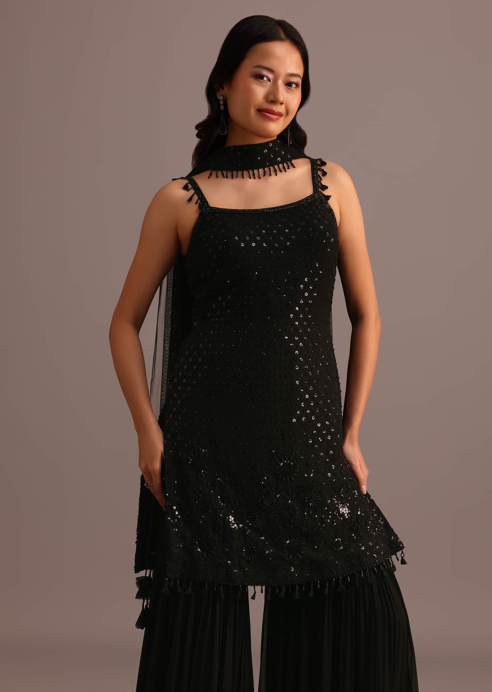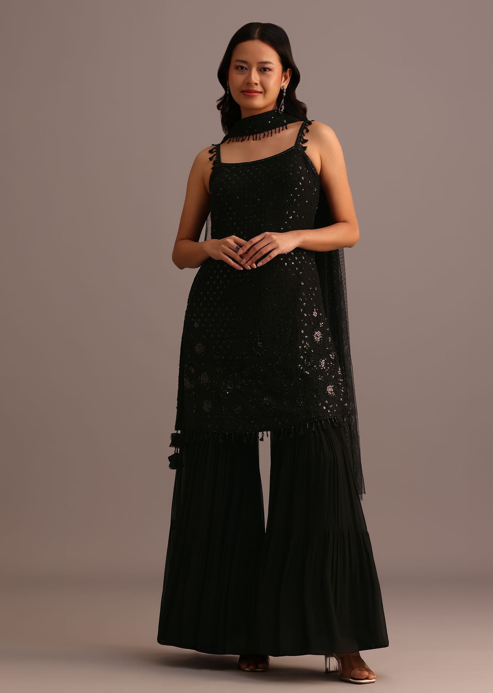 Black Embellished Sharara Suit With Net Dupatta Kalki
