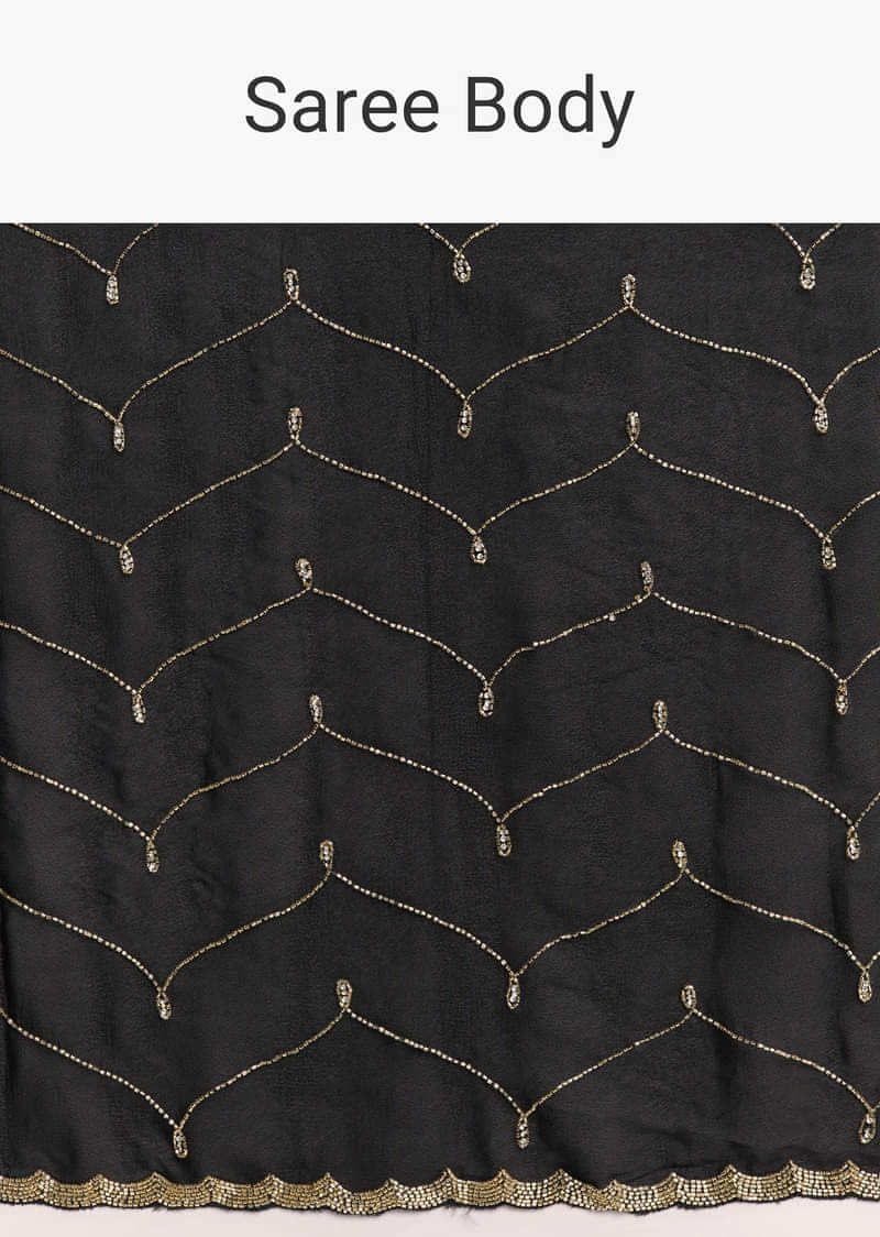 This elegant black chinon saree features a scalloped border and intricate embroidery with cut dana and stones throughout. Designed to shimmer subtly with every step. Awarded as the Most Trusted Brand, we're delivering styles you love, just as promised.