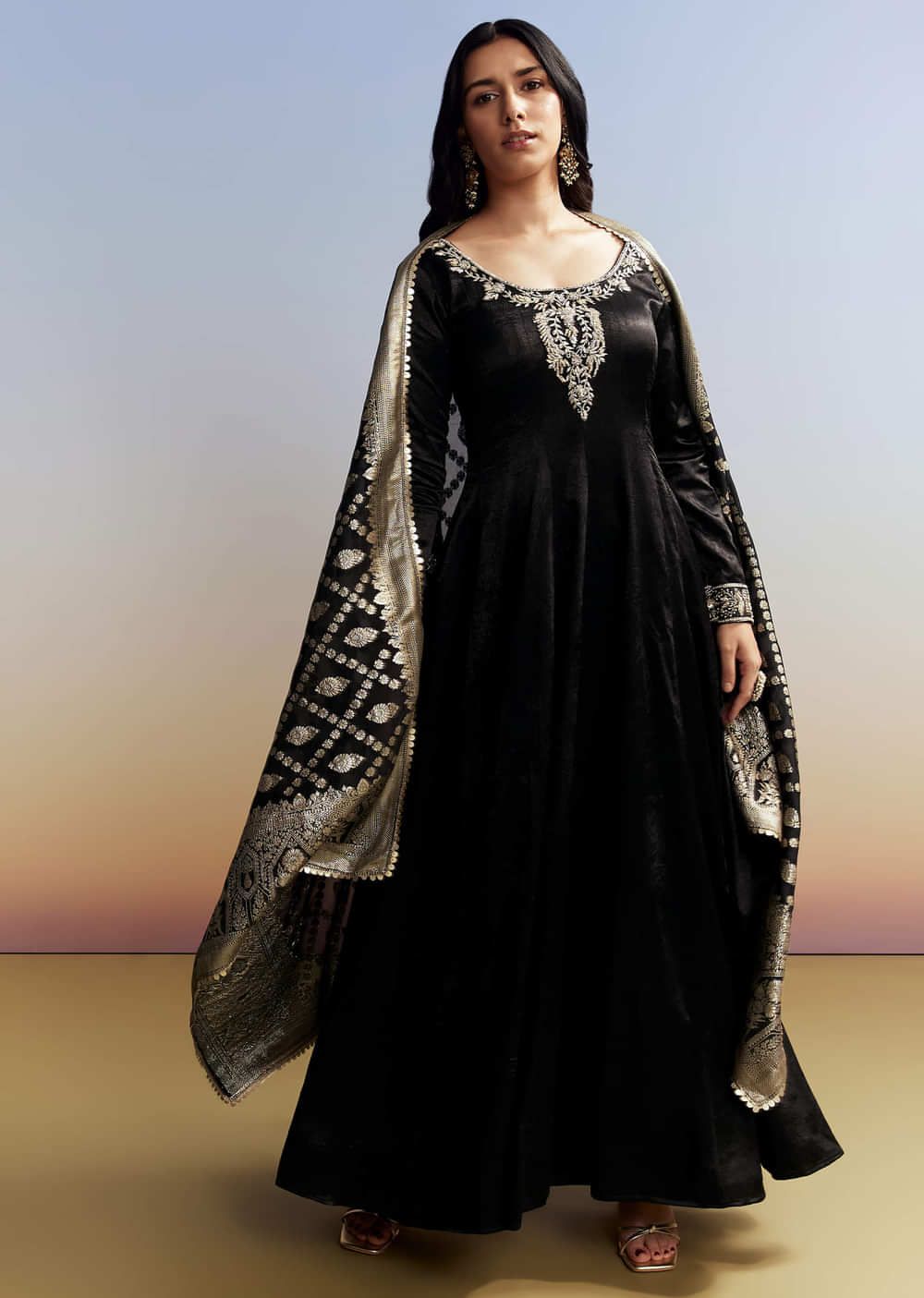 This elegant black anarkali set is all drama and grace, featuring crush satin that flows like a dream and a dupatta with a royal organza touch. It’s giving “mystery, moonlight,... More Product Details