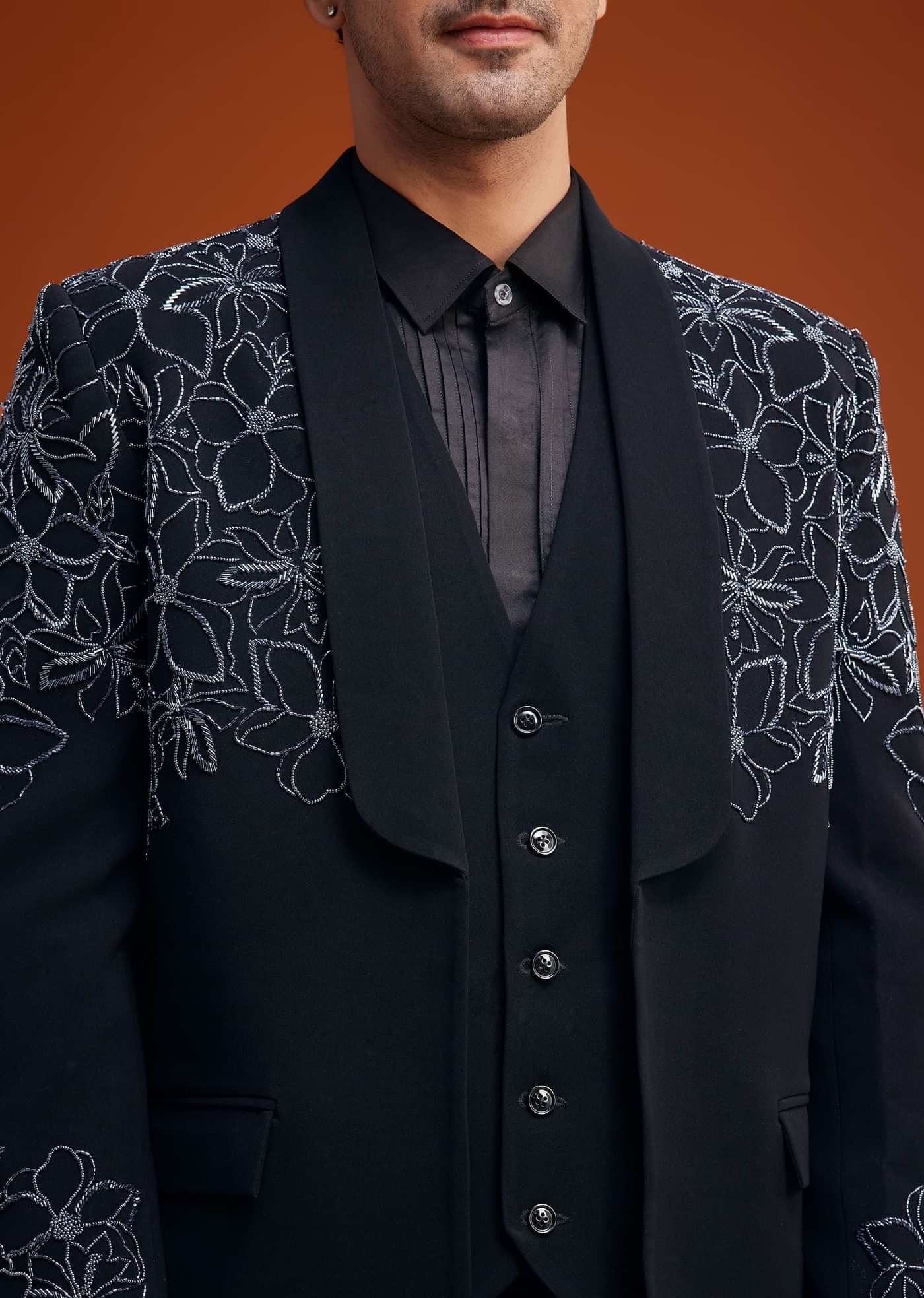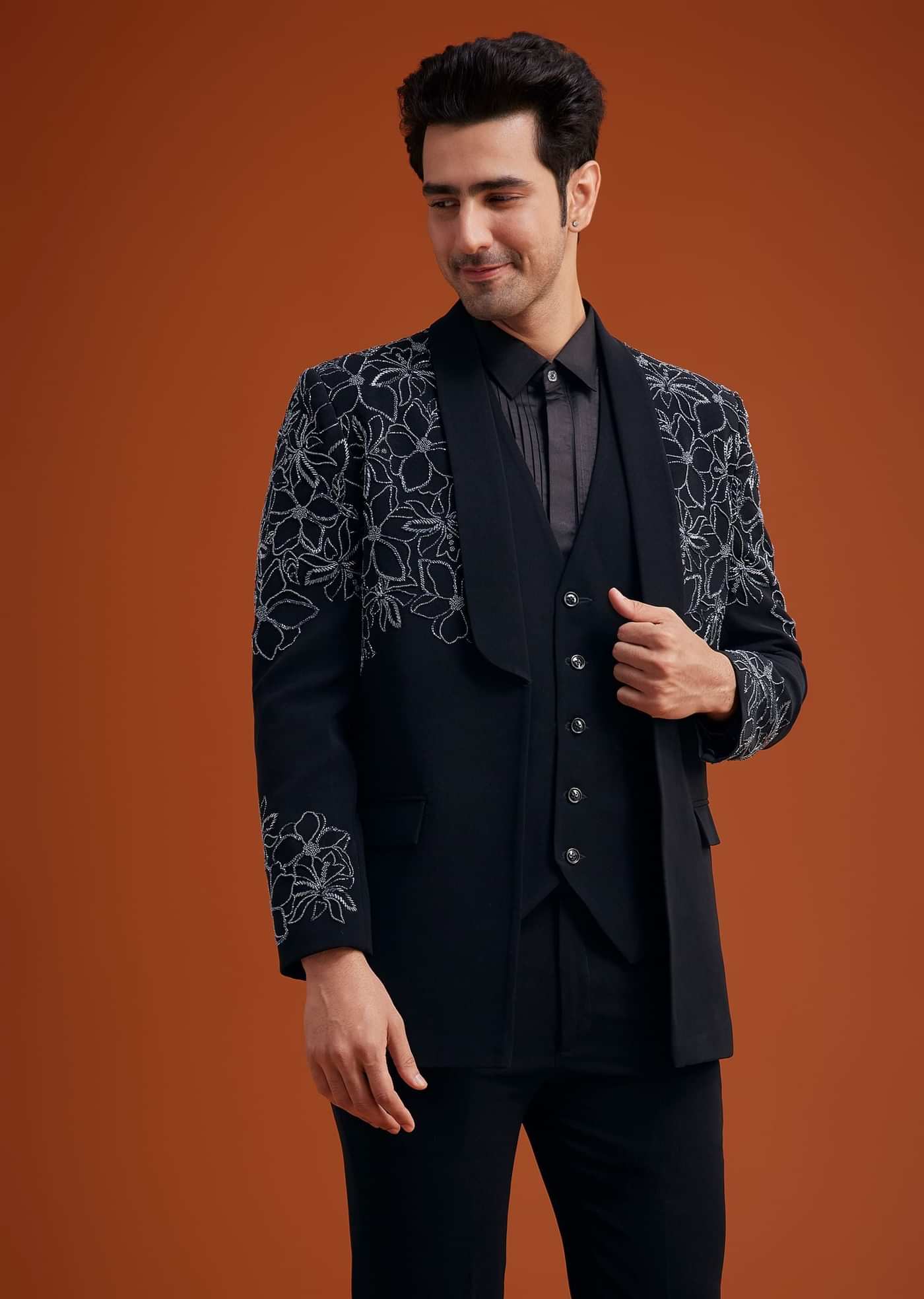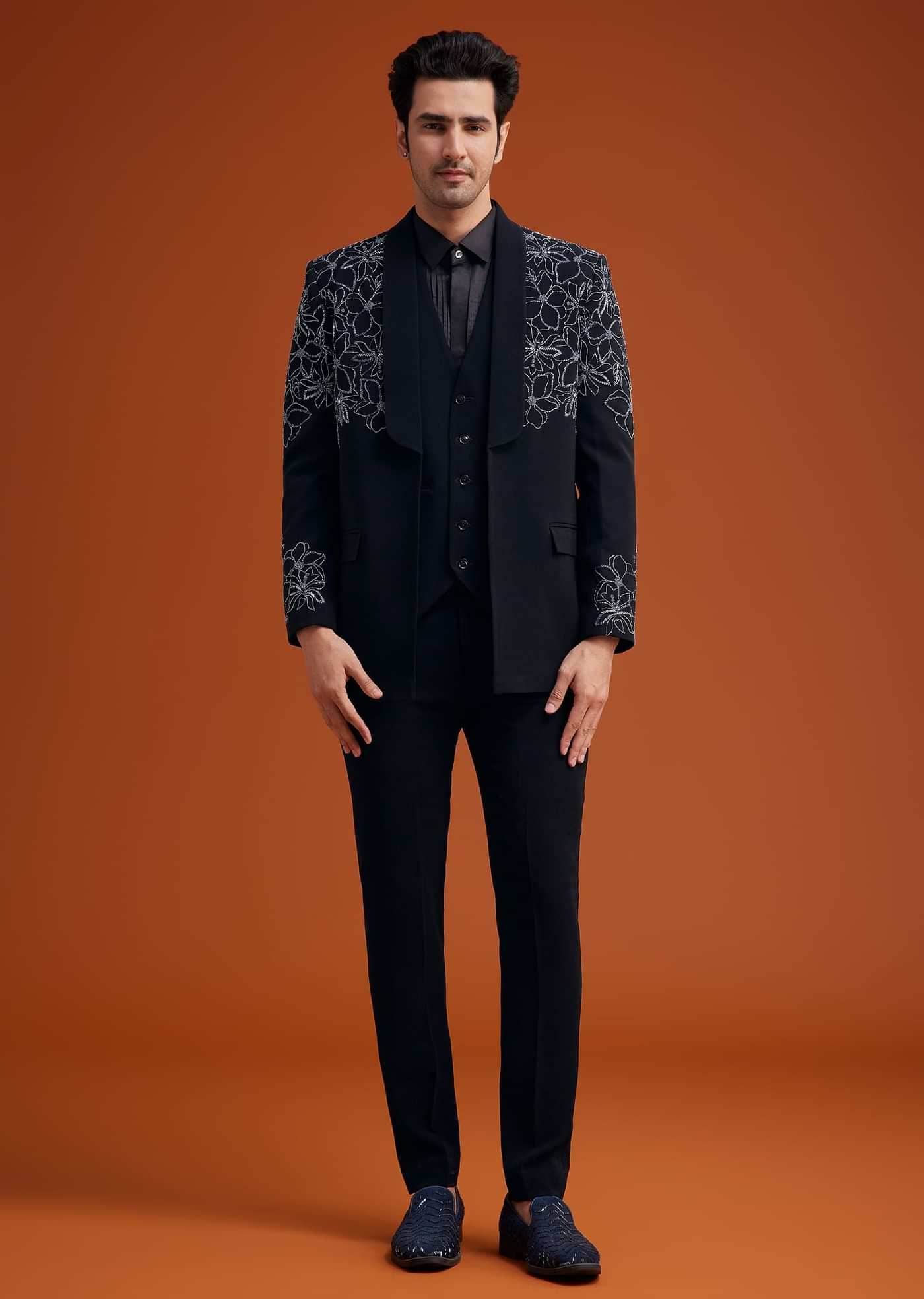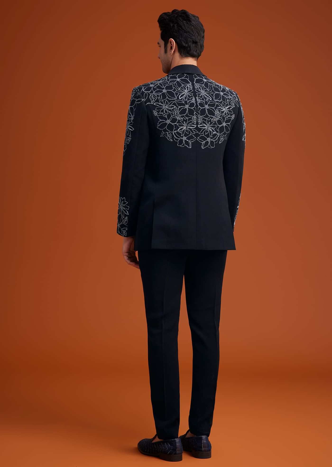 • This tailored black tuxedo exudes contemporary charm with its structured silhouette and refined detailing.