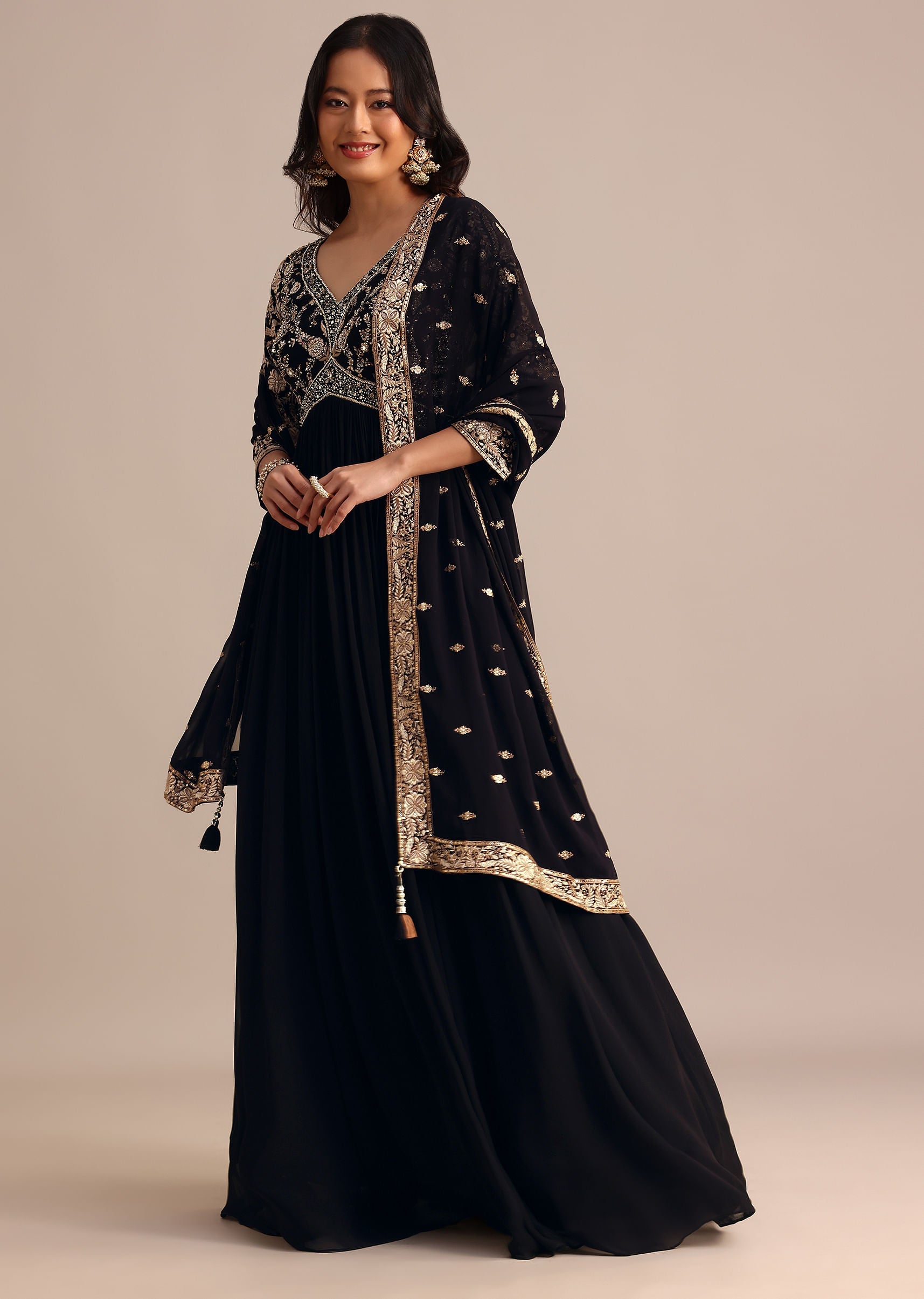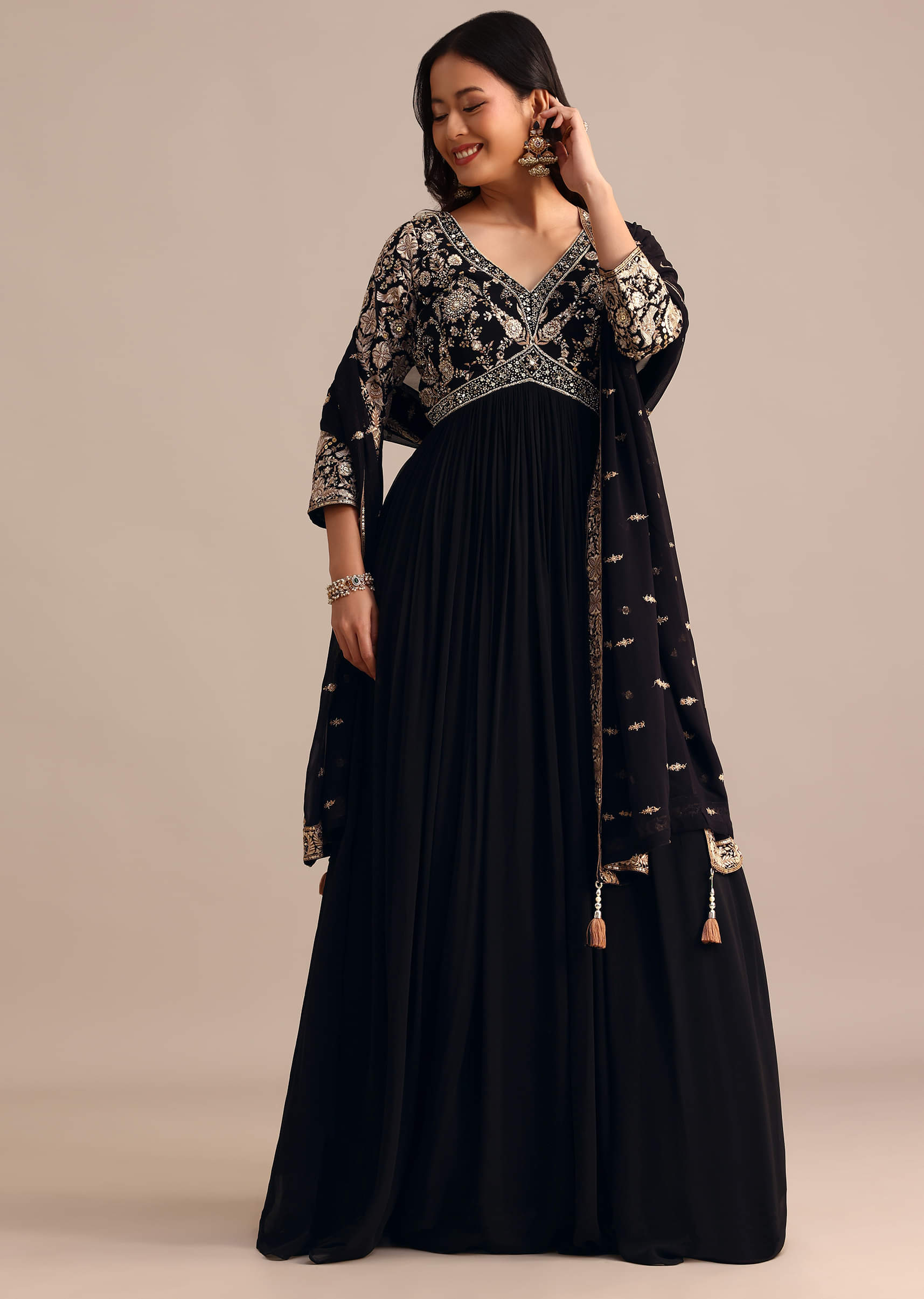 • Mesmerize the crowd in this stunning black anarkali set beautifully crafted from a rich georgette base.