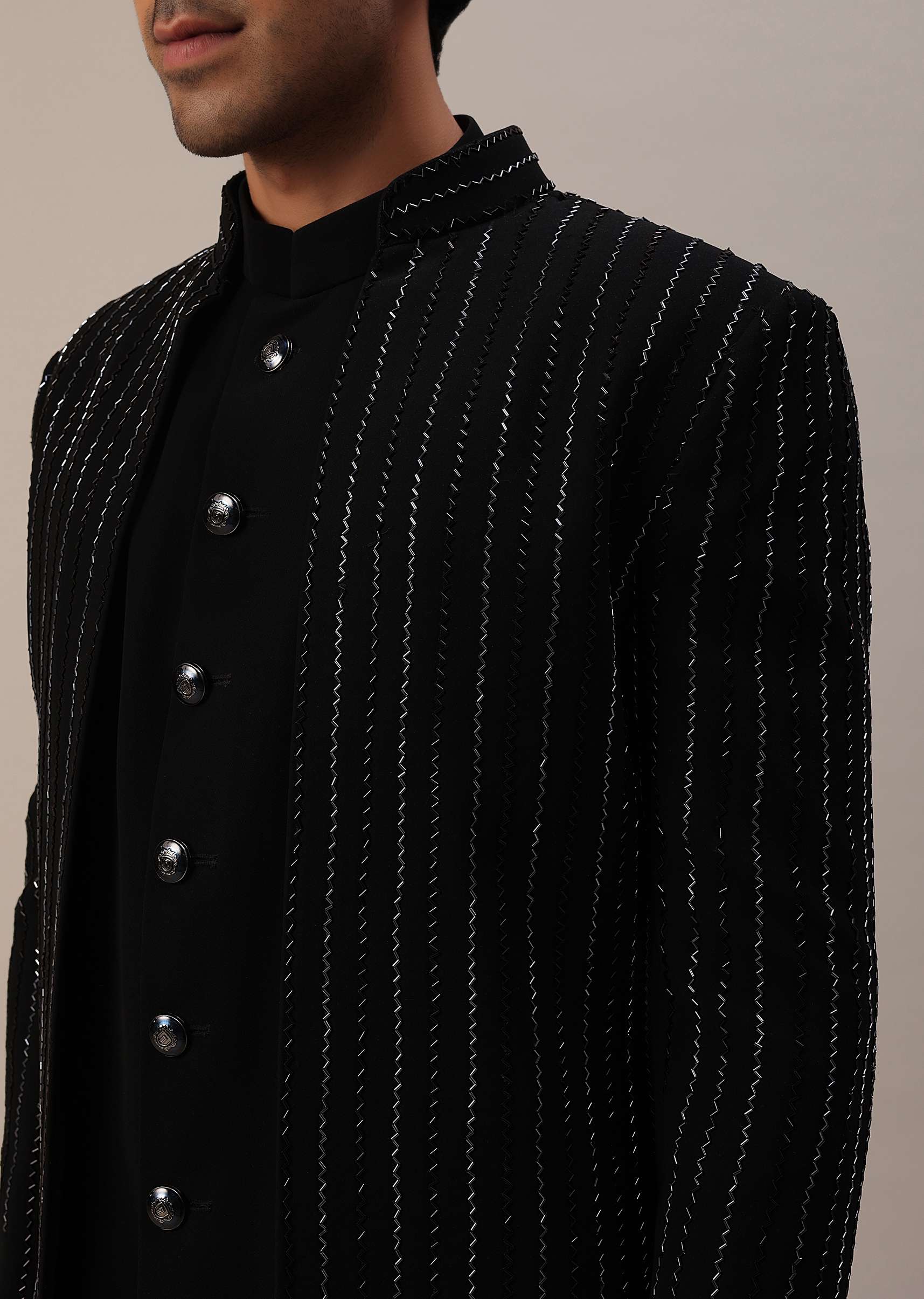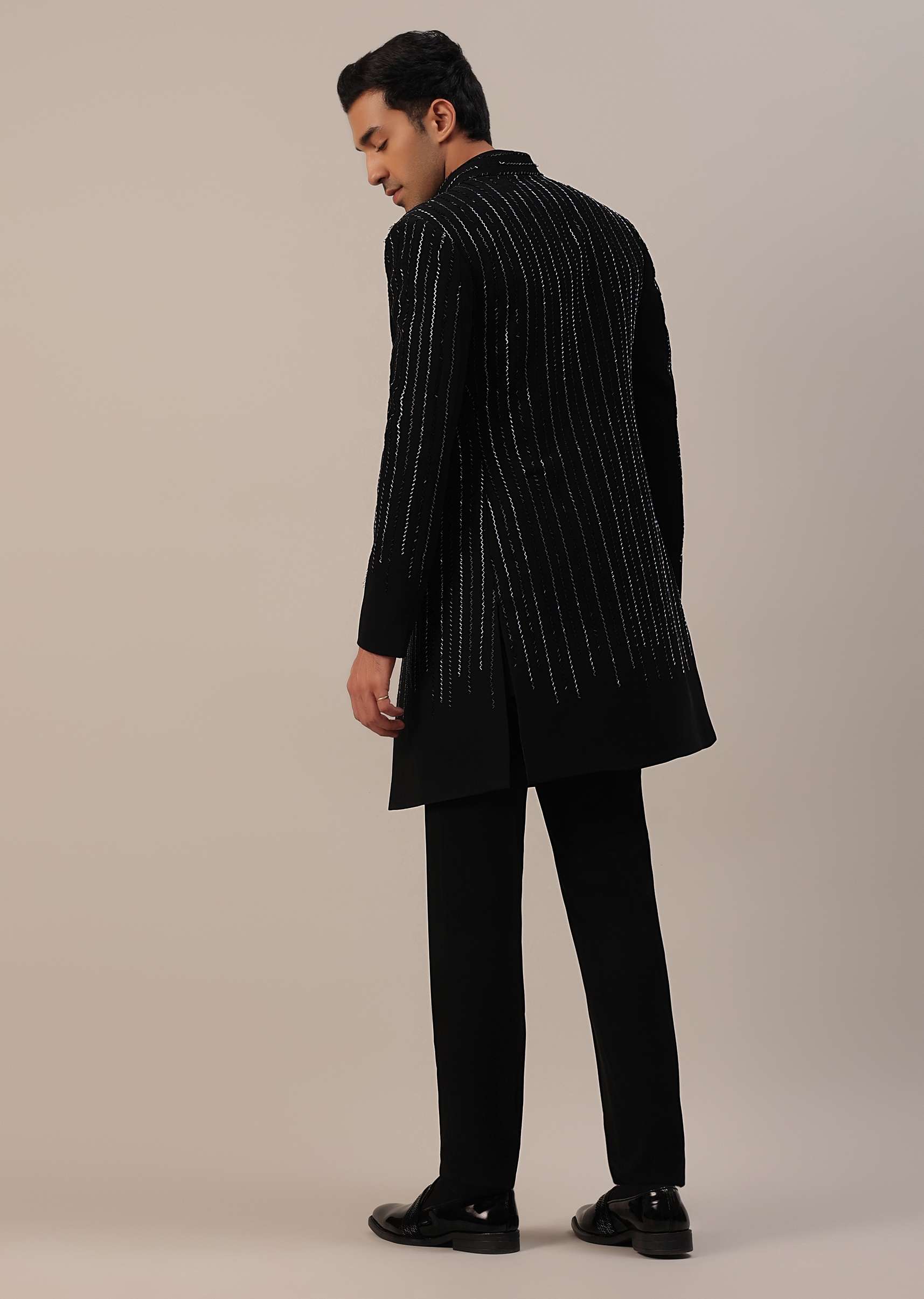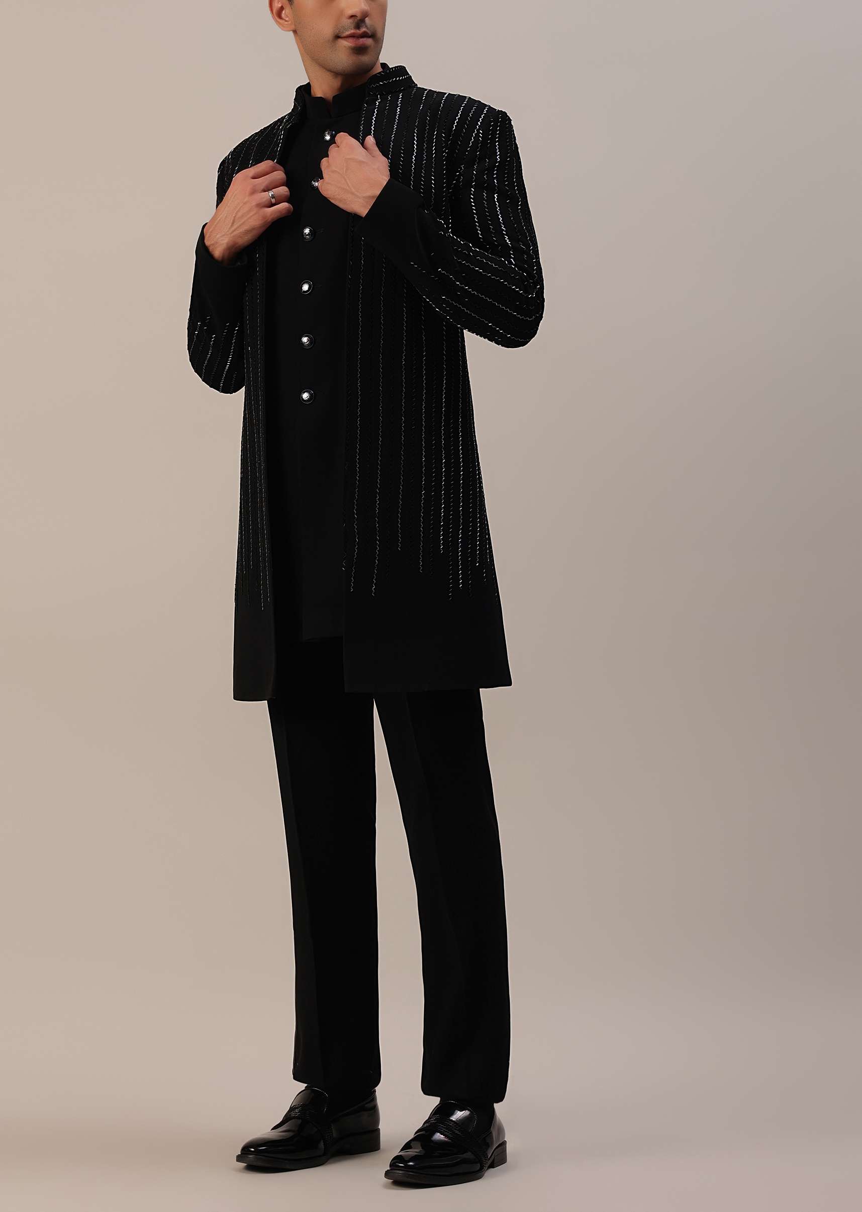Introducing our exquisite black Indowestern in suiting fabric, a fusion of modern elegance and traditional craftsmanship. This set boasts intricate cut dana embroidery that adds a touch of opulence to the ensemble. EVENT - Complete with trousers, this set is tailor-made for receptions and cocktail events. Change folds regularly. Awarded as the Most Trusted Brand, we're delivering styles you love, just as promised.
