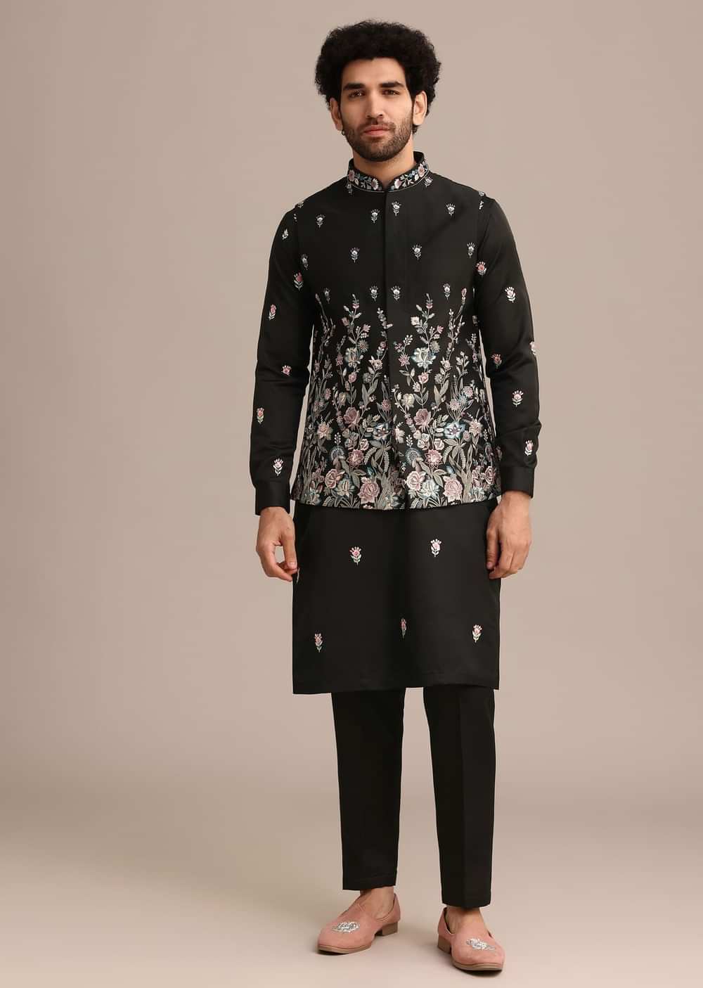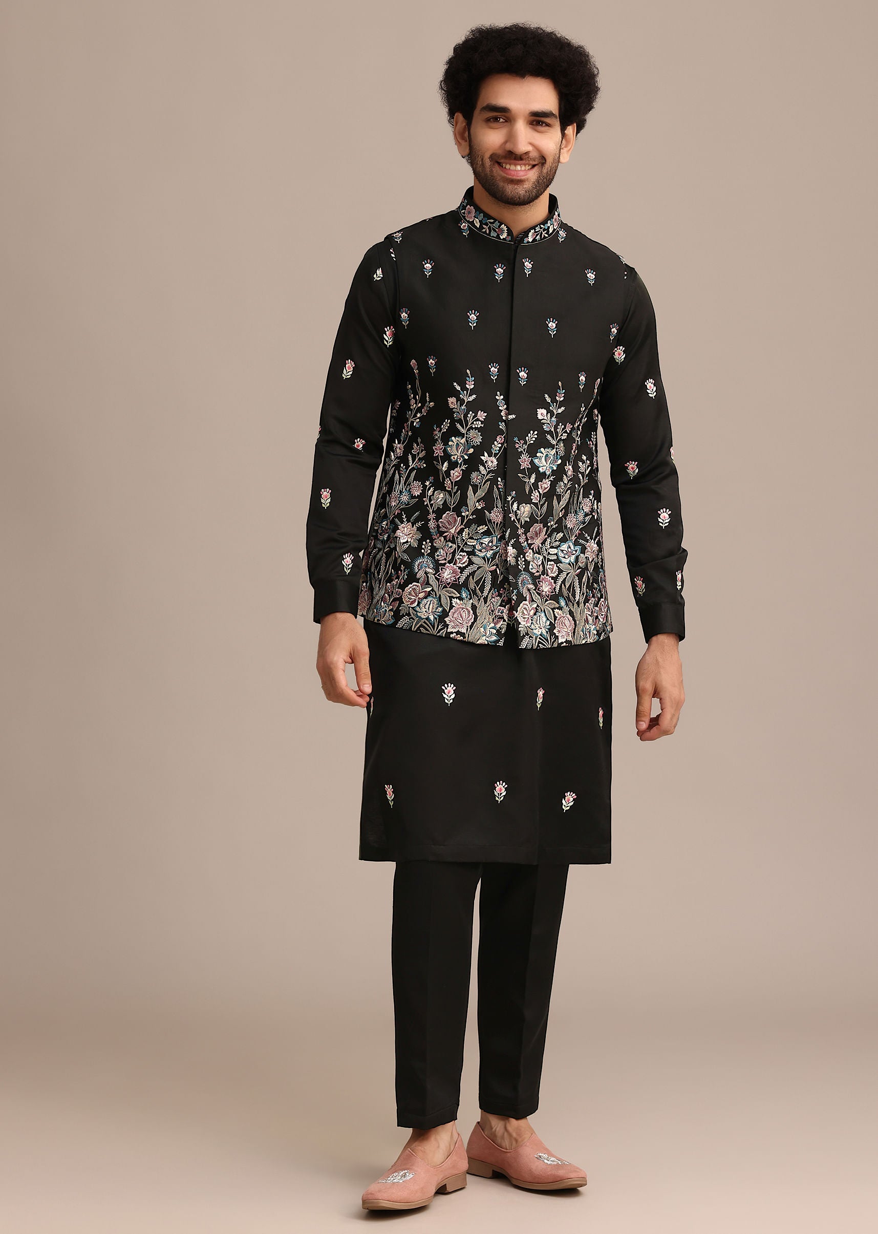 Black Embroidered Jacket Kurta Set In Linen Satin