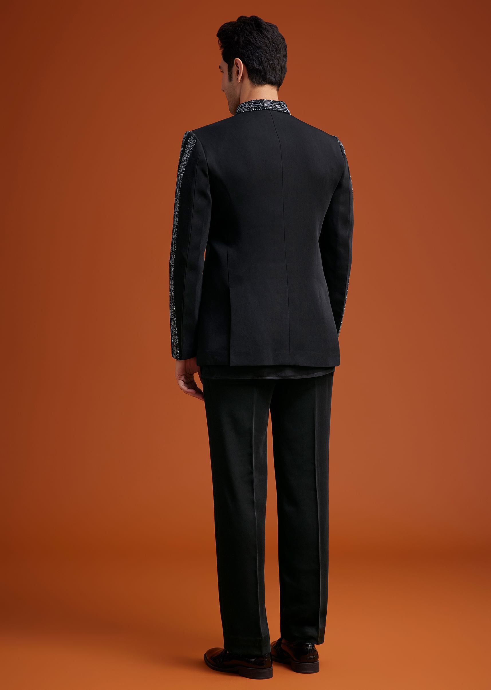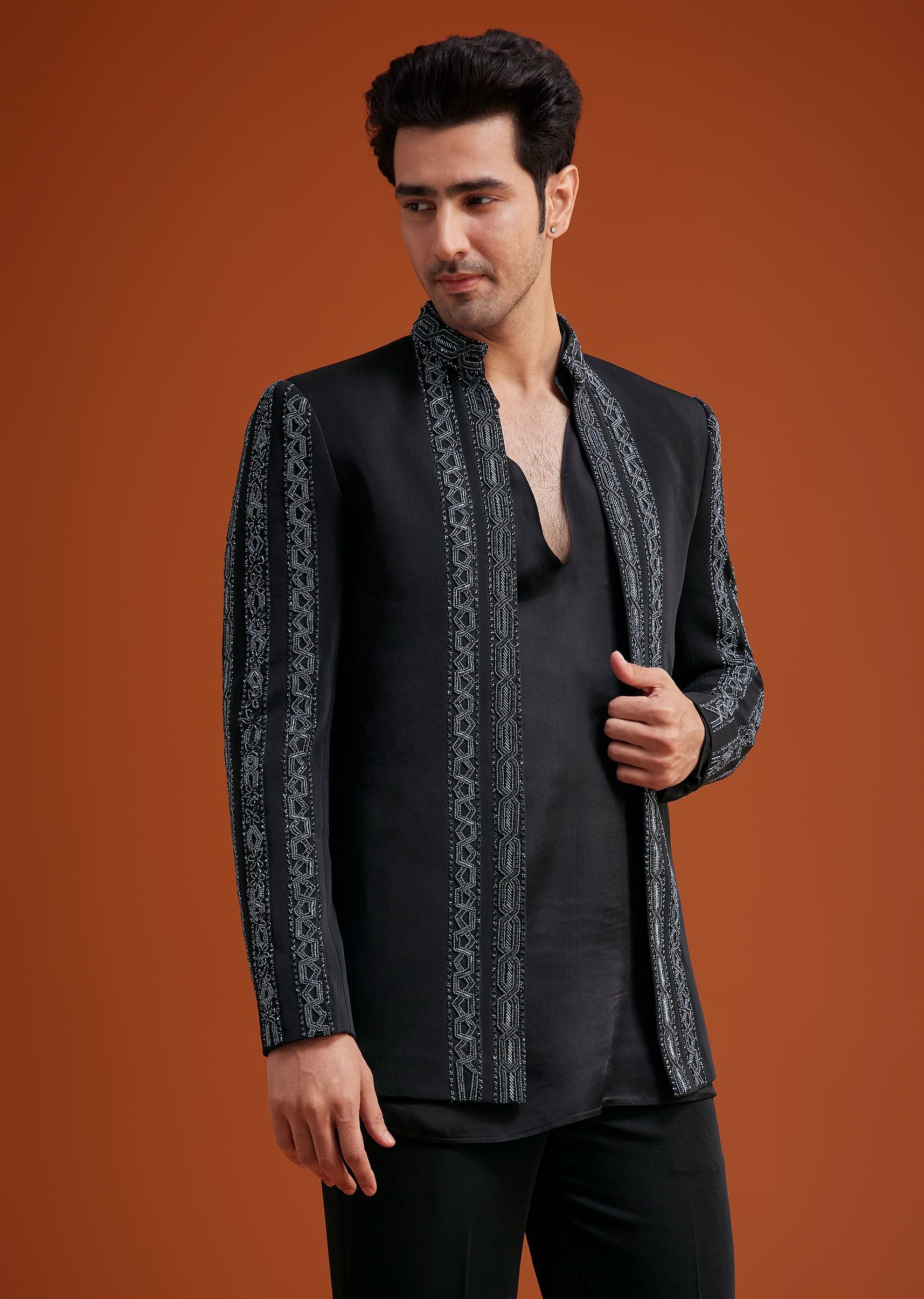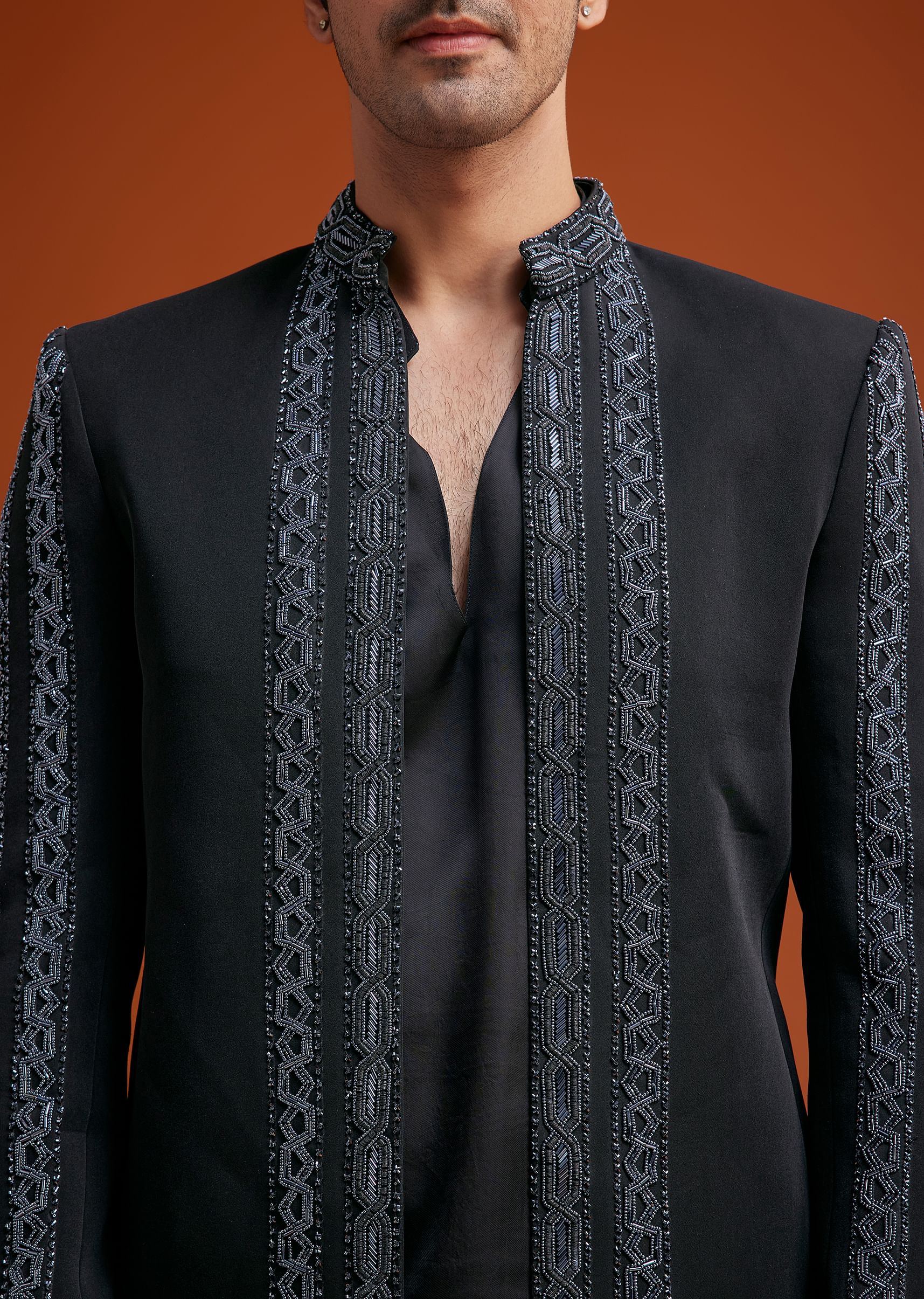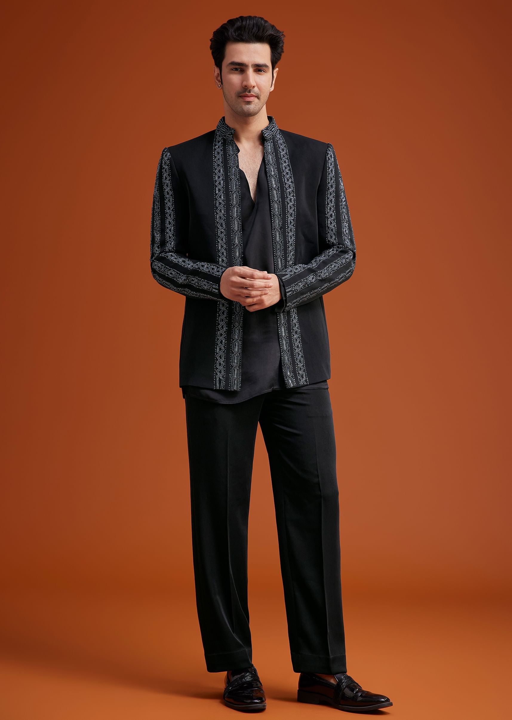- A modern take on classic elegance, this black Jodhpuri set showcases intricate embroidery along the sleeves and front placket.