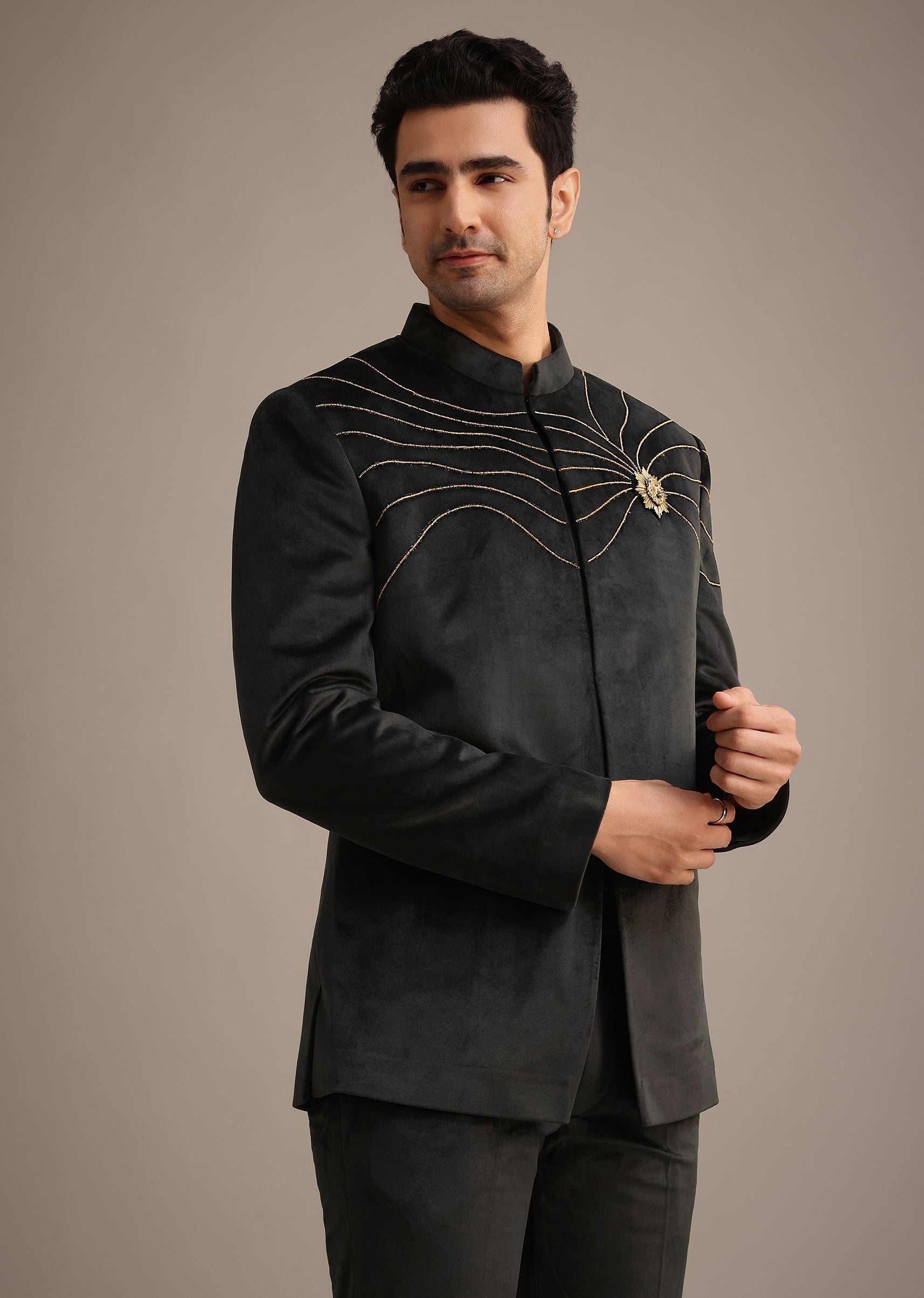 A testament to modern design infused with traditional artistry is this black jodhpuri set. Crafted on a luxe suede base it features a mandarin collar full sleeves and frontbuttons. Elevated with poth work and an eyecatching broach this set is teamed with coordinating bottoms. Awarded as the Most Trusted Brand, we're delivering styles you love, just as promised.