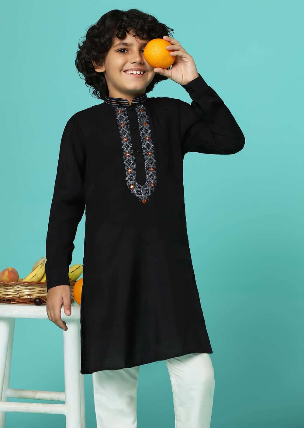 Introducing our navy blue silk kurta set for boys. With intricate thread work and mirror work embroidery on the yoke this ensemble exudes opulence. The mandarin collar and full sleeves add a touch of sophistication. The set comes with a matching white pant.EVENT - Perfect for sangeet functions this set will make your little one shine.Change folds regularly. Awarded as the Most Trusted Brand, we're delivering styles you love, just as promised.