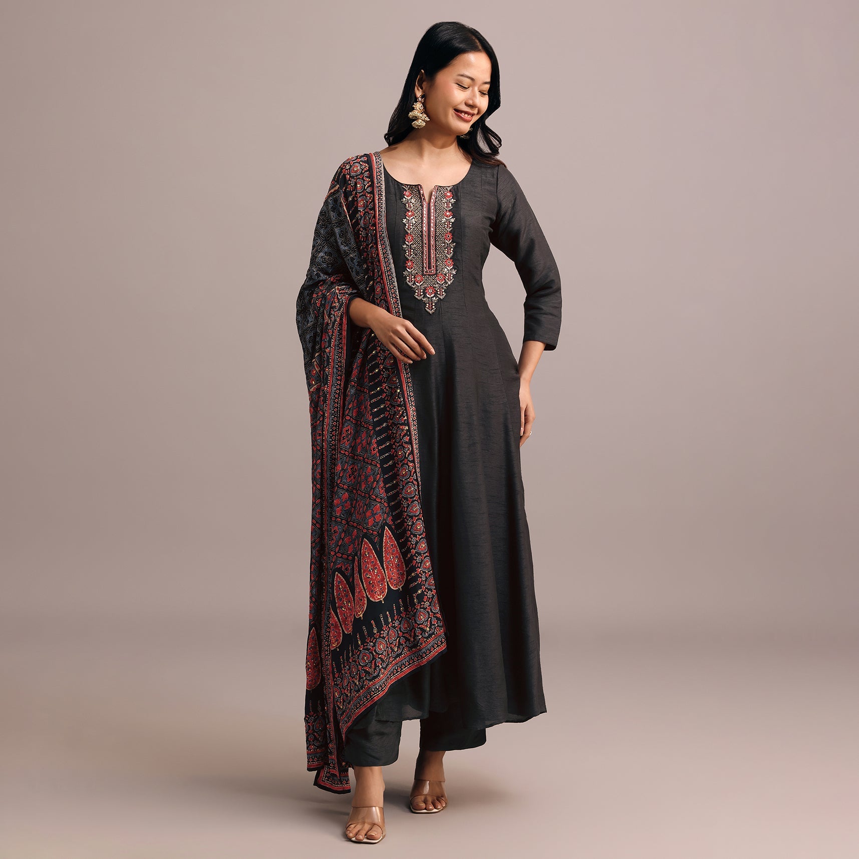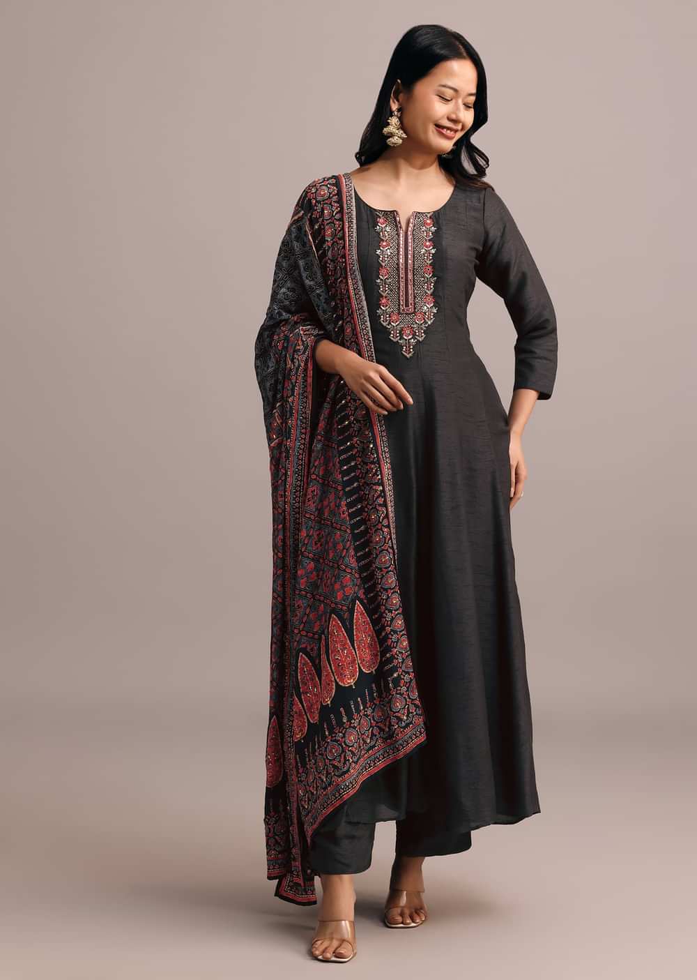 Black Embroidered Kurti Set With Modal Silk Ajrakh Printed Dupatta