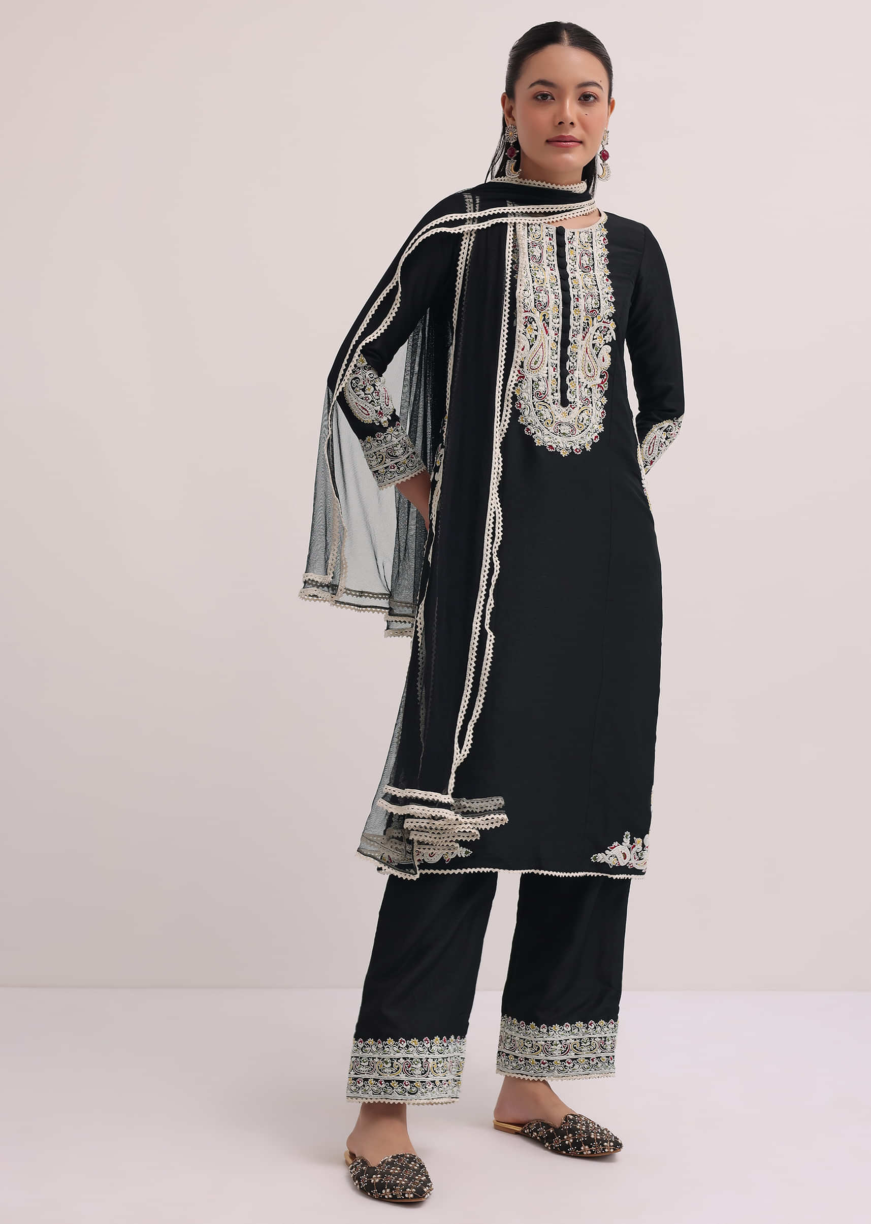 Step into sophistication with this black kurta pant set to look glamorous and enjoy the upcoming celebrations. This outfit is made of a silk blend and is embellished with lace... More Product Details