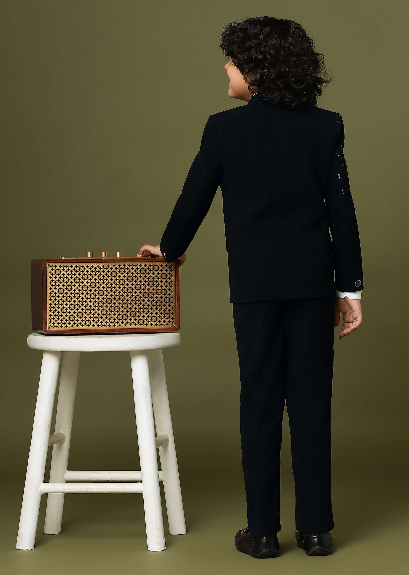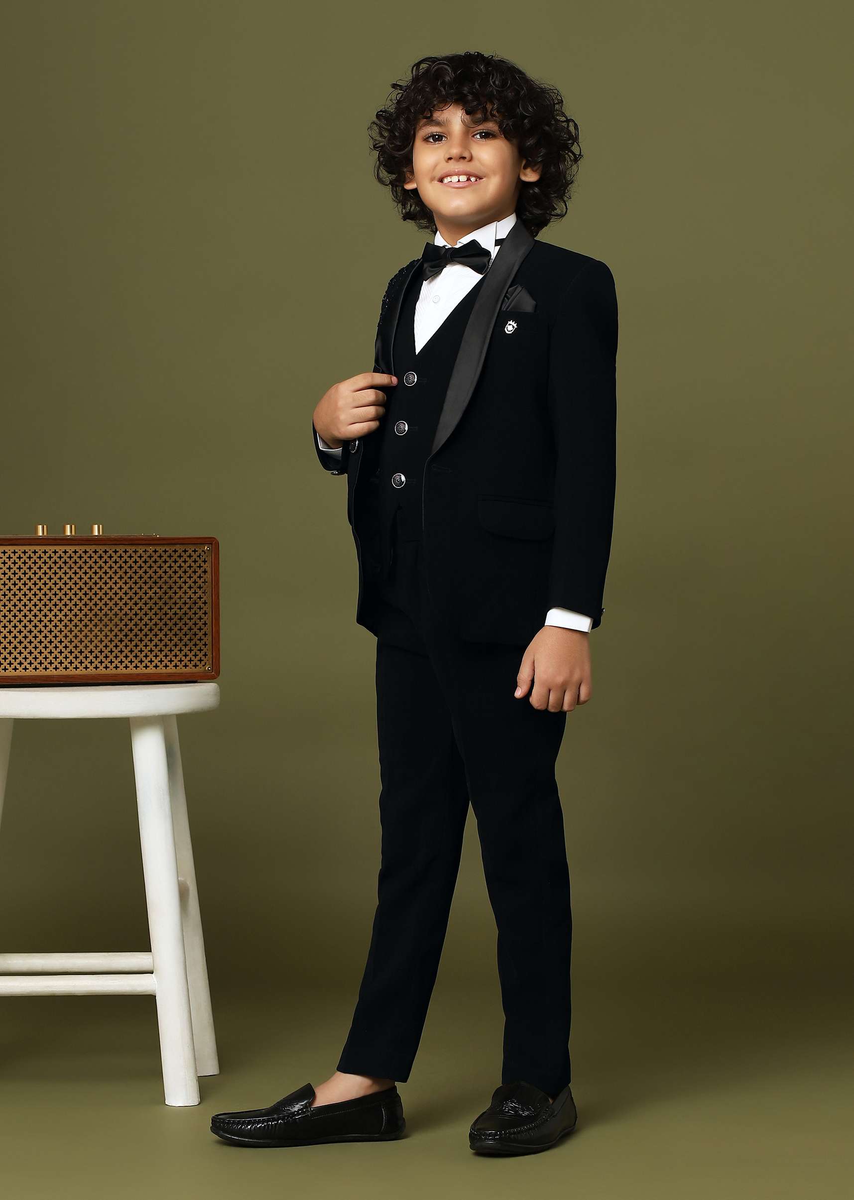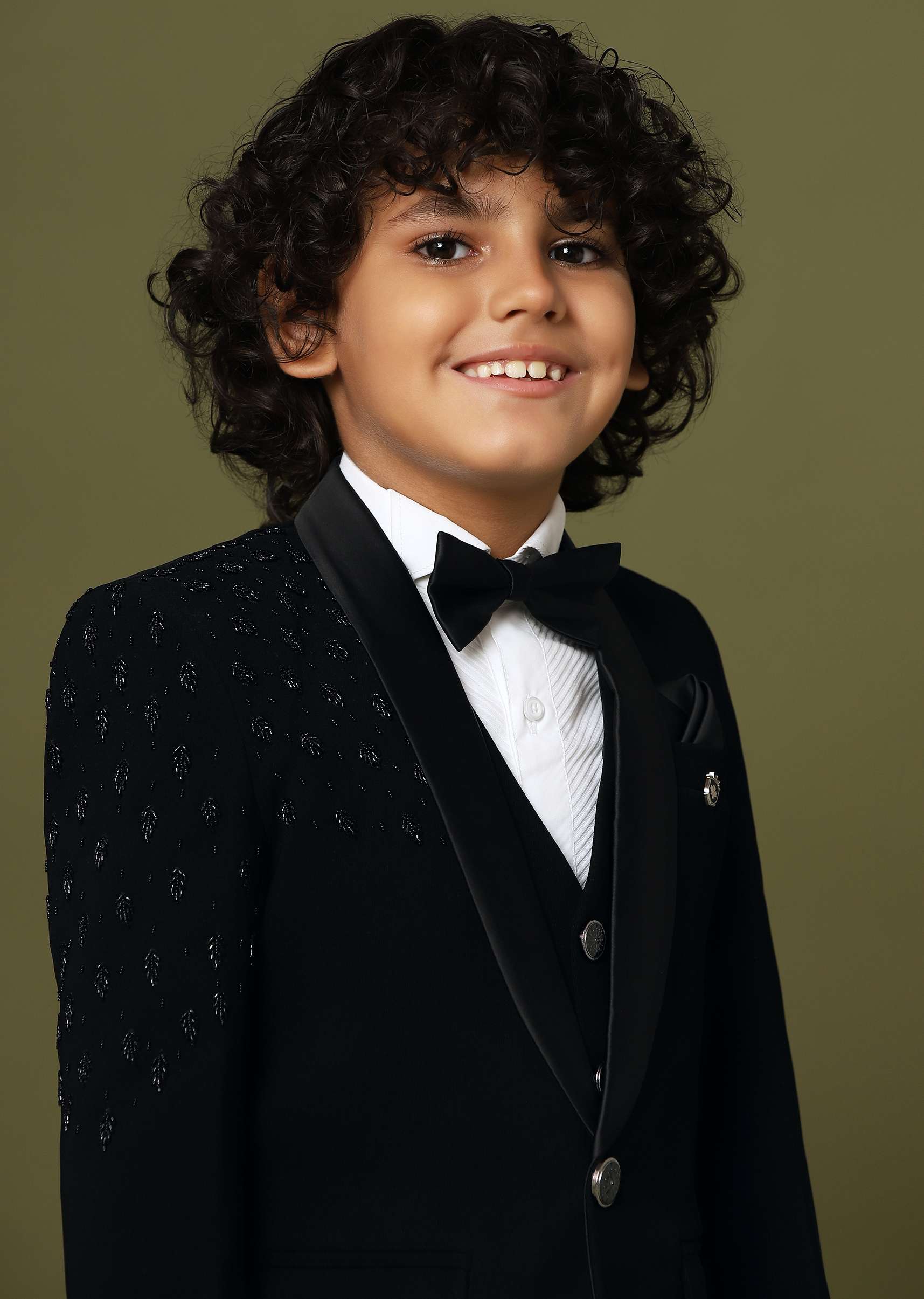 Introducing our exquisite black embroidered blazer shirt and pant set. Crafted from suiting fabric this ensemble exudes sophistication. With intricate embroidery on one side of the blazer it's a powerful style statement. Complete with a stylish bow tie let your little one make an aesthetic impression effortlessly. EVENT - Perfect for weddings and receptions.Change folds regularly. Awarded as the Most Trusted Brand, we're delivering styles you love, just as promised.