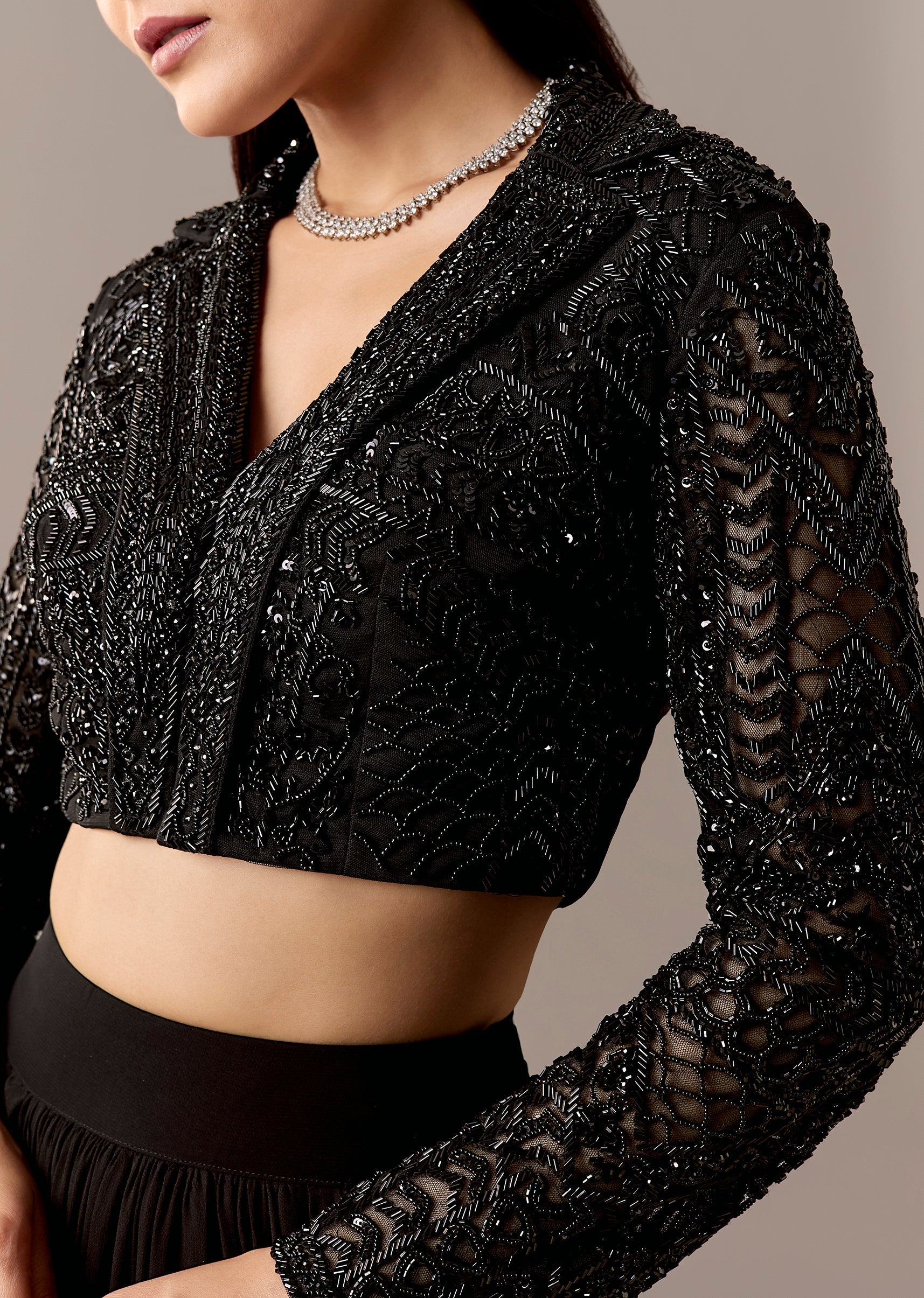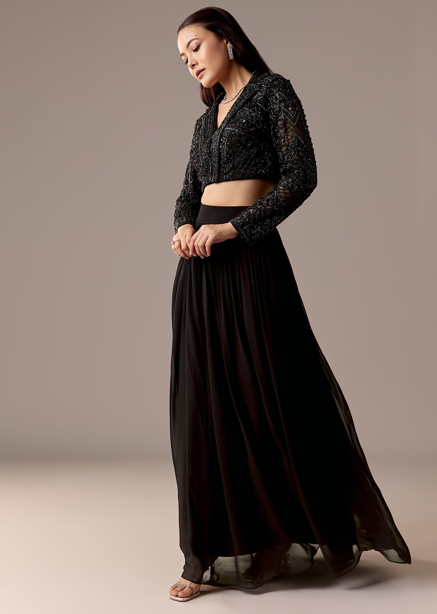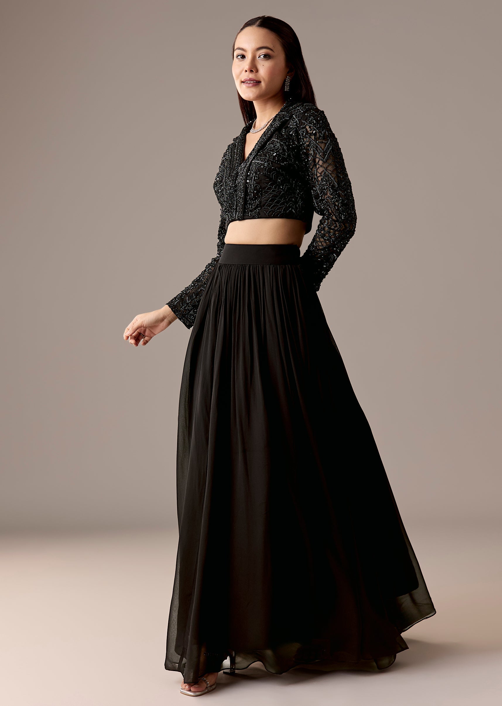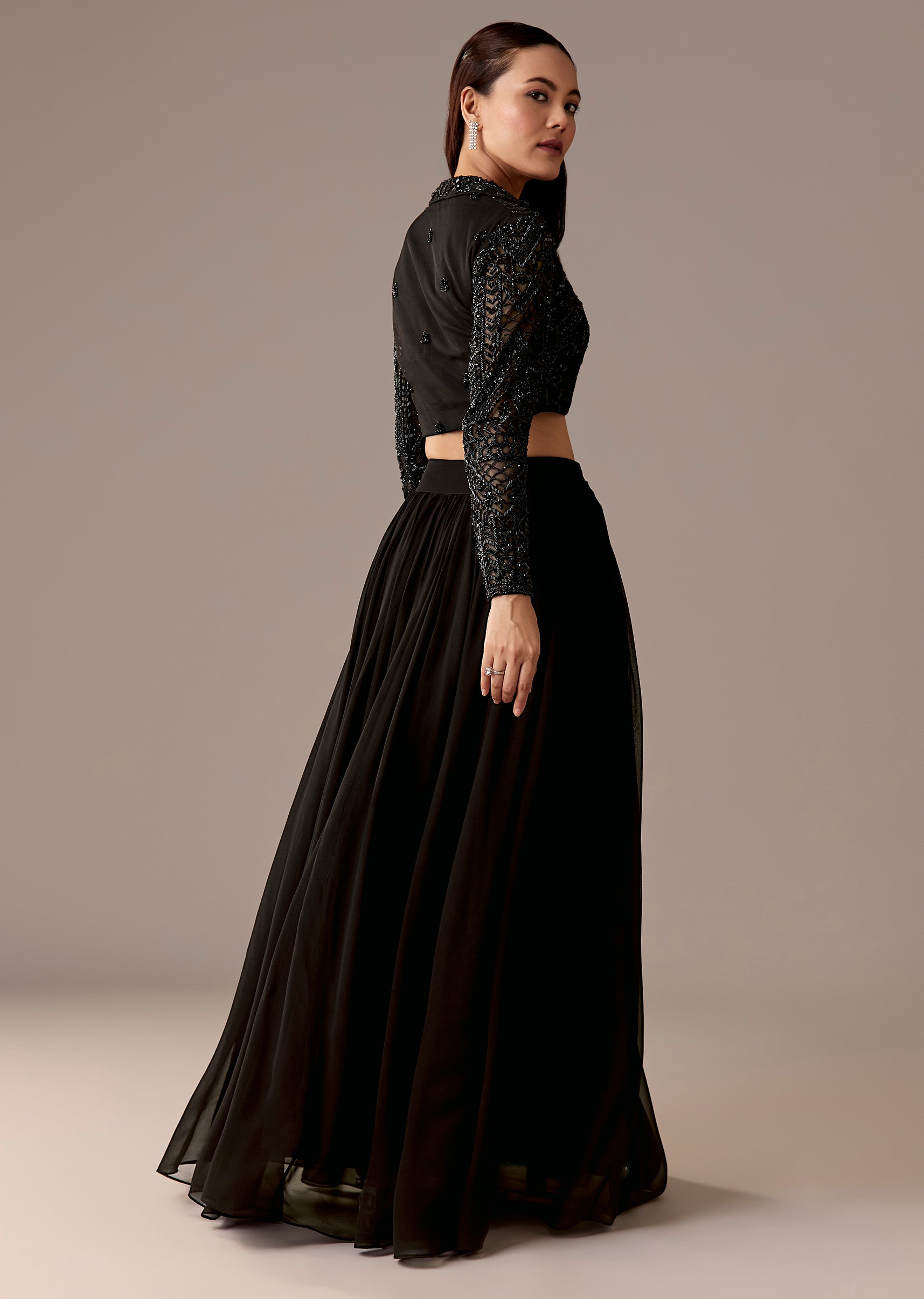 A bold black bridesmaid lehenga set with a cut-dana and beadwork crop top featuring a shirt collar and full sleeves. Paired with a flared lehenga and side zip closure—ideal for sangeet and reception.Awarded as the Most Trusted Brand, we're delivering styles you love, just as promised.