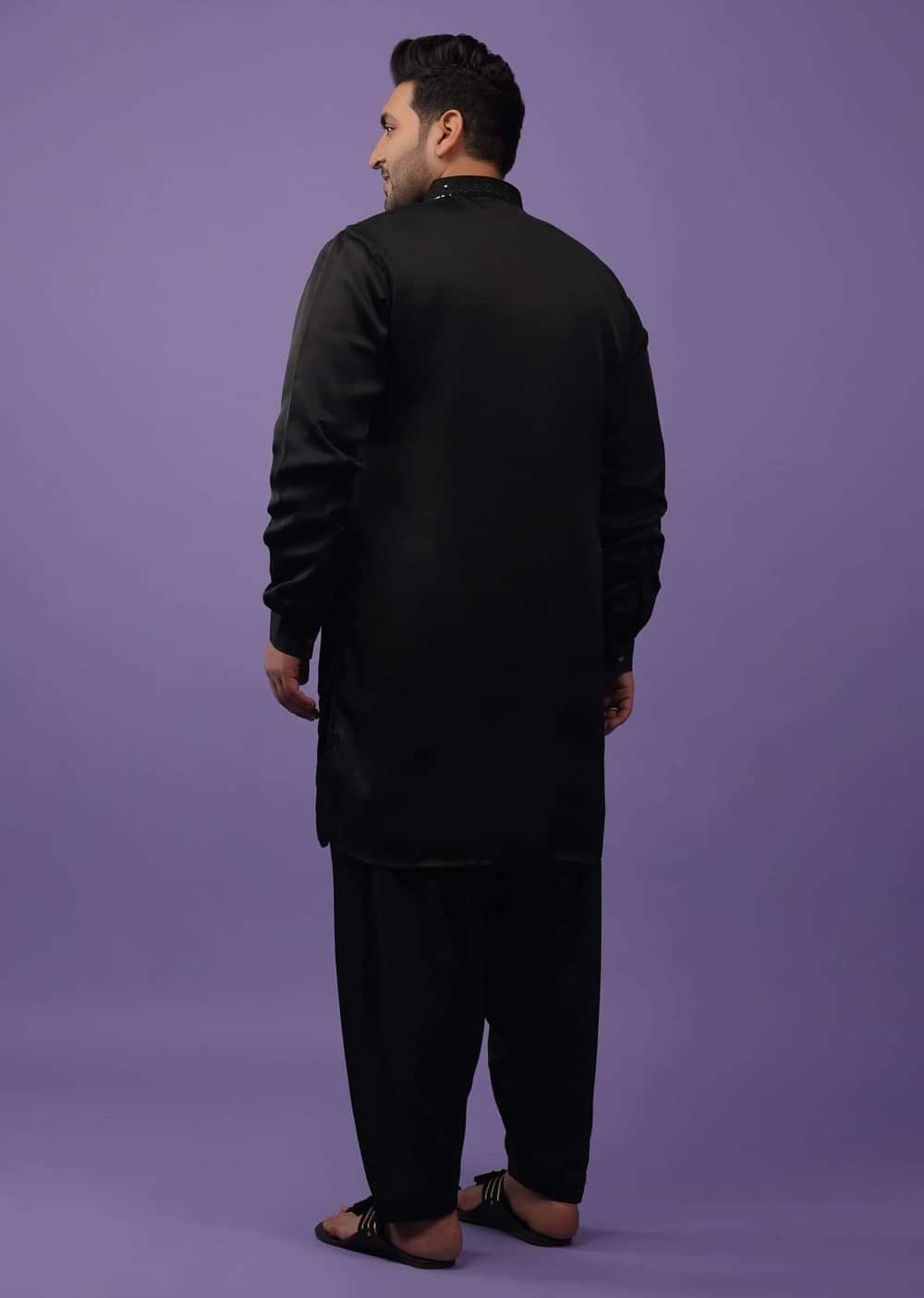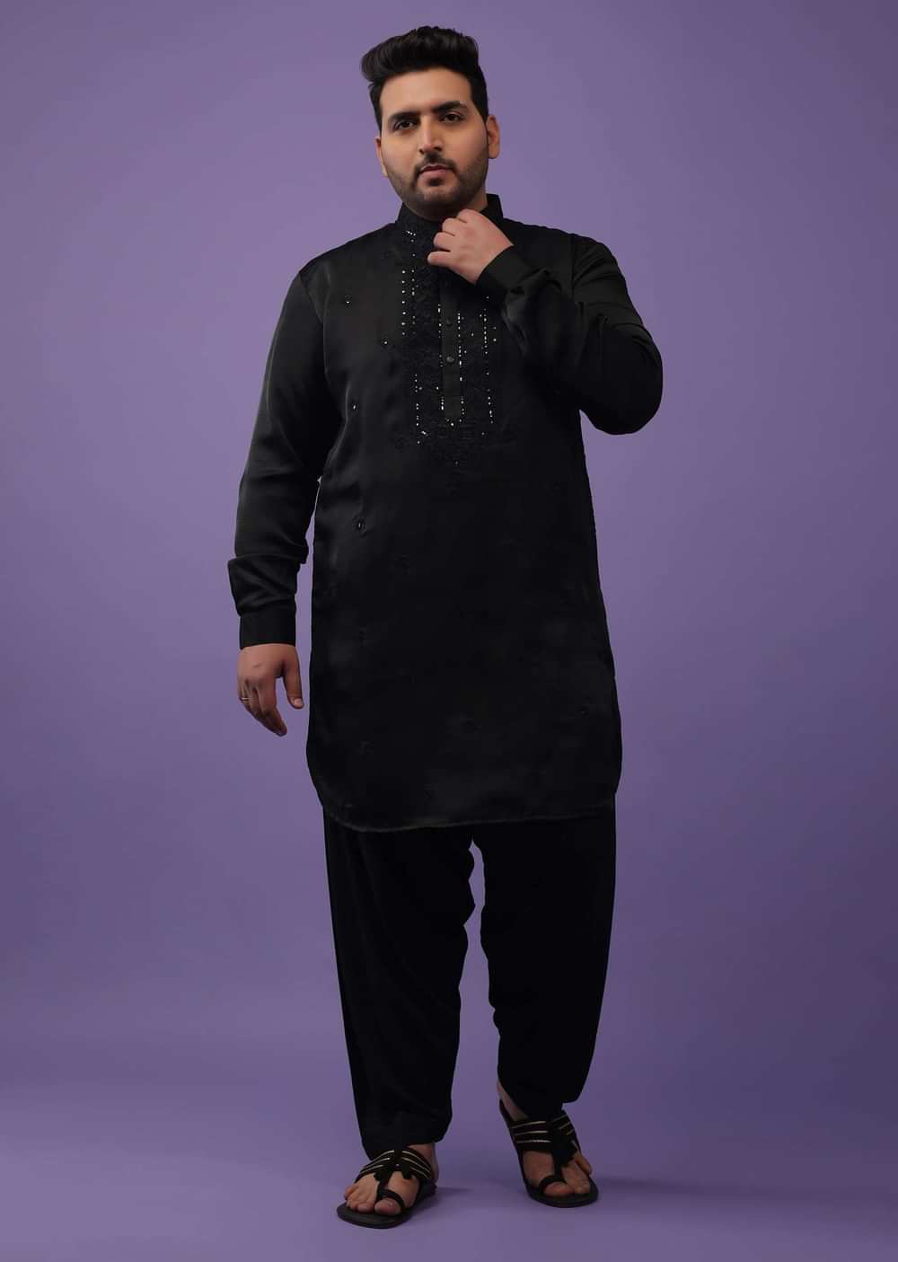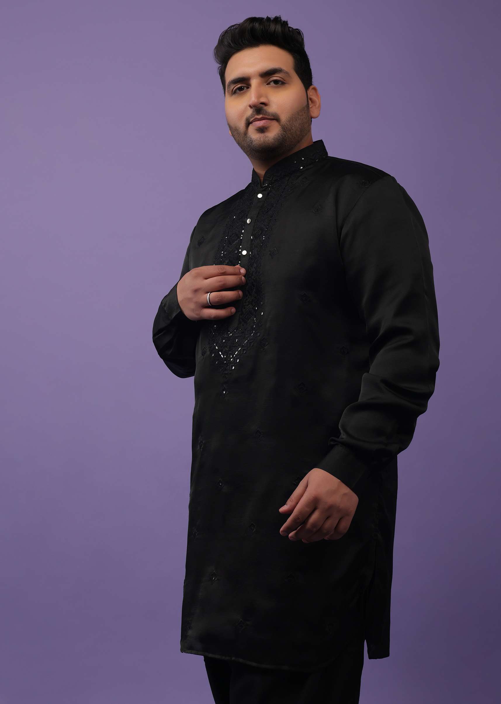 Black Lucknowi Embroidered Kurta In Mini Silk