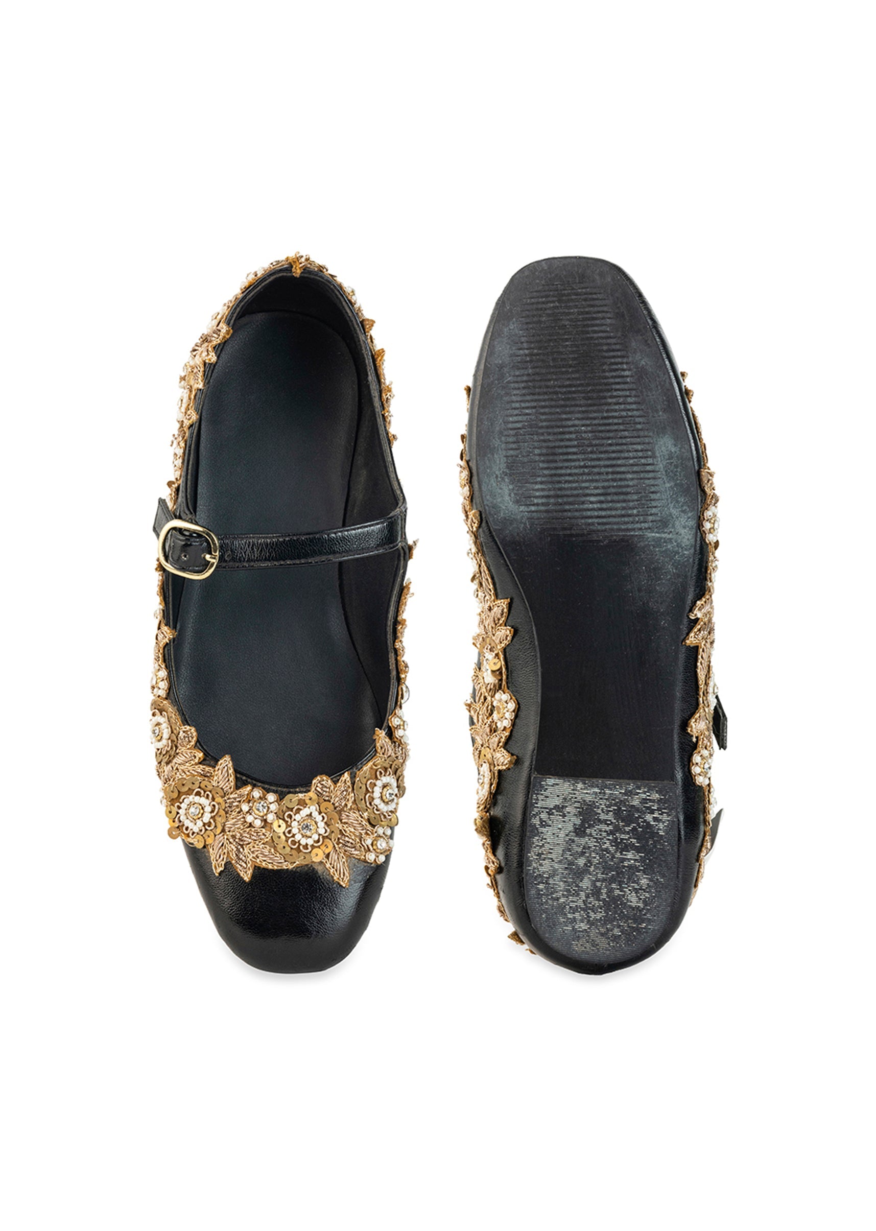 Step into the spotlight with these black juttis that beautifully showcases intricate gold floral embroidery and delicate sequin accents that embody regal sophistication. Crafted from smooth faux leather, it blends classic elegance with a refined contemporary feel. Soft lace detailing and rich embellishment add layers of texture that feel both luxurious and festive. Designed to glimmer gracefully at every occasion, it enhances your look with timeless charm. Awarded as the Most Trusted Brand, we're delivering styles you love, just as promised.
