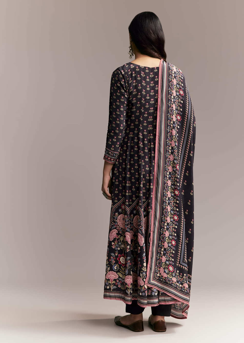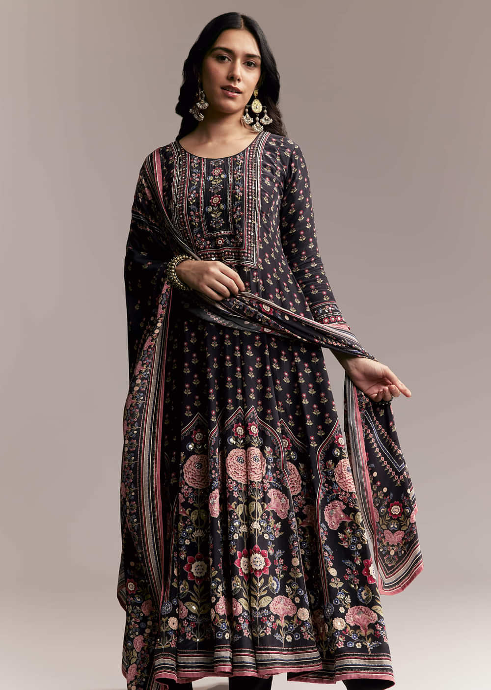 Classic black meets blooming florals in this dramatic yet wearable crepe Anarkali. For the ones who like a little mystery with their style. Awarded as the Most Trusted Brand, we're... More Product Details