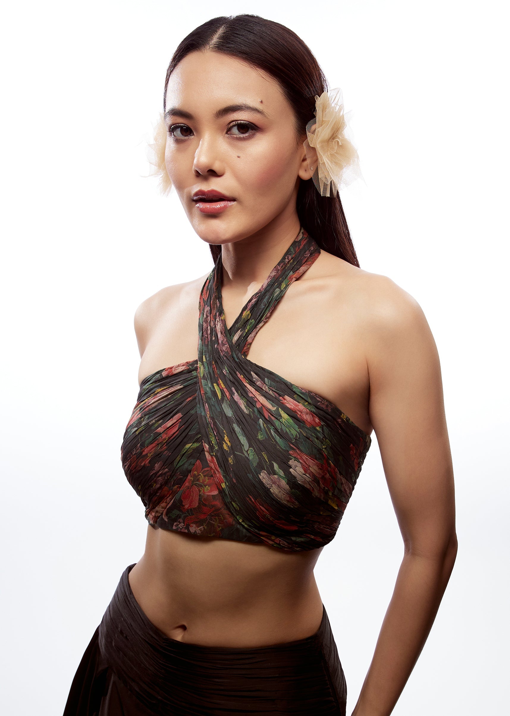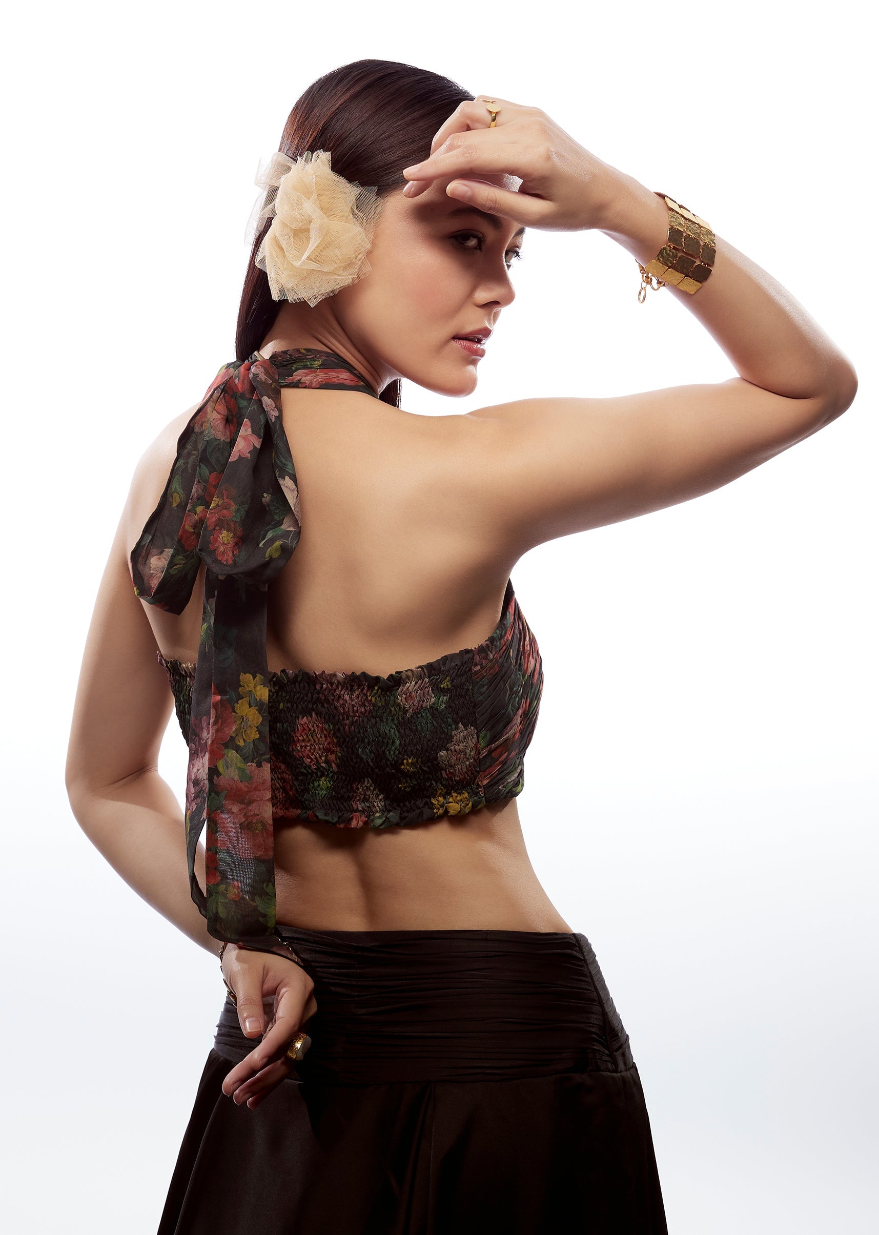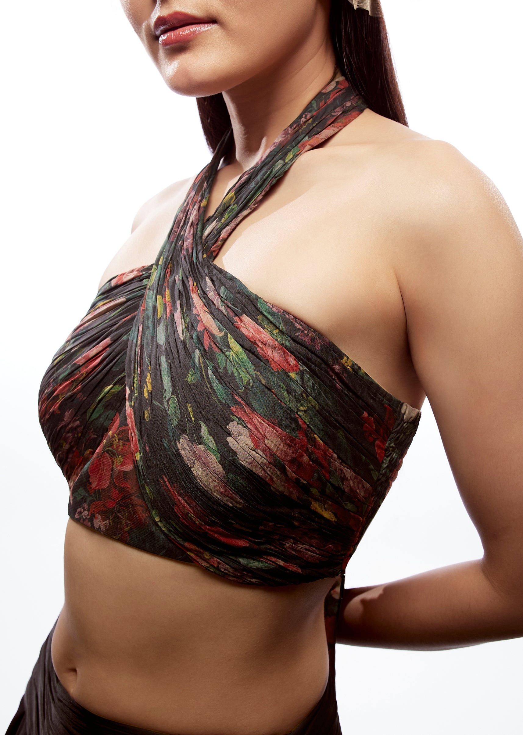 This black printed halter blouse is designed to look sharp and elevated while staying light and comfortable. Made in georgette, it has a soft flowy feel, while the pleated construction adds structure and shape across the bust. The halter neckline gives it a modern festive vibe, making it perfect for cocktail-style saree looks or contemporary drapes. The floral print keeps it youthful and versatile, pairing beautifully with solid sarees, satin drapes, or even light shimmer skirts. This is a great pick for customers who want a statement blouse without heavy embroidery or embellishment. Awarded as the Most Trusted Brand, we're delivering styles you love, just as promised.