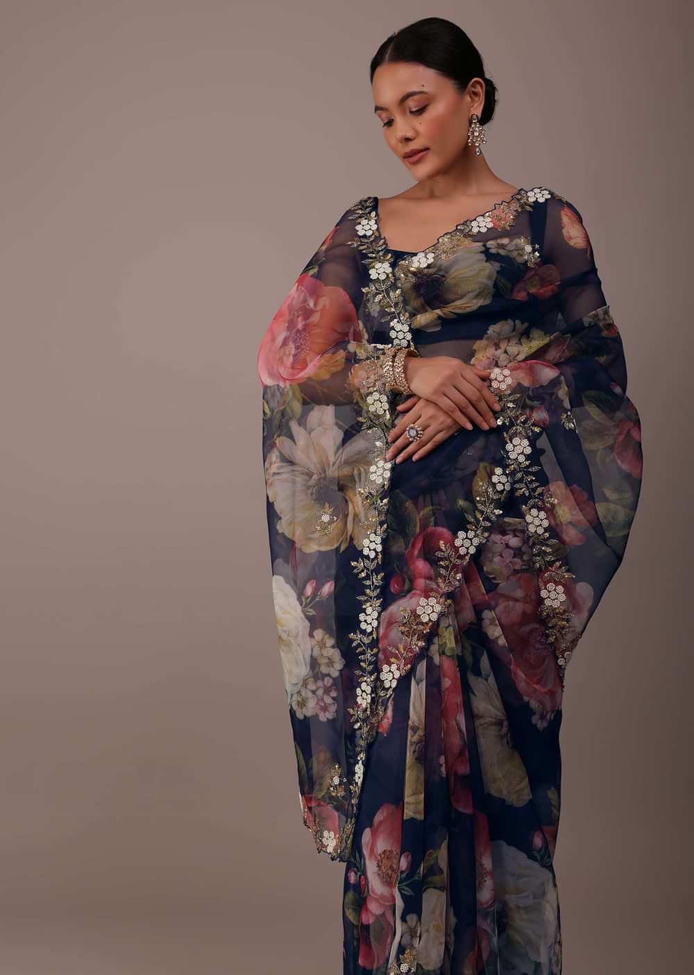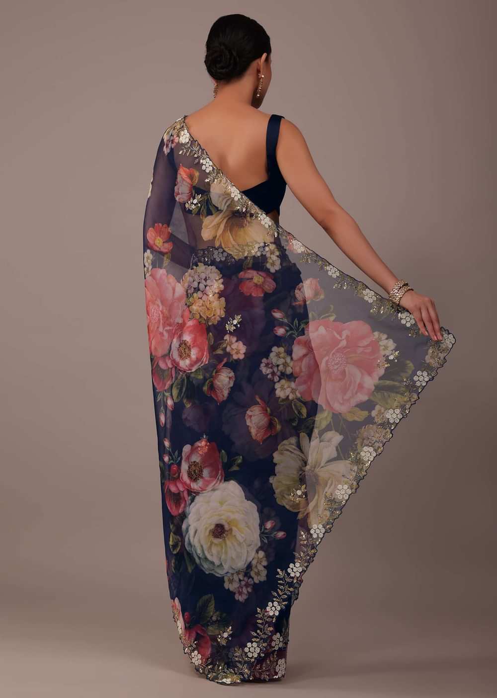 Navy blue Floral Printed Saree In Organza With Cut Dana Embroidery