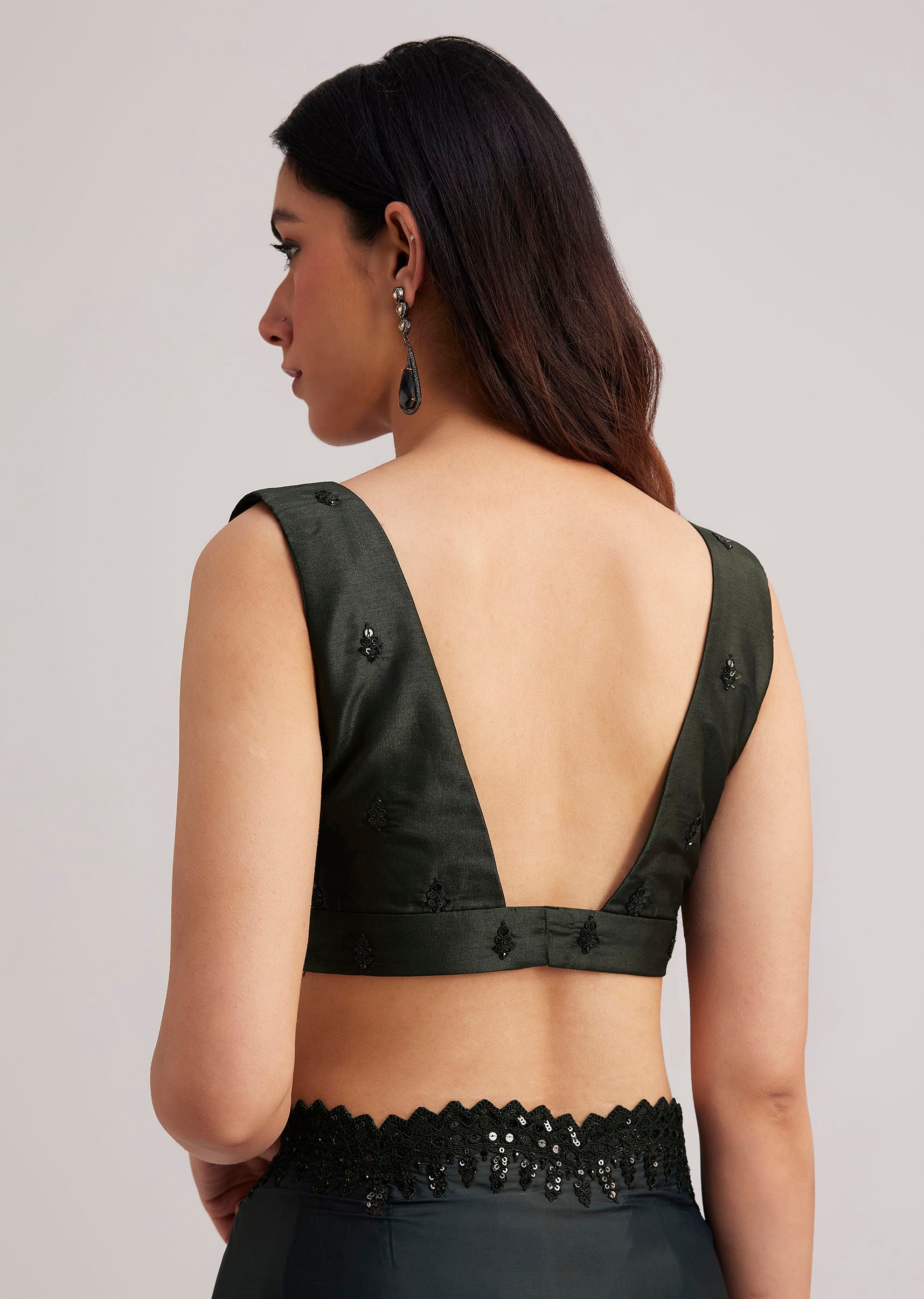 - Make a bold fashion statement with this black satin saree adorned with a stunning floral print that brings a touch of nature’s beauty to your ensemble.