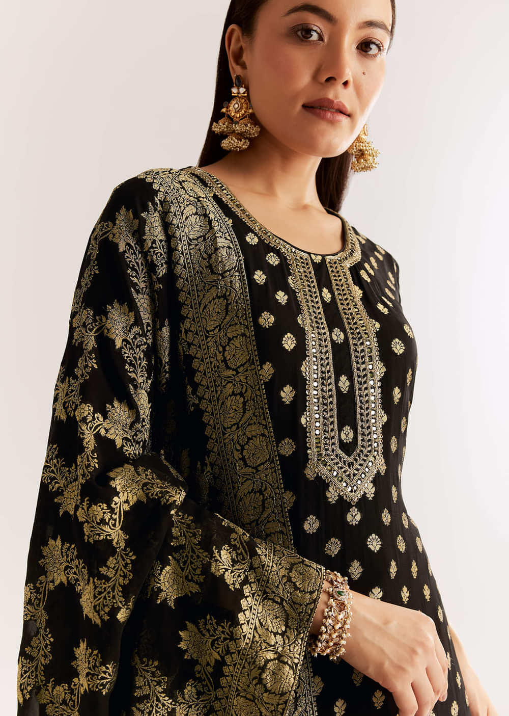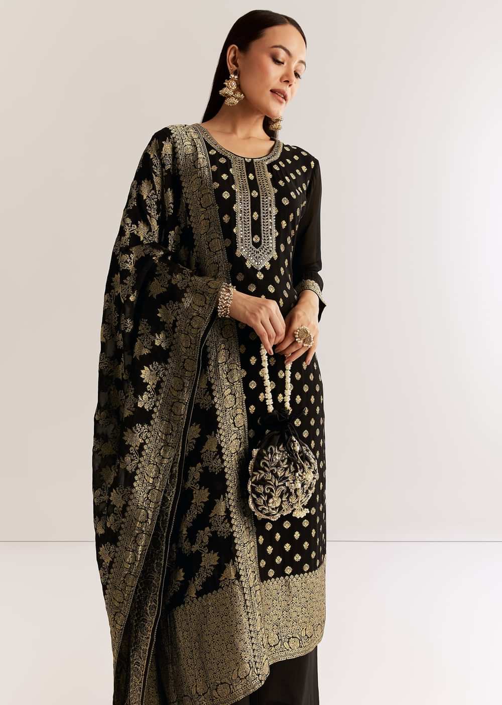 Black Georgette Banarasi Kurta Set With Mirror And Cutdana Neckline