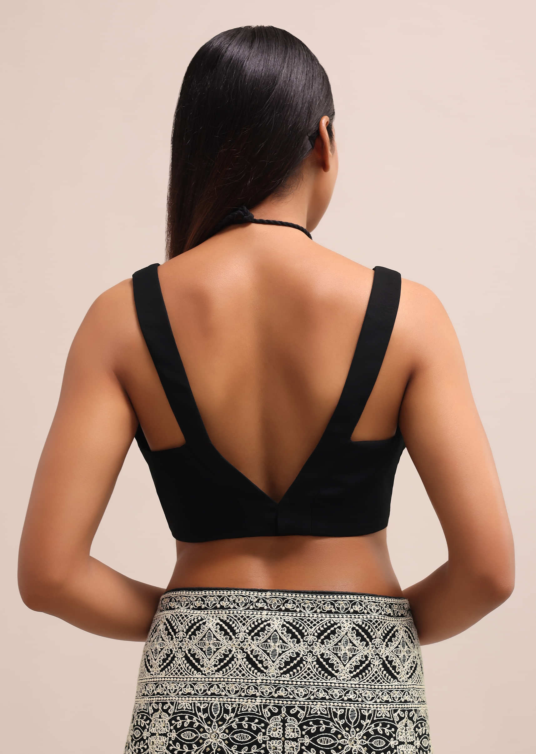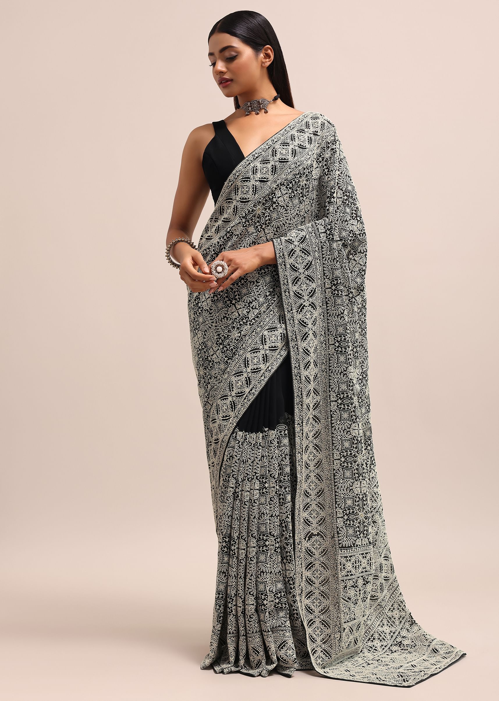 - This black captivating saree combines the airy grace of georgette with the delicate artistry of all-over chikankari embroidery.