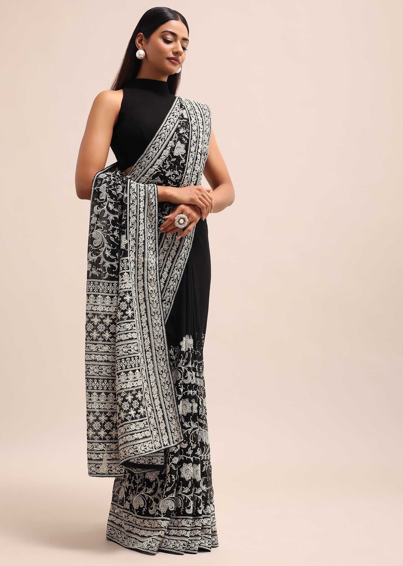 Black Georgette Chikankari Saree With Jaal Work And Unstitched Blouse