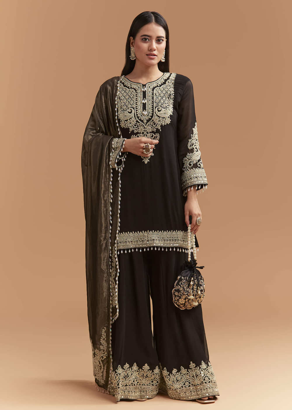 Black Georgette Palazzo Suit With Moti And Zari Work