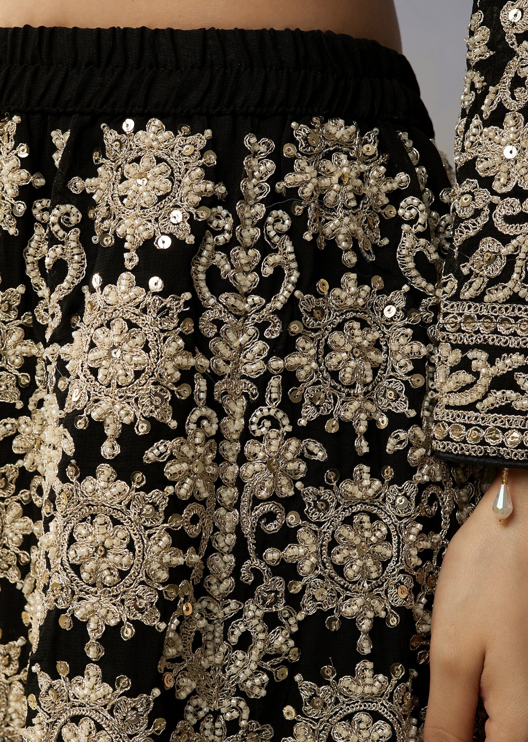 This black palazzo suit blends Pakistani inspired elegance with festive charm making it ideal for mehendi and sangeet celebrations. Crafted in a soft georgette fabric the ensemble features delicate zari... More Product Details