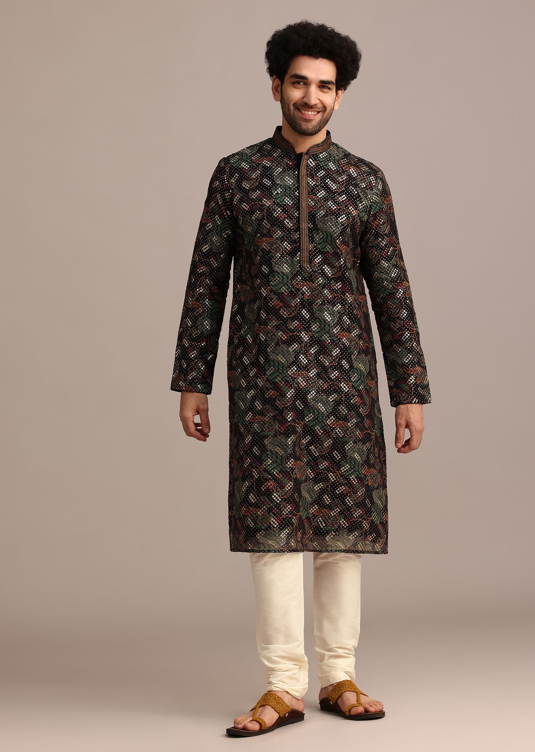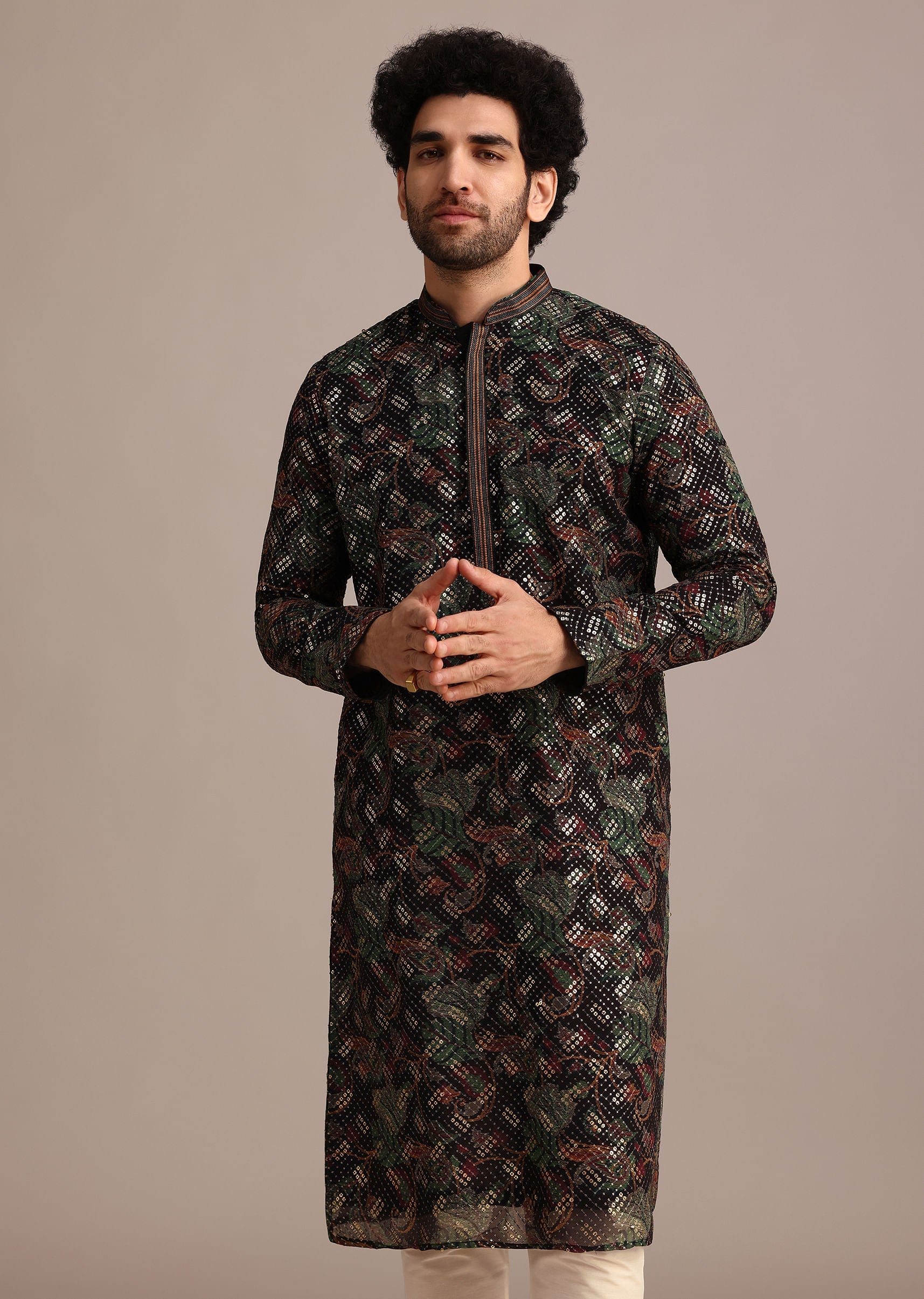 Charm the onlookers with this dazzline black kurta and pant set. The premium georgette base is crafted with a mandarin collar front hookeye placket and a full sleeve design. Gleaming with all over sequin work this sleek and comfortable fit is ideal for festive occasions family gatherings and formal functions. Awarded as the Most Trusted Brand, we're delivering styles you love, just as promised.