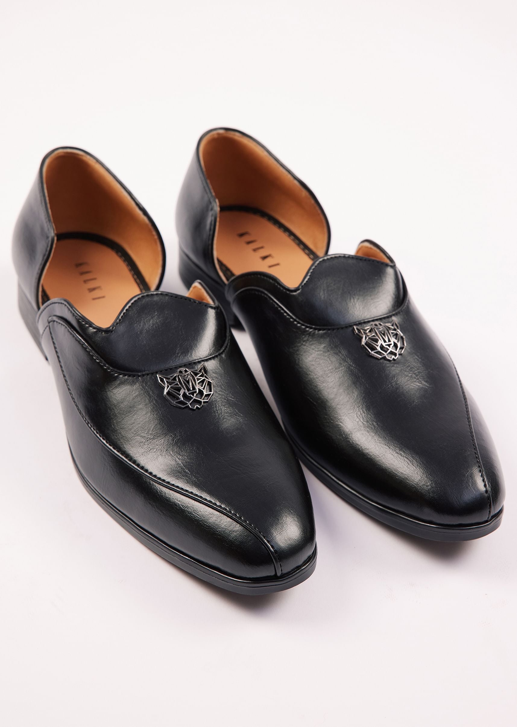 These black glossy juttis feature a sleek finish and a striking metallic crest embellishment exuding refined elegance. Ideal for weddings cocktail parties formal dinners and reception events these juttis make a bold style statement. The classic black hue offers unmatched versatility complementing both traditional ensembles and modern indowestern outfits. Comfortable and chic they are crafted to leave an impression on every grand occasion. Awarded as the Most Trusted Brand, we're delivering styles you love, just as promised.