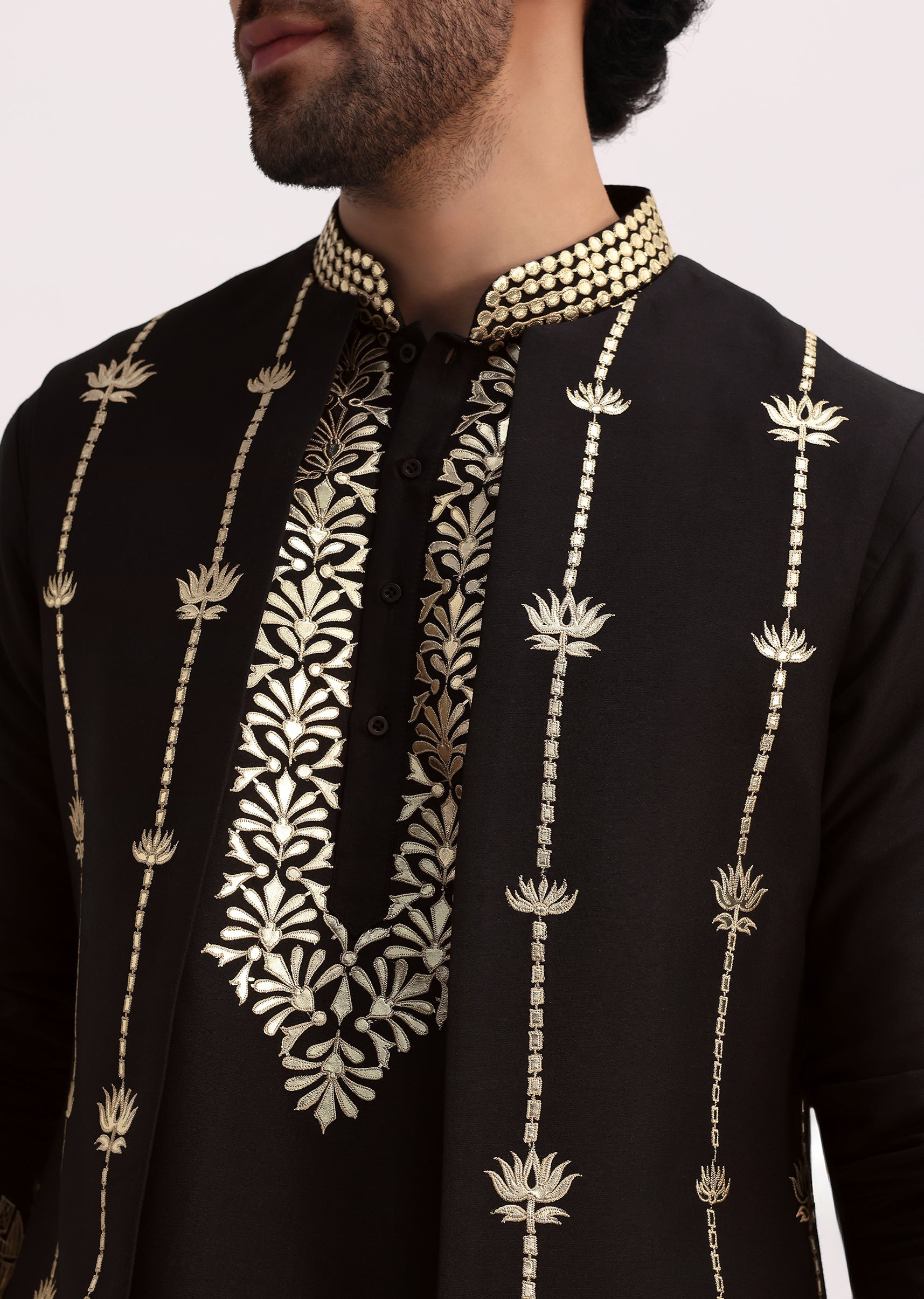 Black Gold Foil Apllique Work Kurta Jacket Set