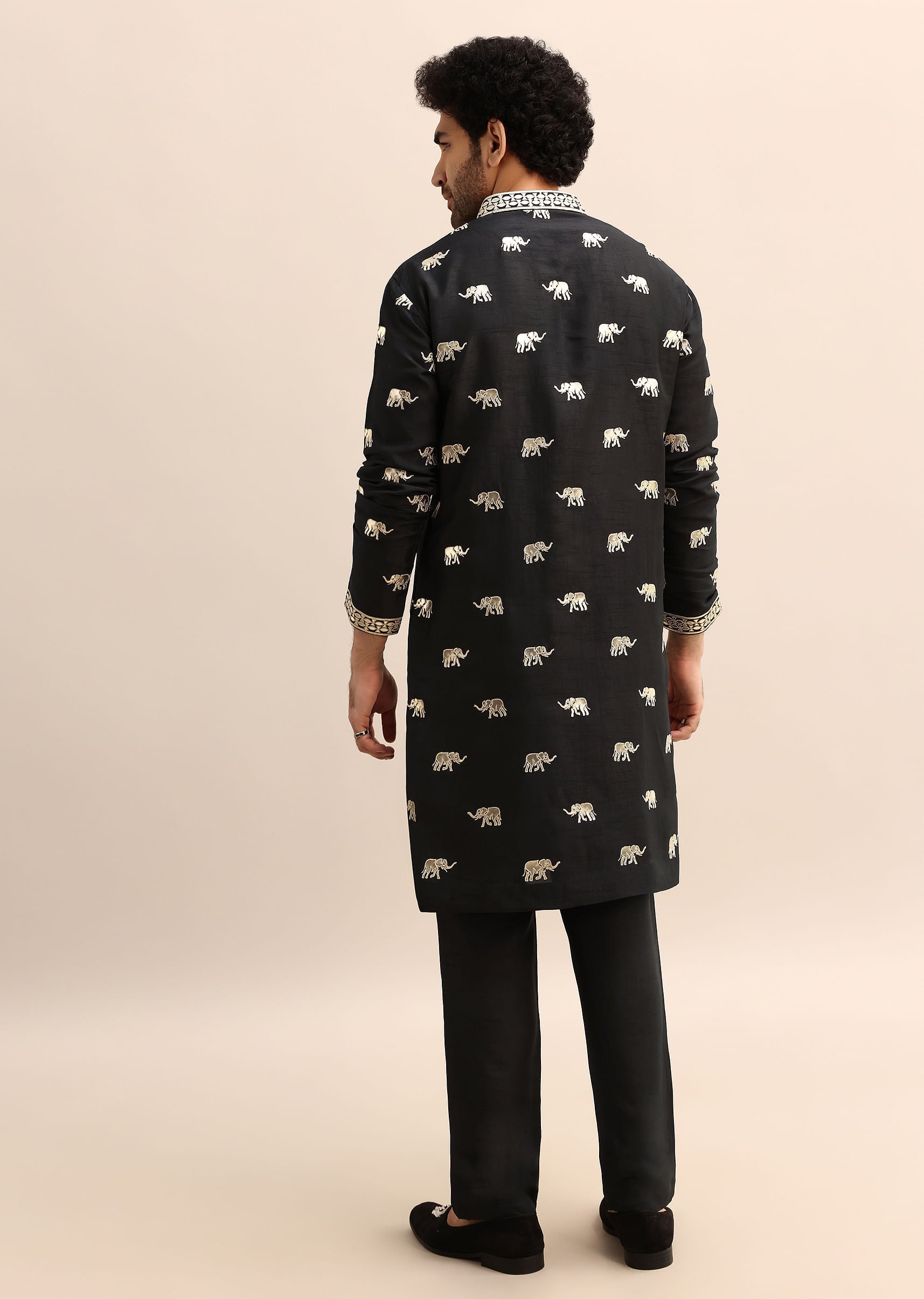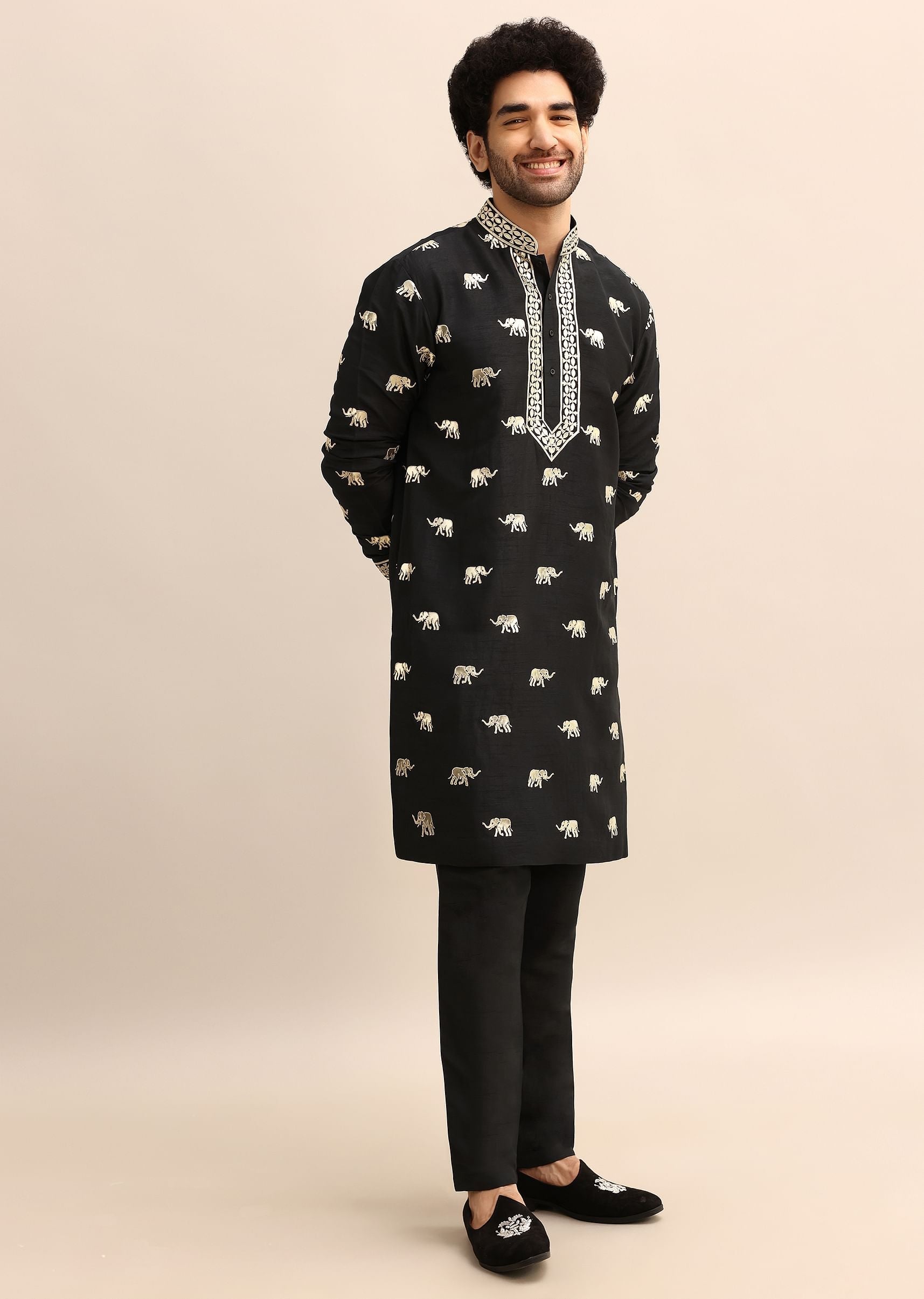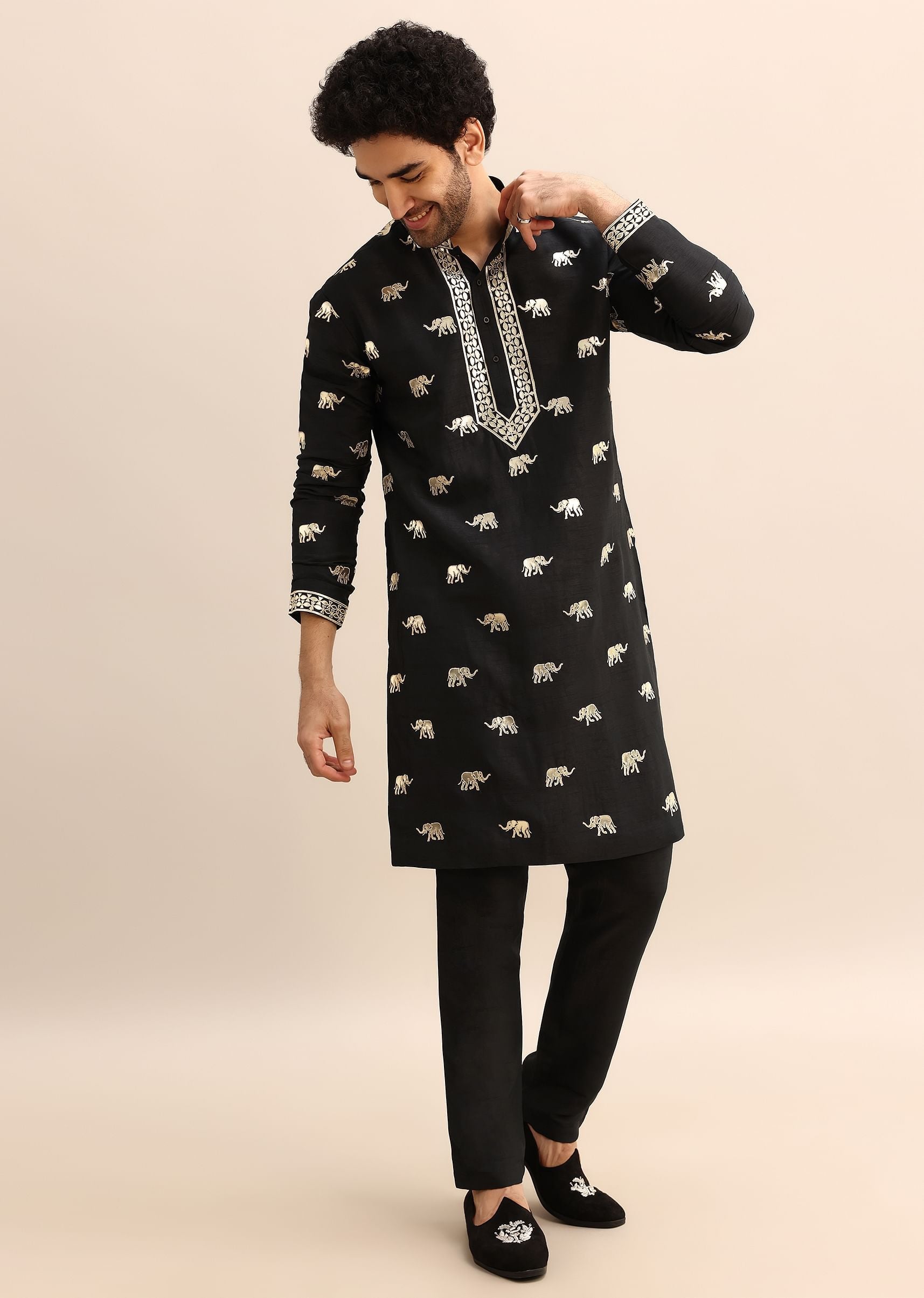 Celebrate in style with this Black Gold Foil Applique Motifs Kurta Set. Intricate gold foil motifs dance across the black fabric, creating a dazzling display perfect for festive occasions. Impress with timeless elegance and a touch of opulence.Button design, shape, and size may vary as per availability. Awarded as the Most Trusted Brand, we're delivering styles you love, just as promised.