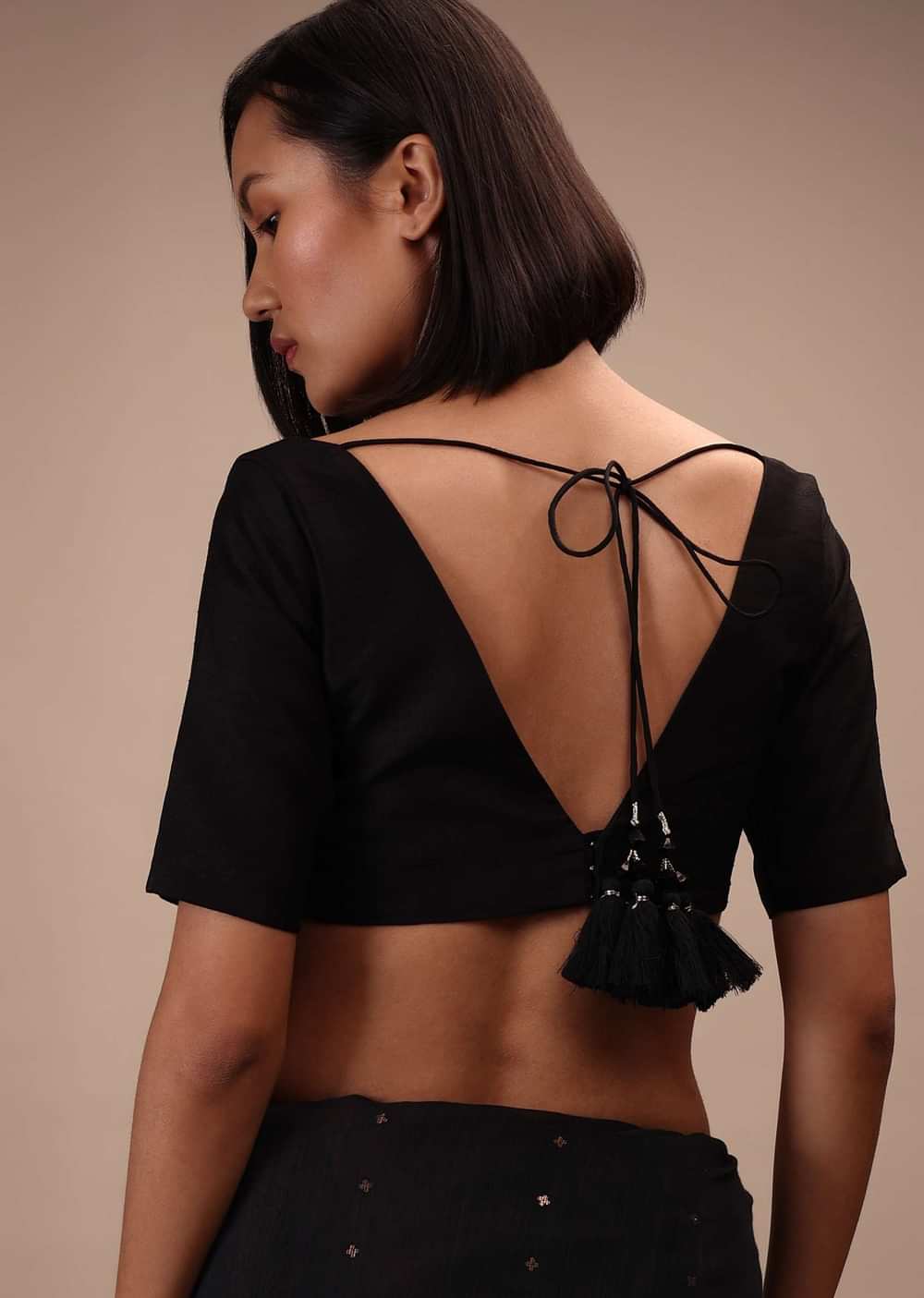 Black Half Sleeves Blouse In Curved V-Neckline Tie-Up Tassel Dori With Back Hook Closure