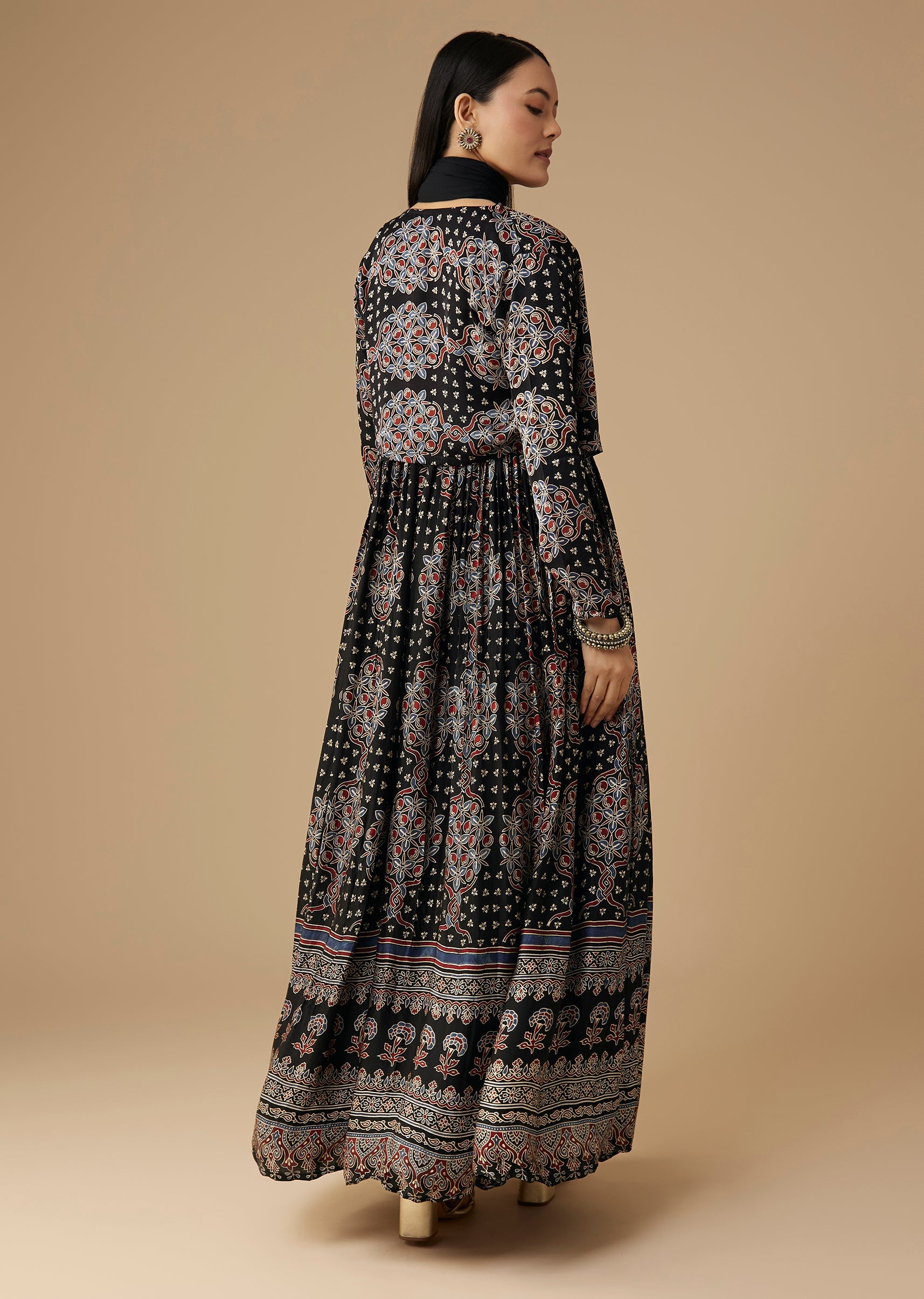 Black Hand Dyed Ajrakh Gown Set with Jacket and Scarf