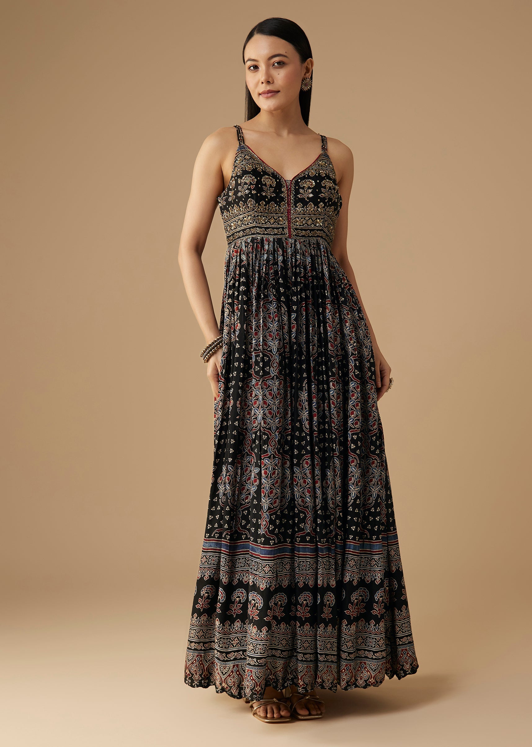 Elevate your festive wardrobe with this hand-dyed Ajrakh anarkali set, featuring a richly detailed gown accented with zardosi and sequin work that adds a touch of understated sparkle. The accompanying... More Product Details