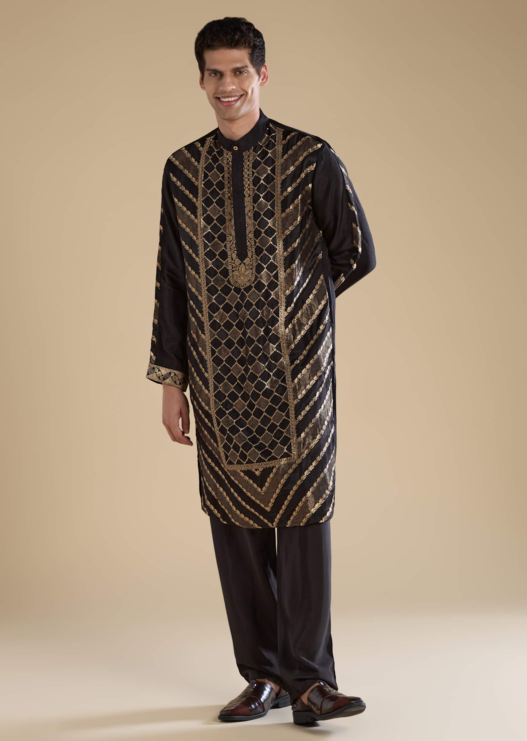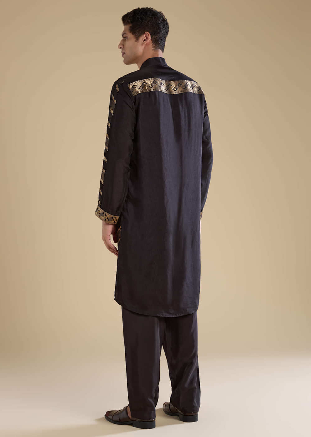 Black Handwoven Jacquard Silk Mens Kurta Pant Set