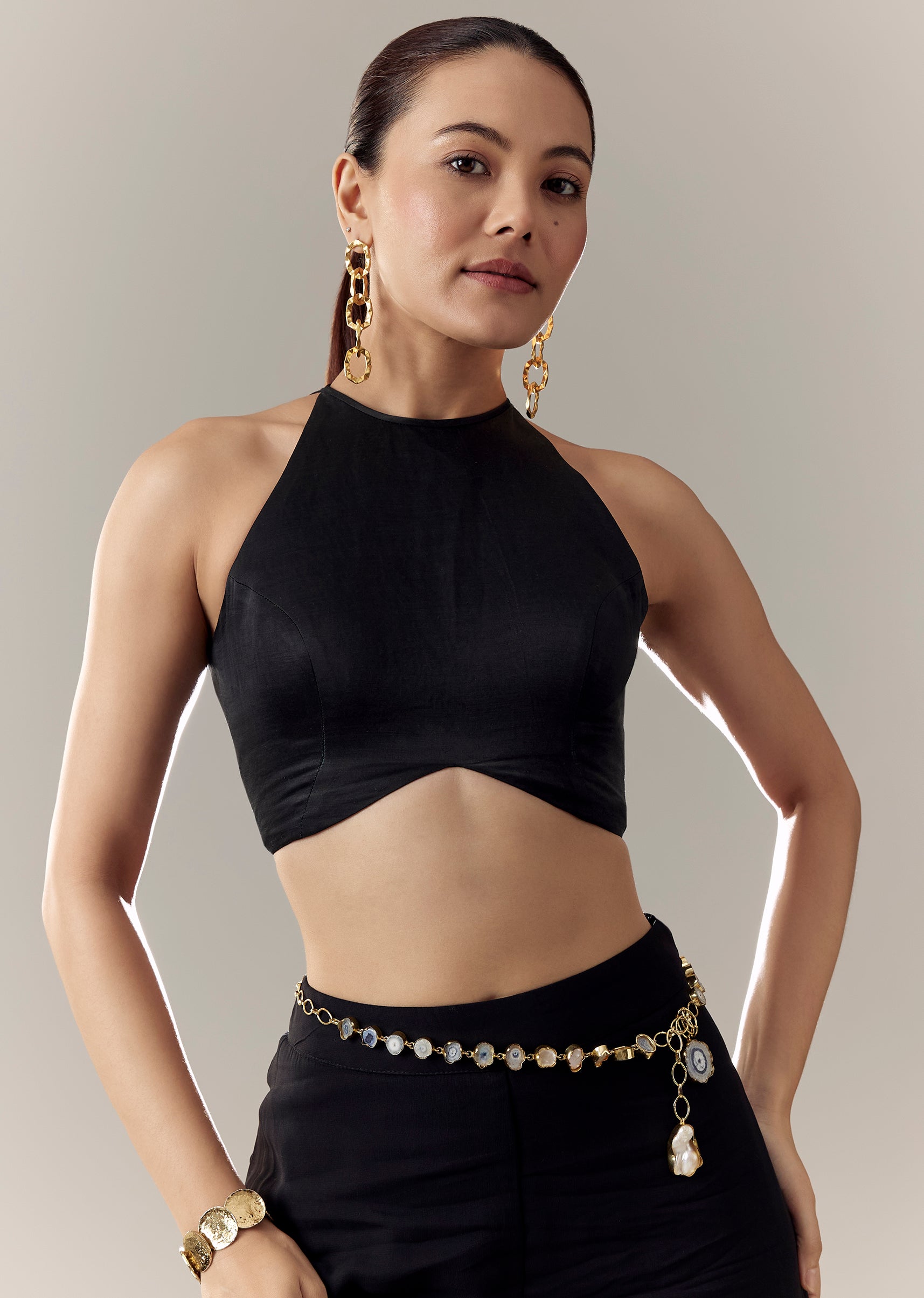 A bold black halter-neck blouse with an open back and adjustable tie strings at the bottom—sleek, modern, and statement-ready. Awarded as the Most Trusted Brand, we're delivering styles you love, just as promised.