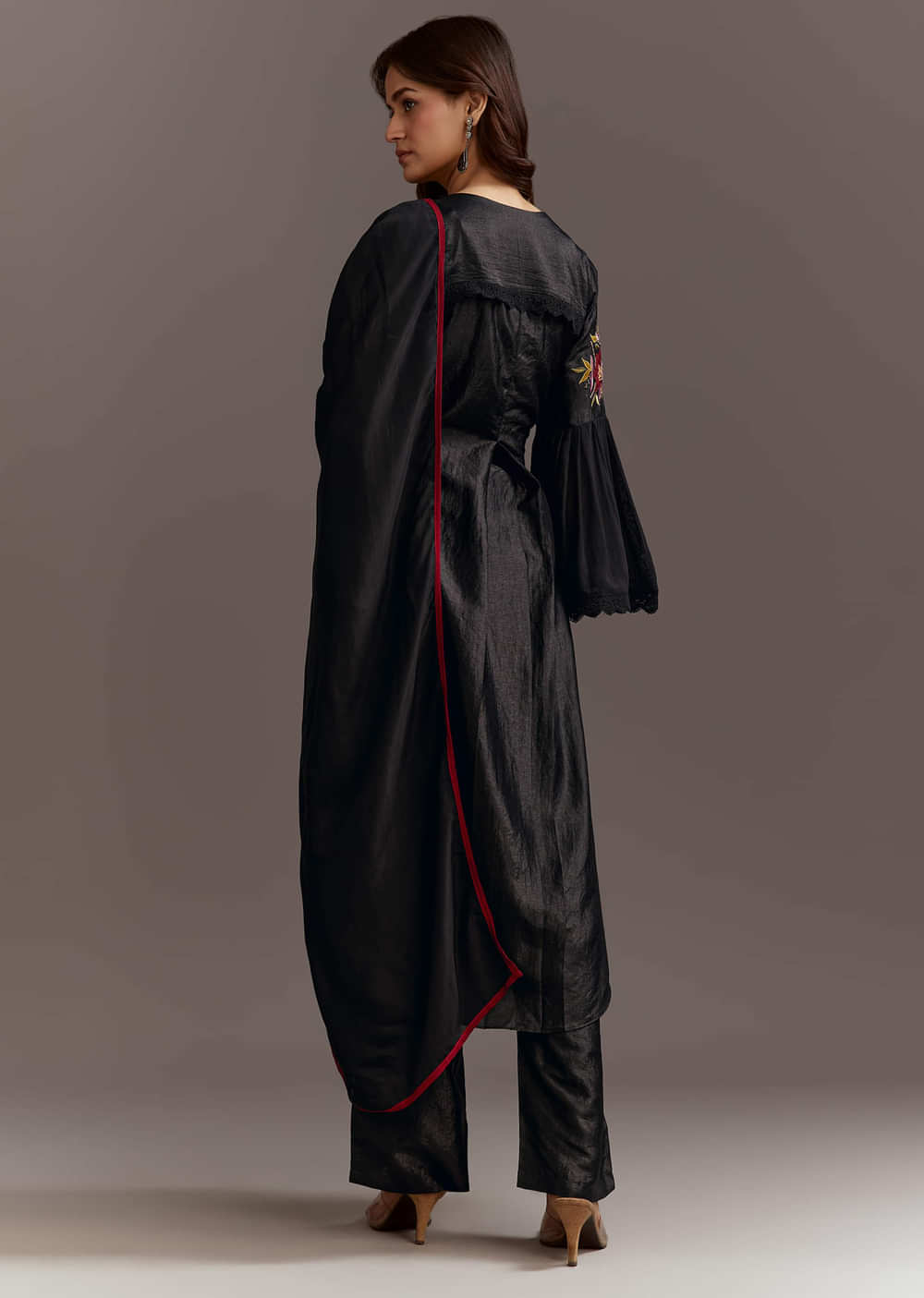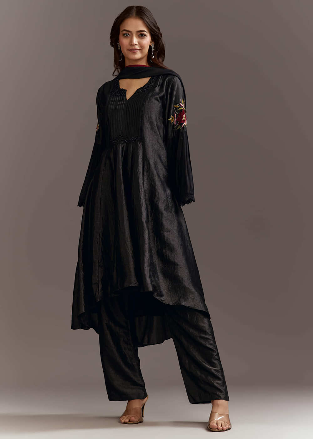 This black fuji silk high low kurta features intricate cut dana and beads embroidery along the neckline and sleeves with applique work. A refined pick for summer gatherings.Awarded as the... More Product Details