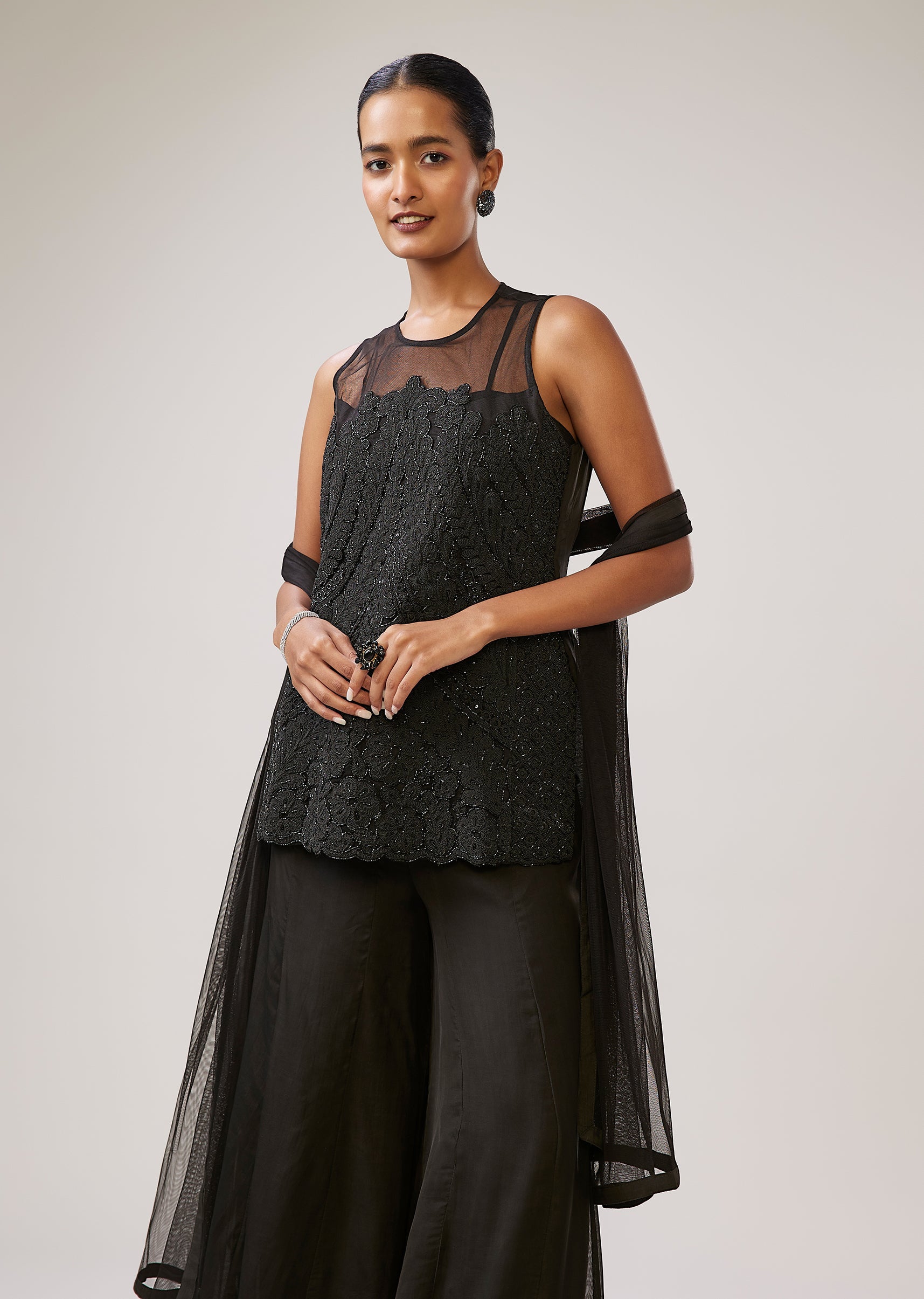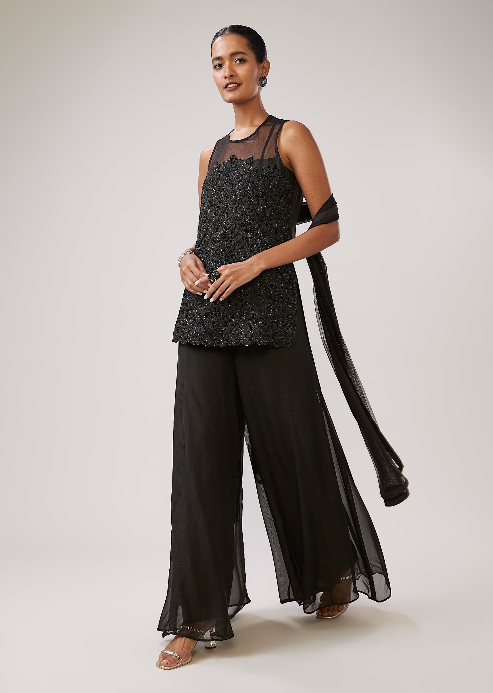 Sleek and festive, this black net palazzo set features thread and cut dana detailing for subtle glamour. Styled with an illusion neckline and sleeveless silhouette, it comes paired with layered... More Product Details
