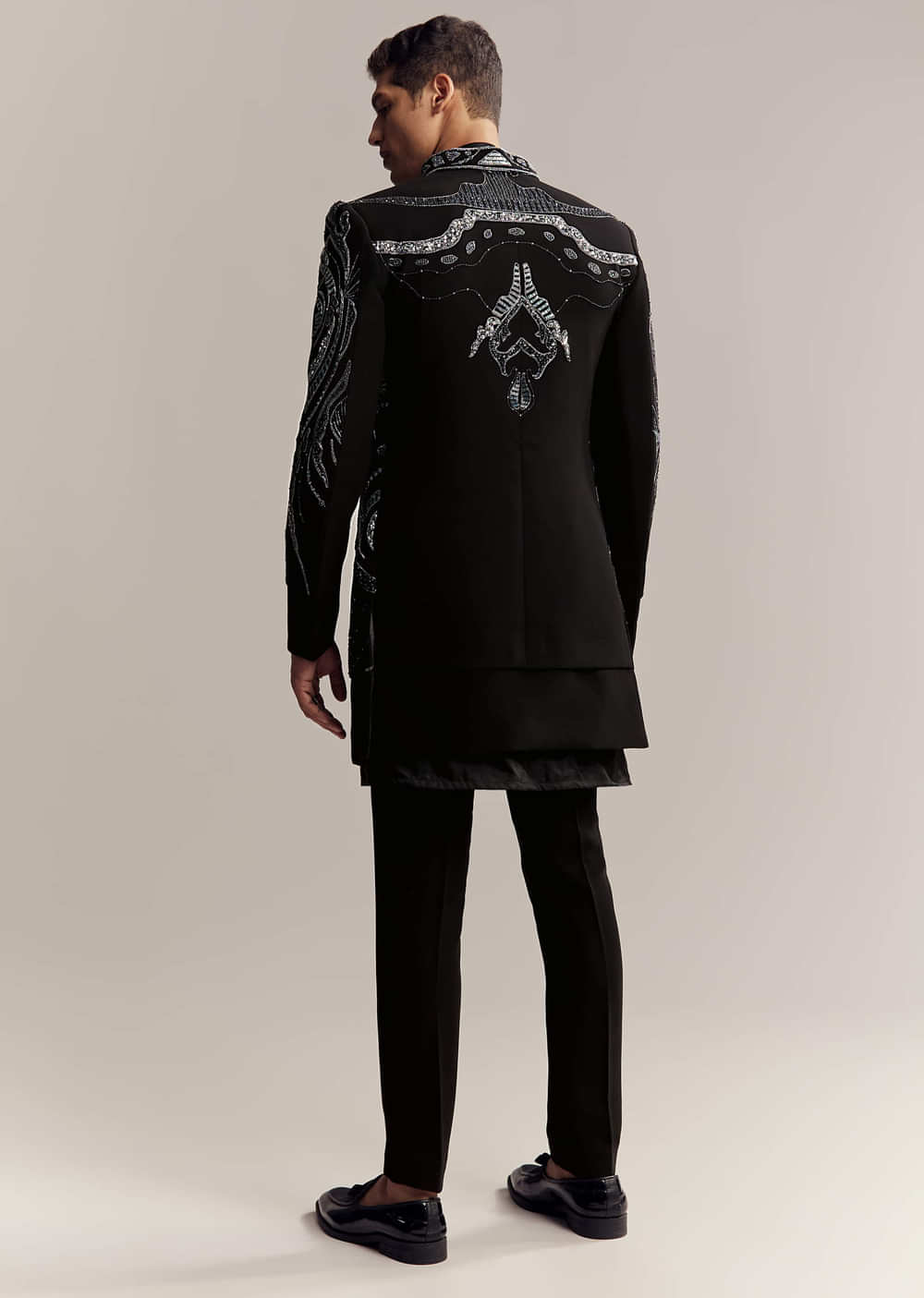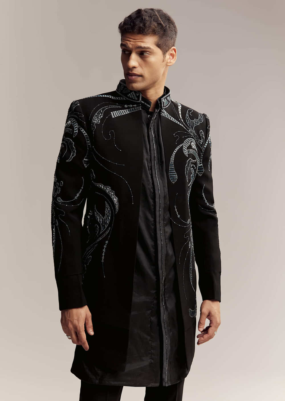Black Imported Organza Indo Western For Men With Heavy Embroidery